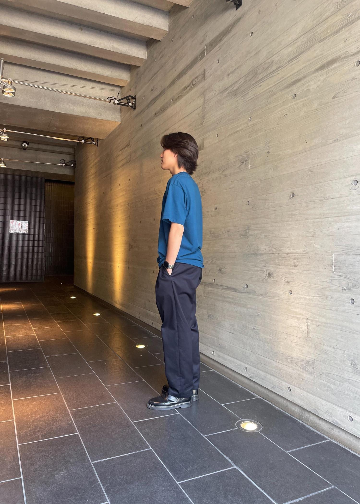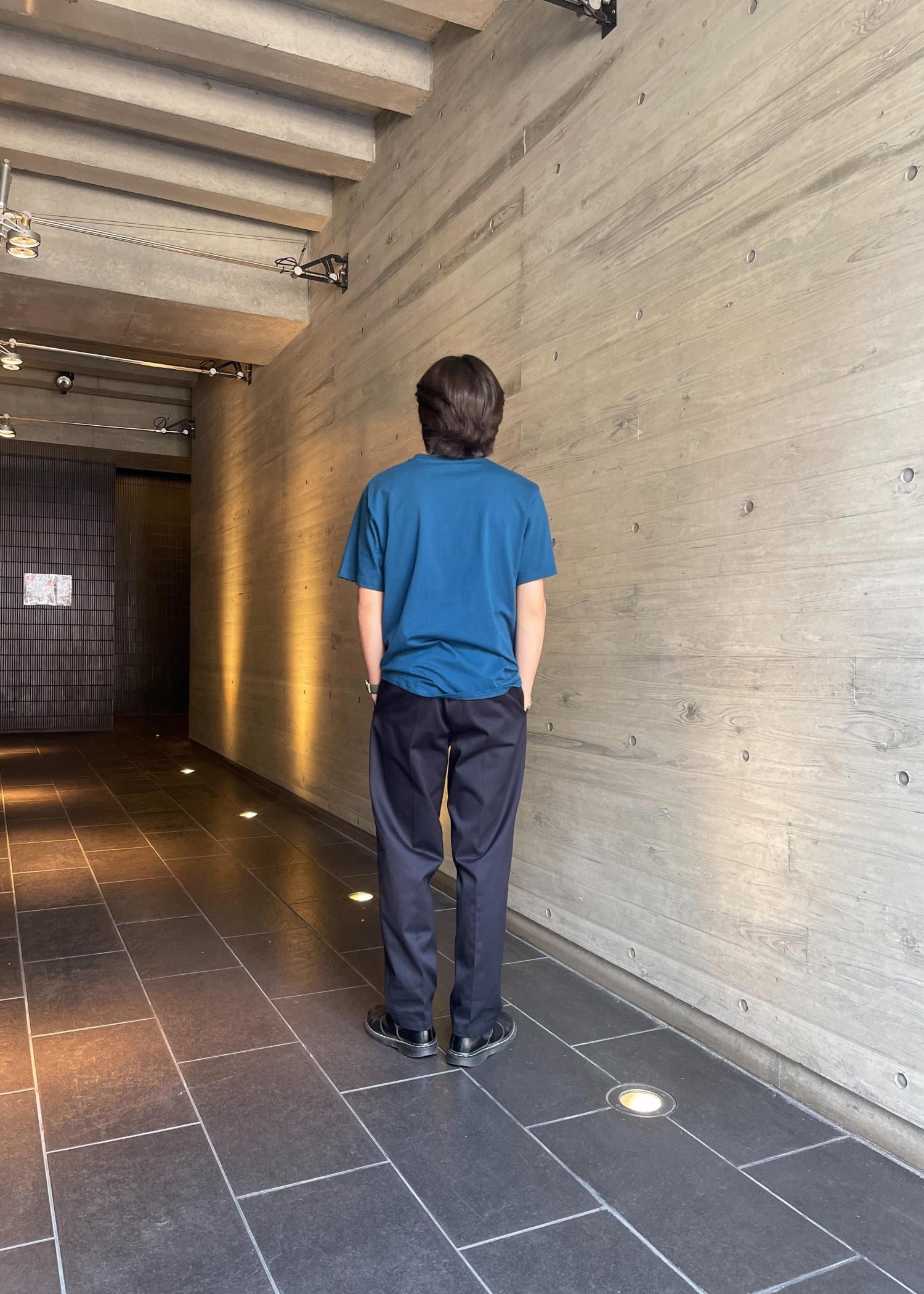今回は、同色でネイビーのスラックスを使ったスタイリングですが、流行りのグレーにブルーの組み合わせも最高