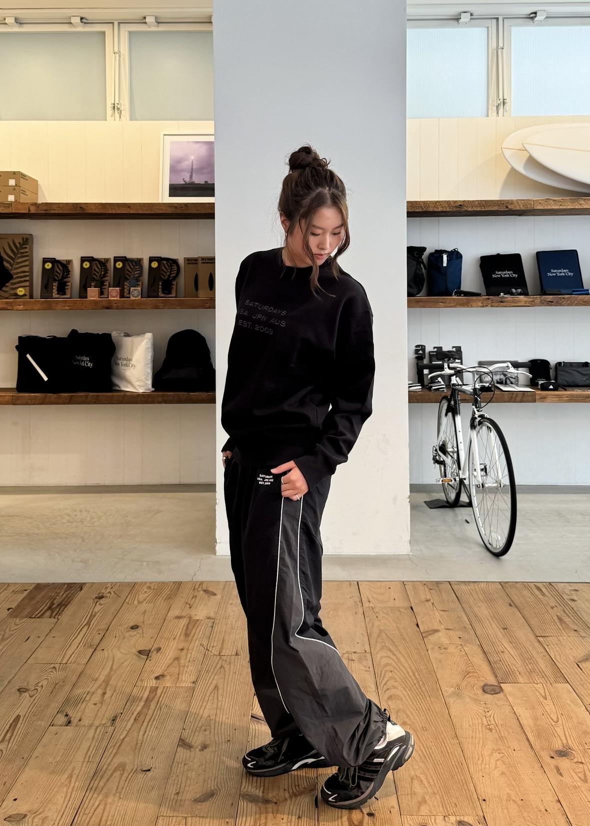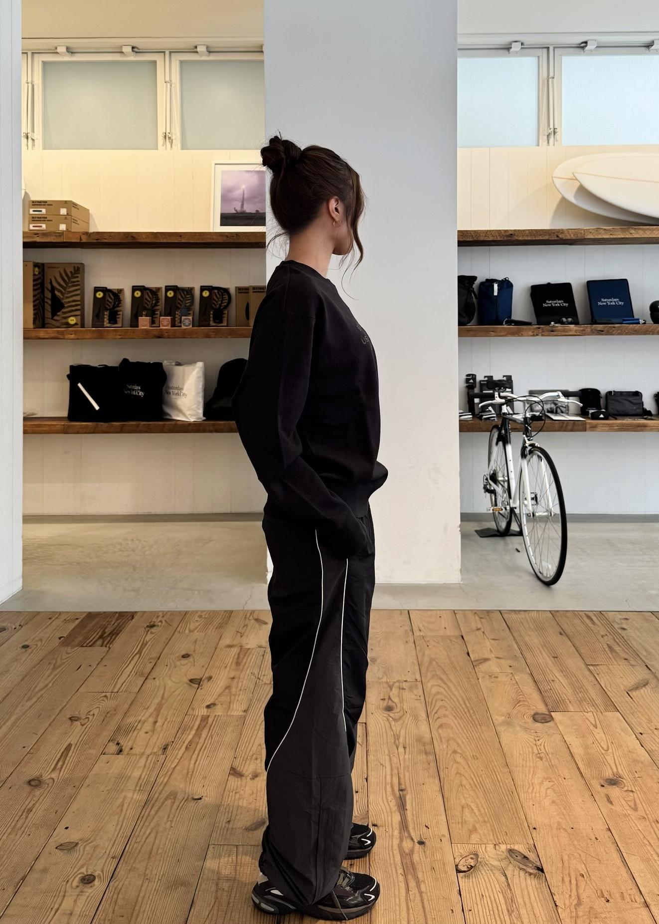 黒ベースだから何にでも合わせやすいトップスのスウェット!!パンツはナイロンパンツでストリートっぽく、カジュアルにスタイリングしてみました。