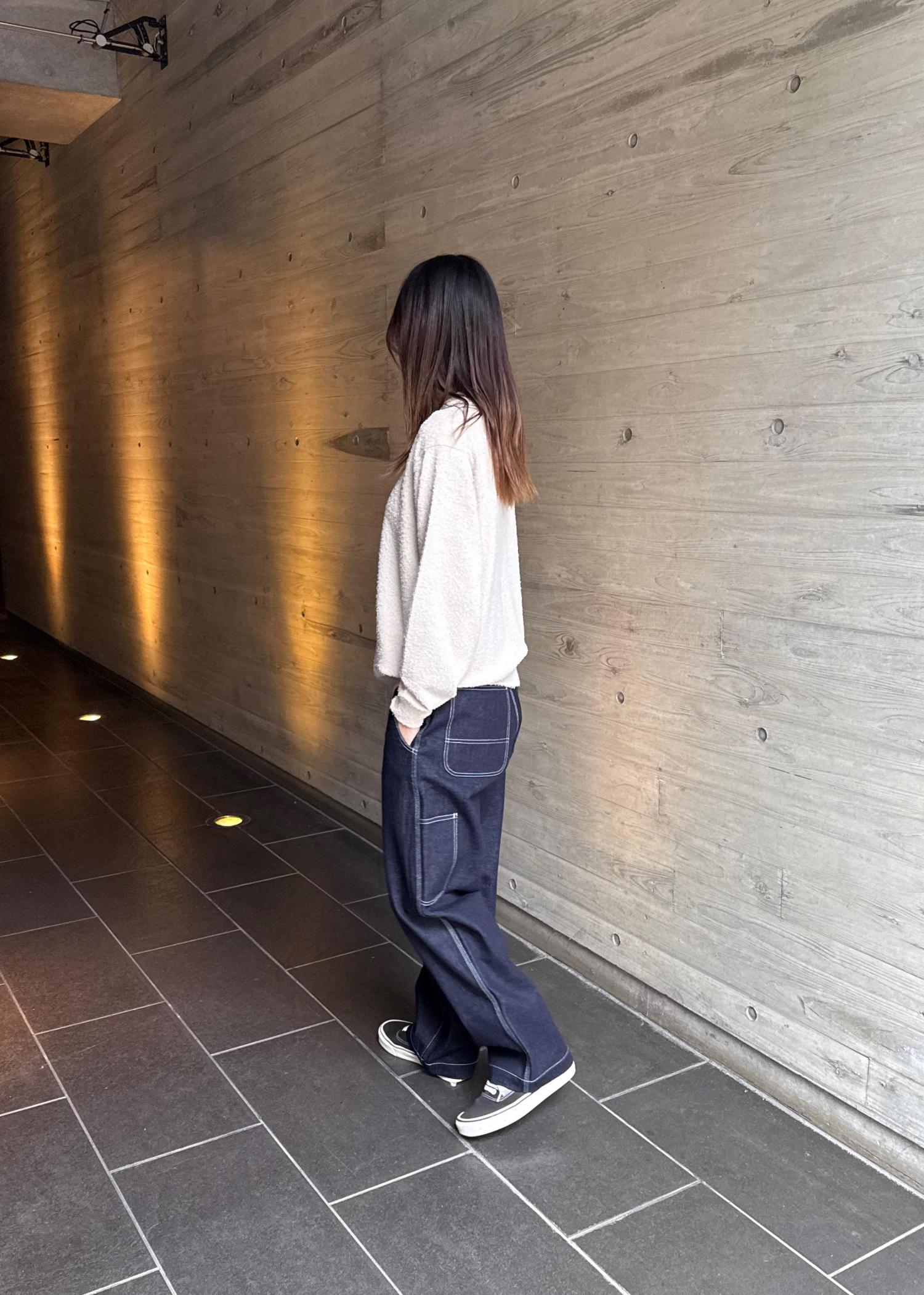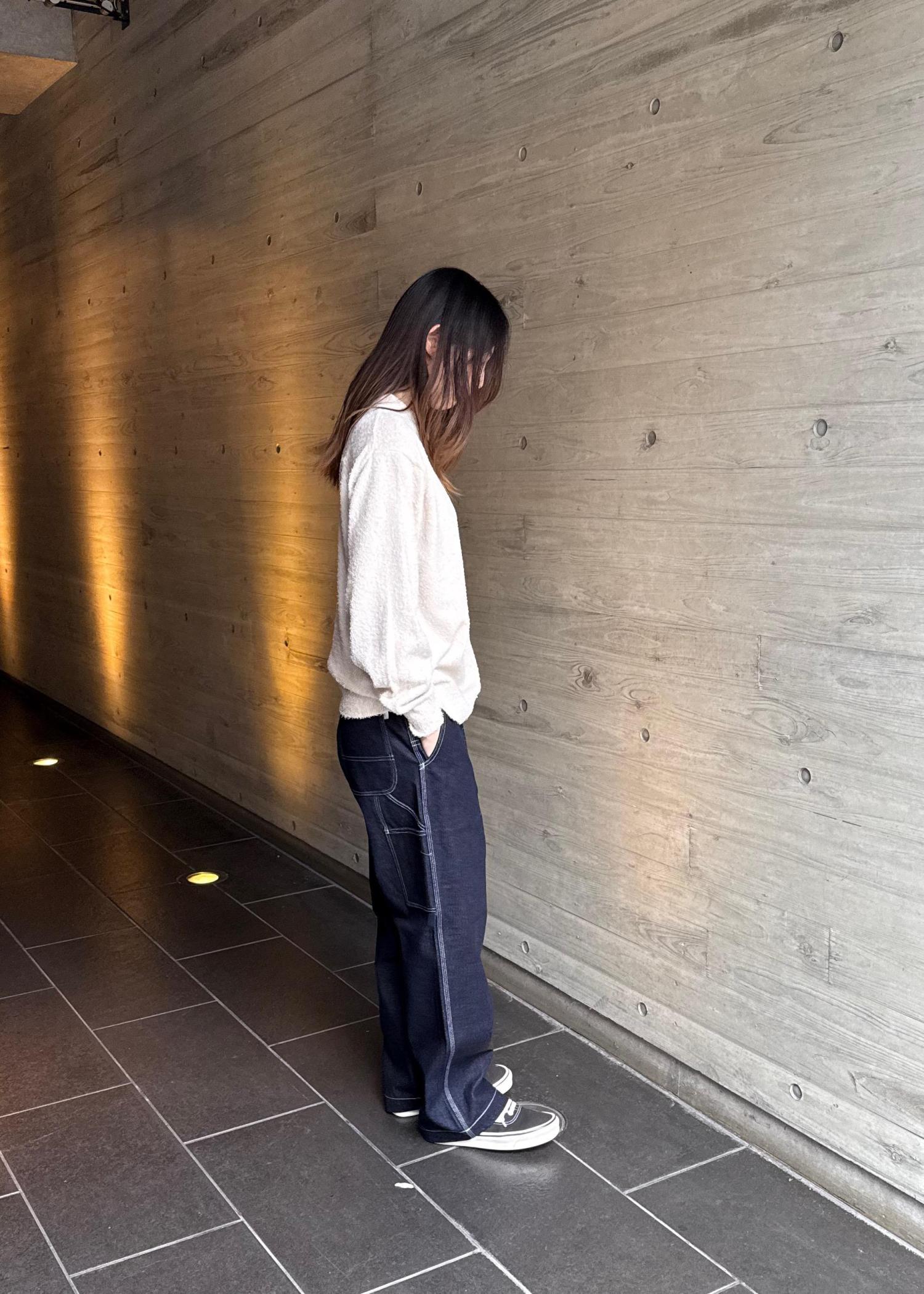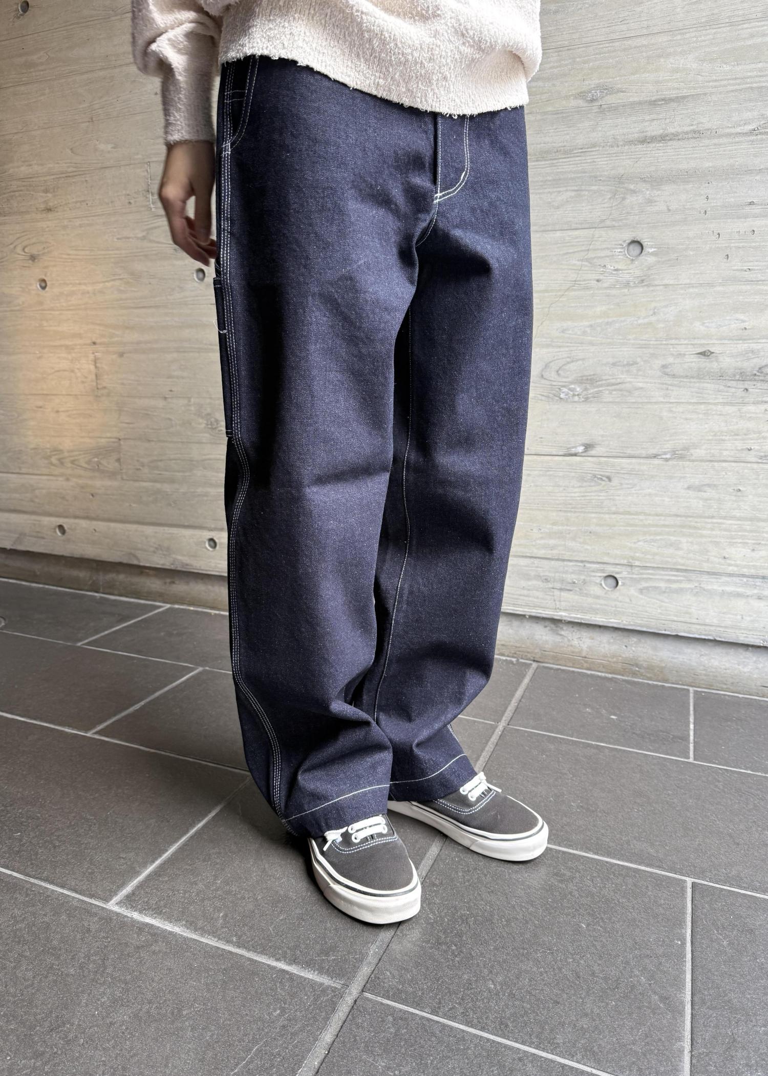 パンツはワイドストレートのペインターパンツは腰からまっすぐ落ちた綺麗なシルエットでリラックスしたサイズ感ではあるものの落ち着いたカラーとミニマルなデザインが大人のアイテムになっています。