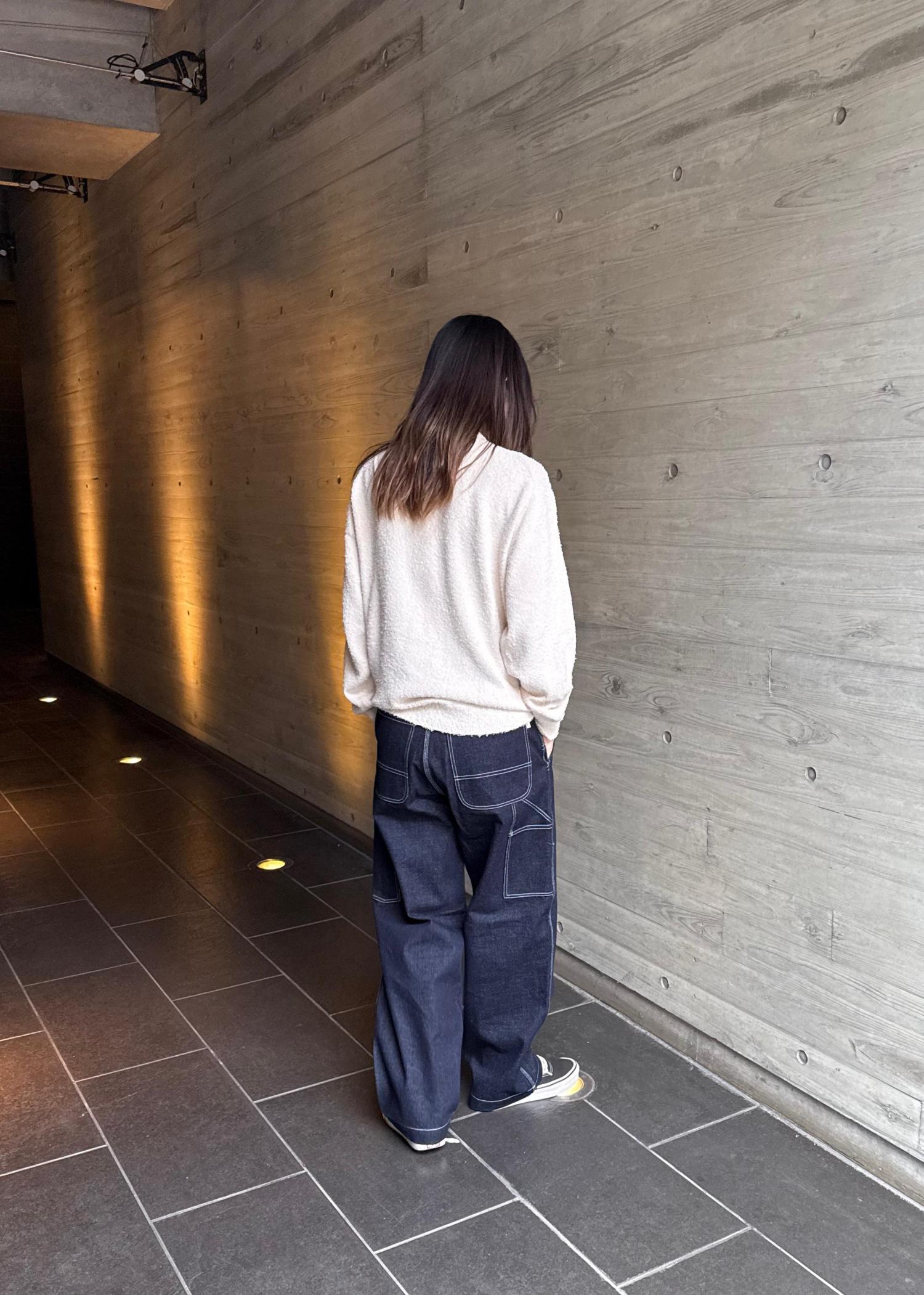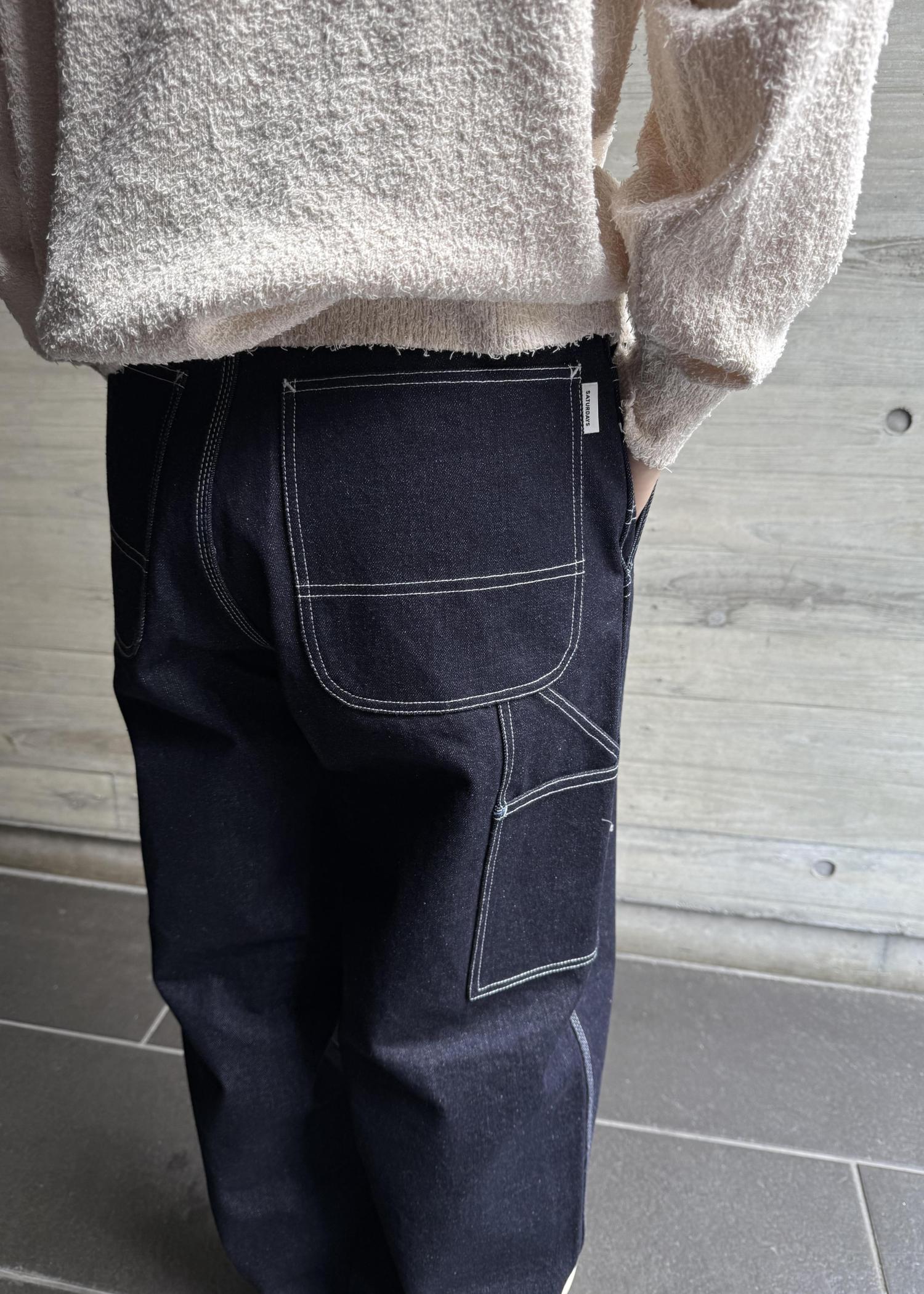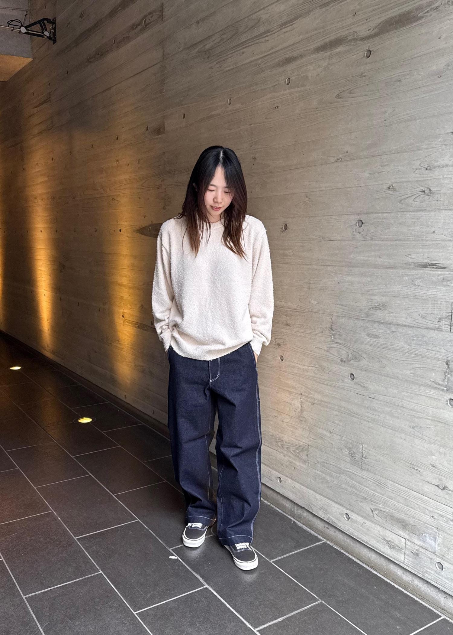 パンツはワイドストレートのペインターパンツは腰からまっすぐ落ちた綺麗なシルエットでリラックスしたサイズ感ではあるものの落ち着いたカラーとミニマルなデザインが大人のアイテムになっています。