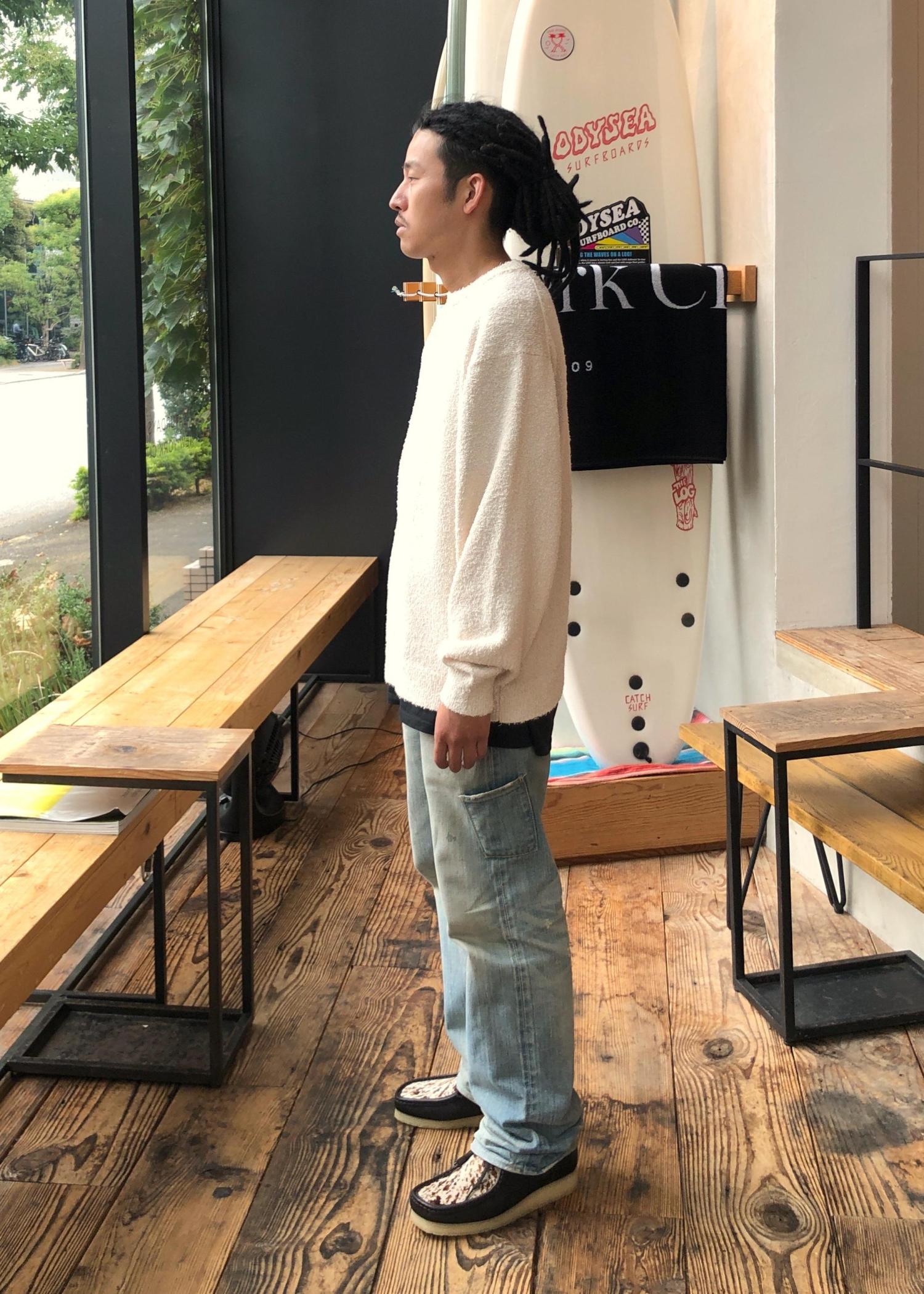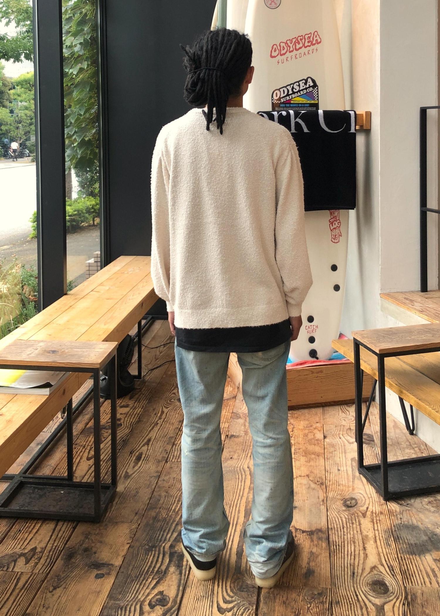 ミドルゲージの天竺で編み立て、程よく抜けたサイジングのクルーネックニット。シンプルですが毛足が長いデザインです。