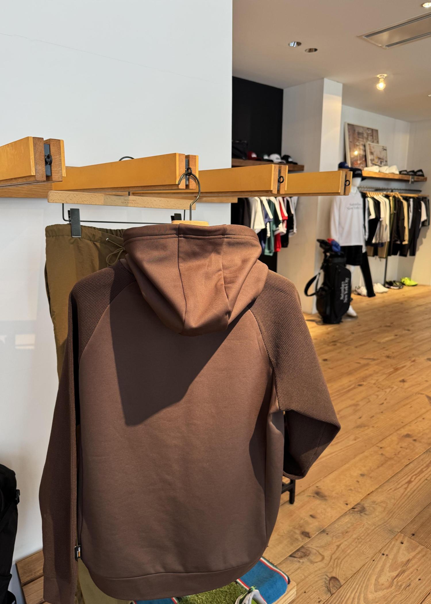 ゴルフウェア仕様のフーディは、保温性に優れながらストレッチ性や動きやすさも兼ね備えた機能的な一枚。