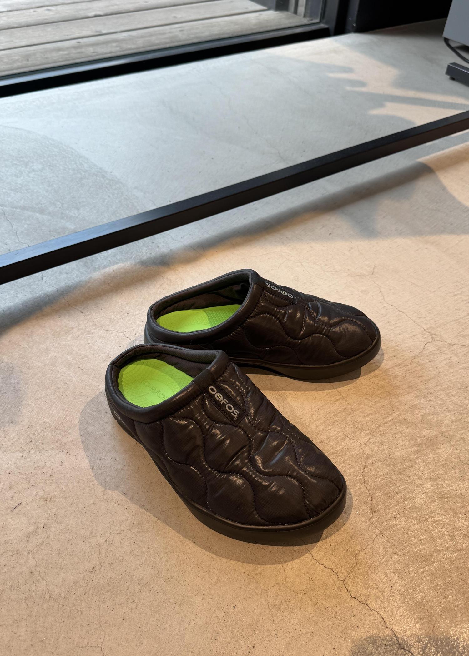 足元はOOFOSのシューズで、軽く快適な履き心地をプラス!