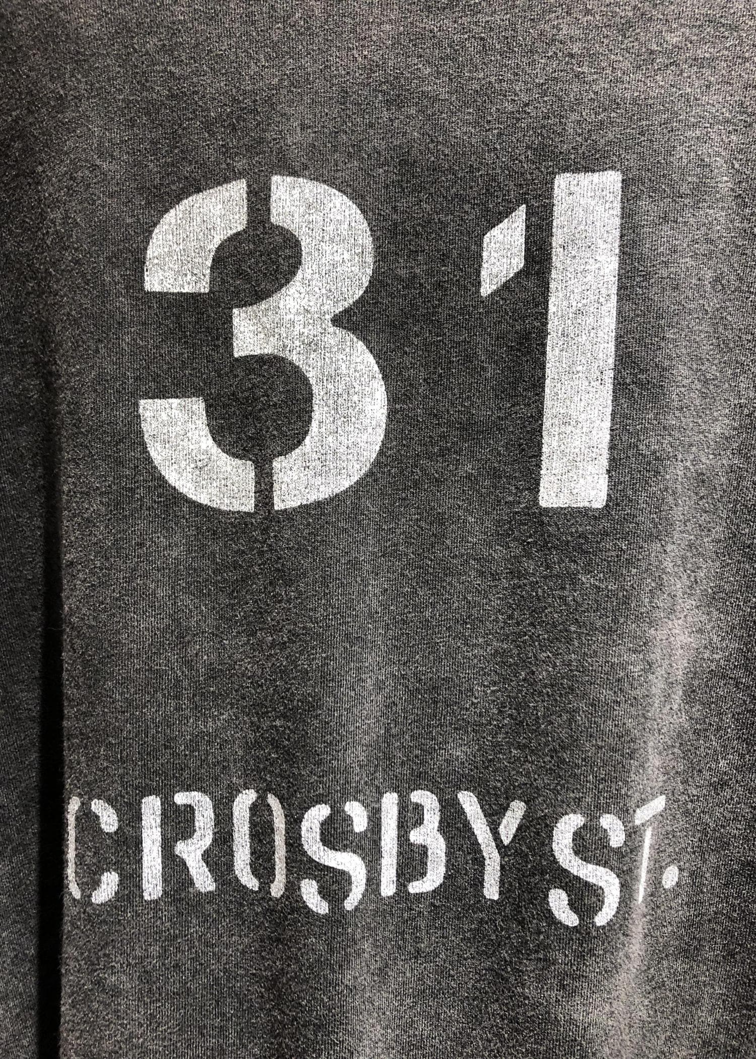 ステンシル風のプリントとケミカルウォッシュがヴィンテージライクな表情に仕上がっています。