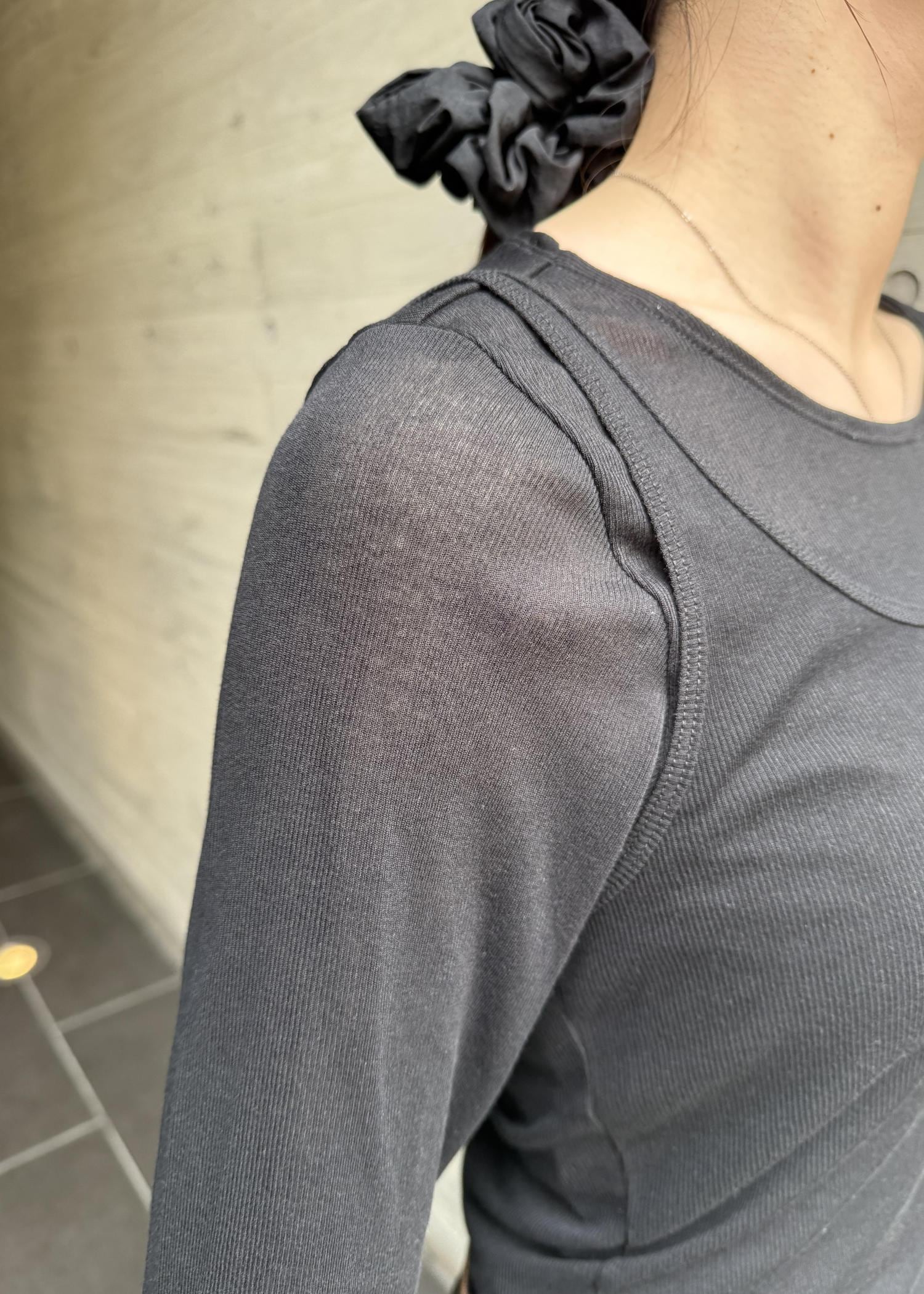 ロンTシャツとキャミソールを重ねて着たようにドッキングされたデザインです。2WAYで着れます。