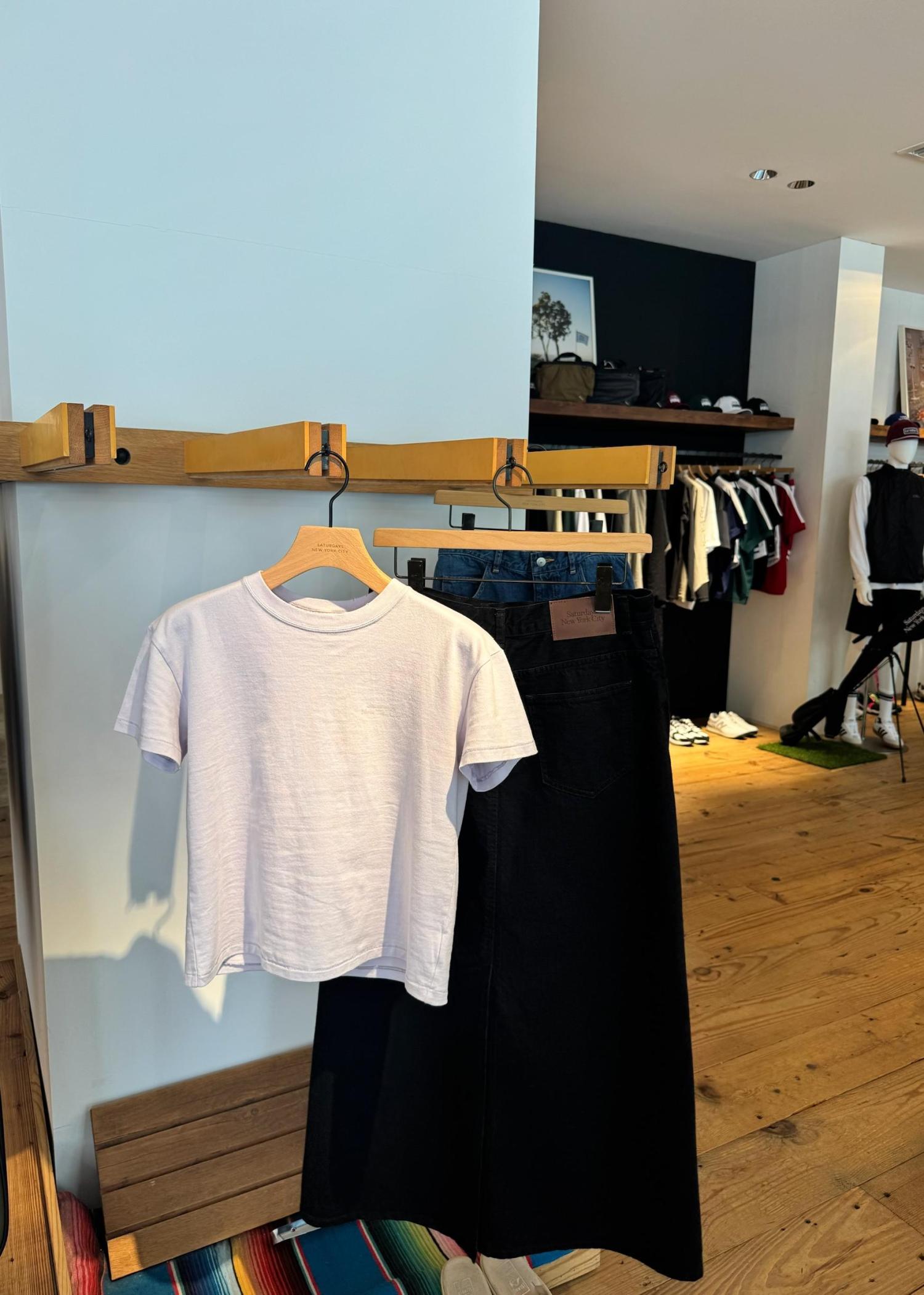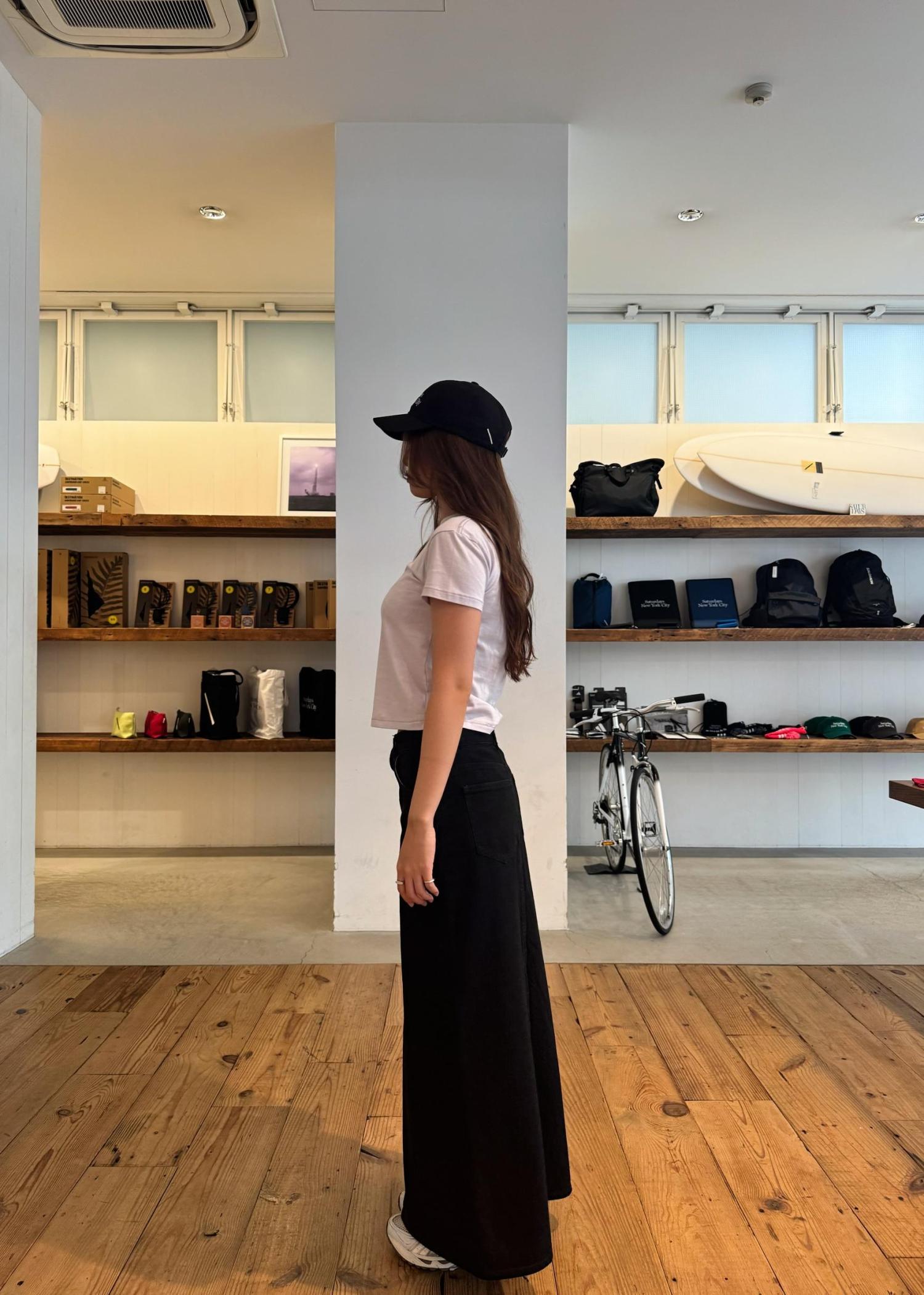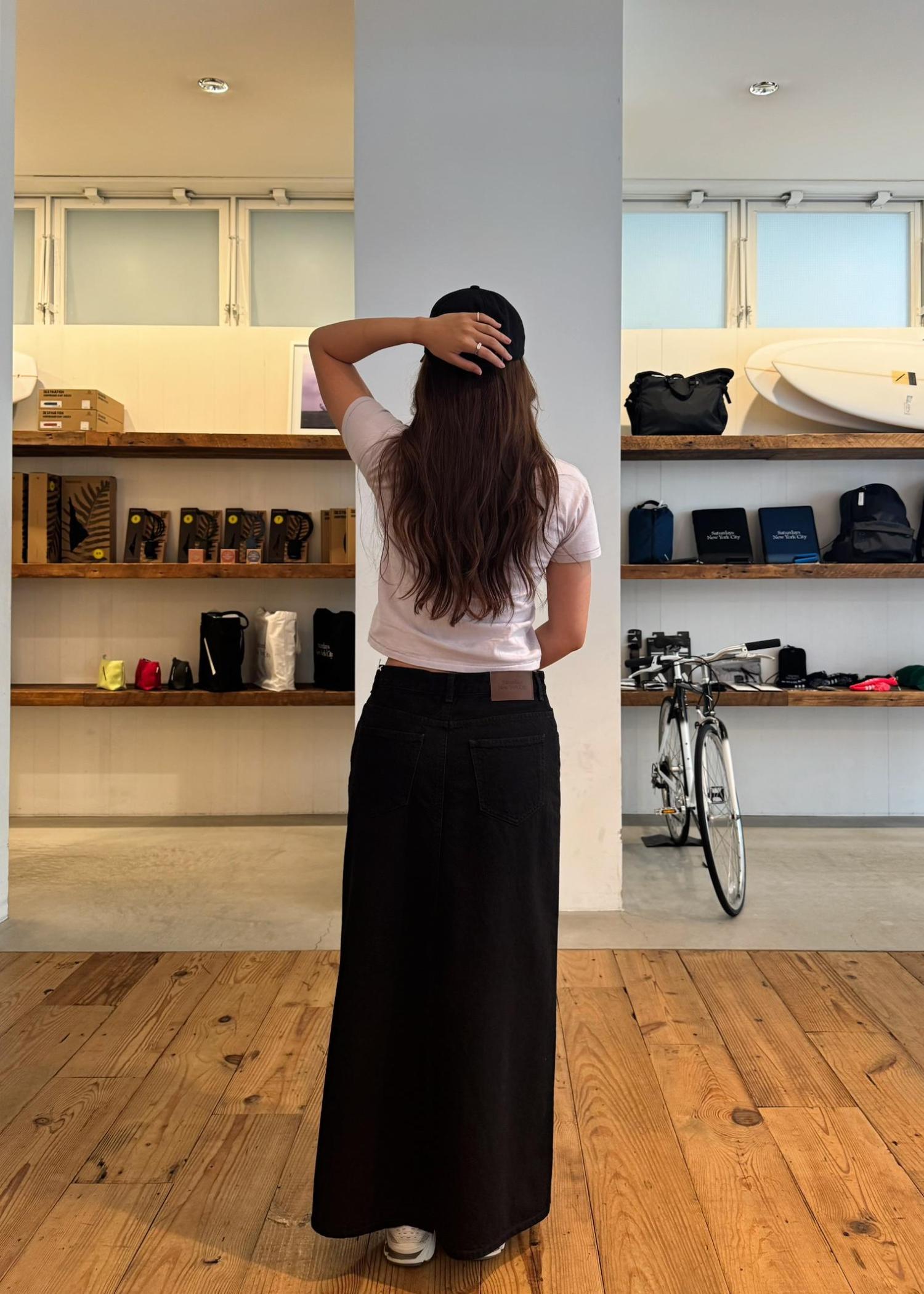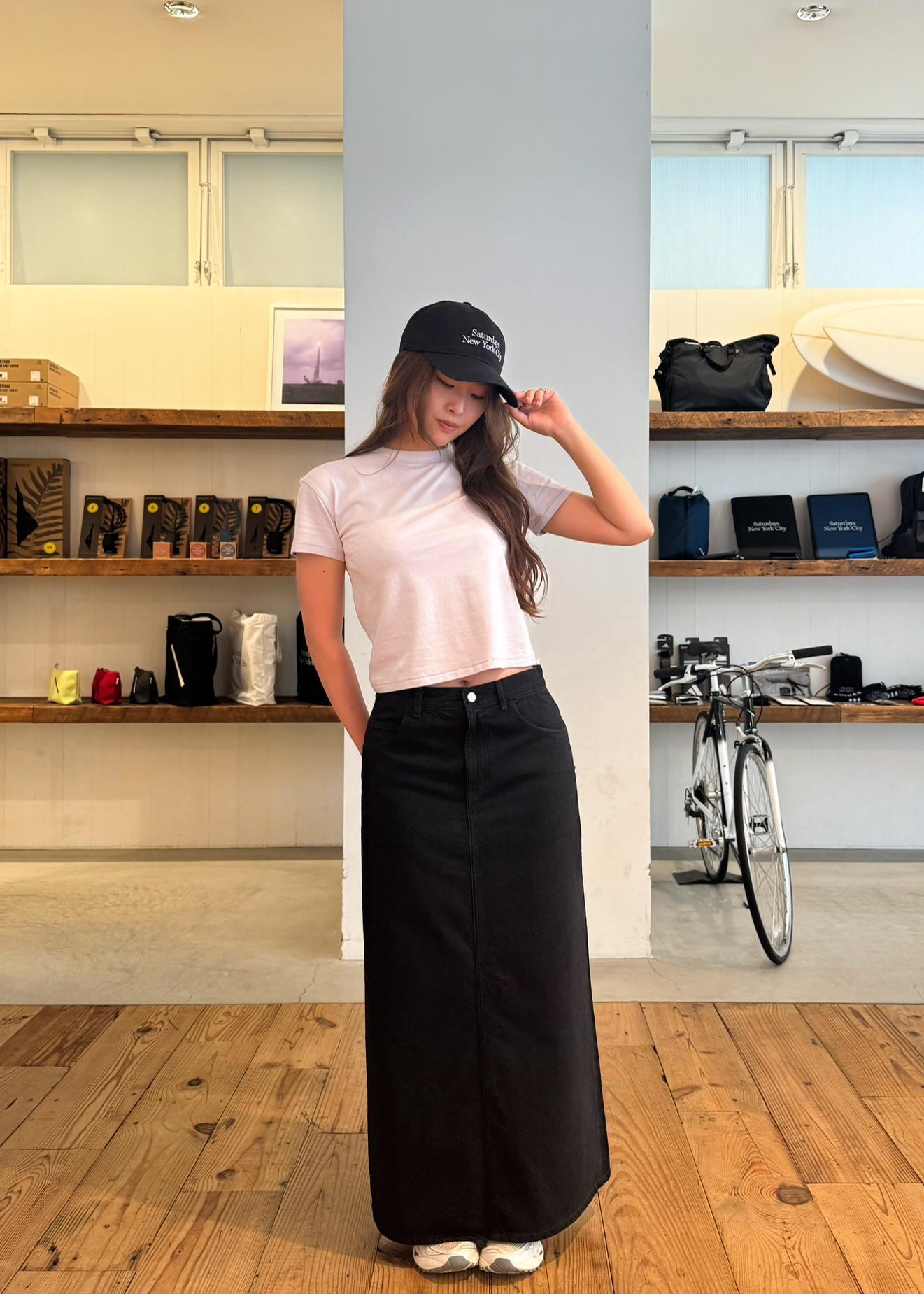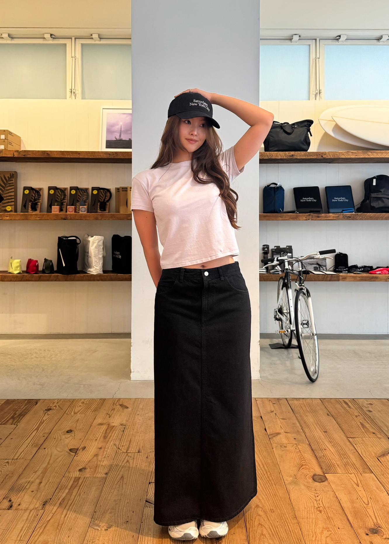 シンプルなミニTシャツとブラックのロングデニムスカートを合わせた、レディースらしさ溢れるスタイル!