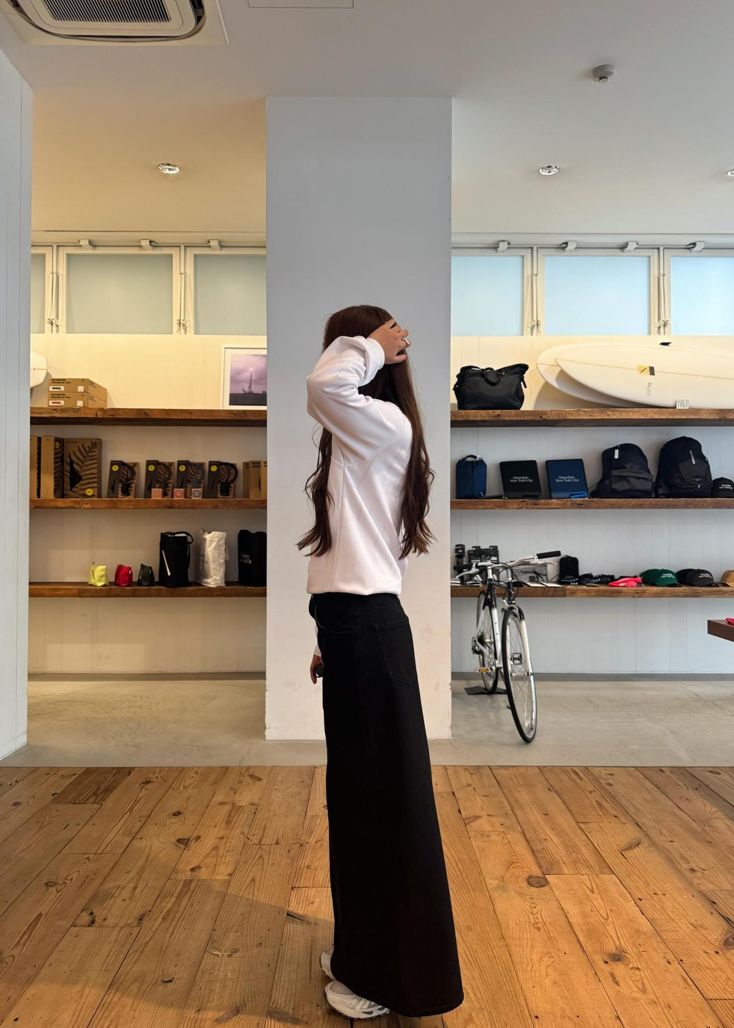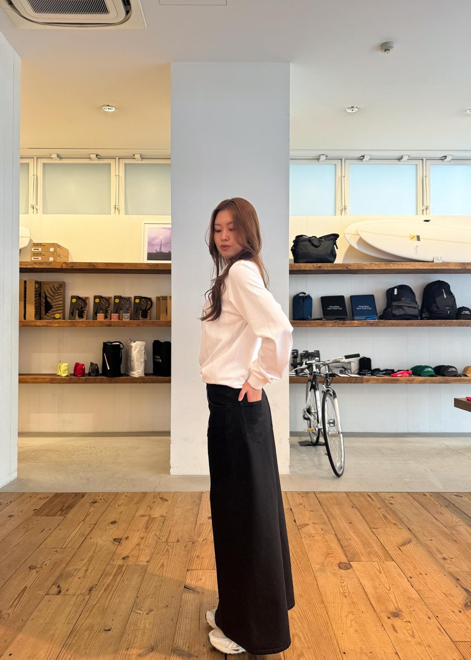 ブラックのマキシ丈スカートで組み合わせて女性らしさもあり、流行を捉えたコーディネートにしました。