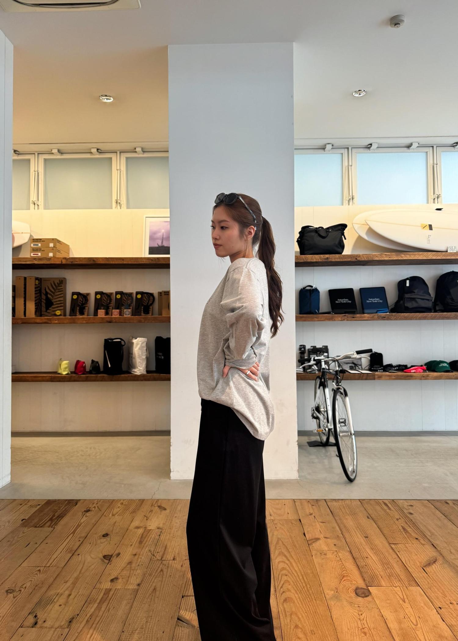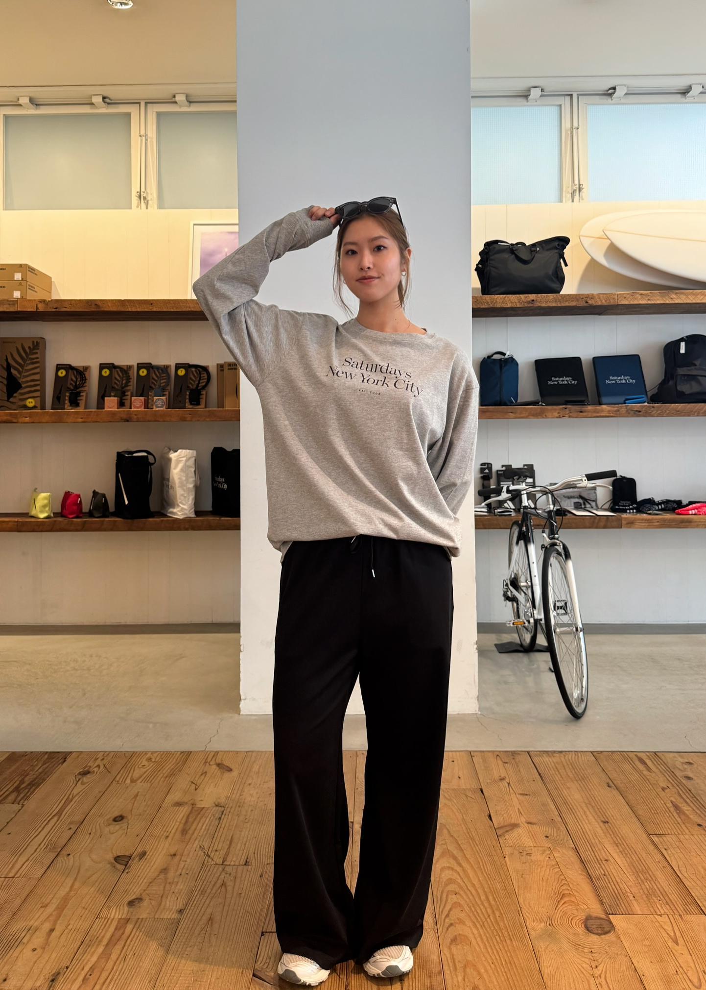 パンツは肌触りのいいゆったりとしたスウェットで動きやすくて普段使いに最適です。ブラックなので全体を引き締めてくれて、ラフなのにスタイリッシュにまとまります!
