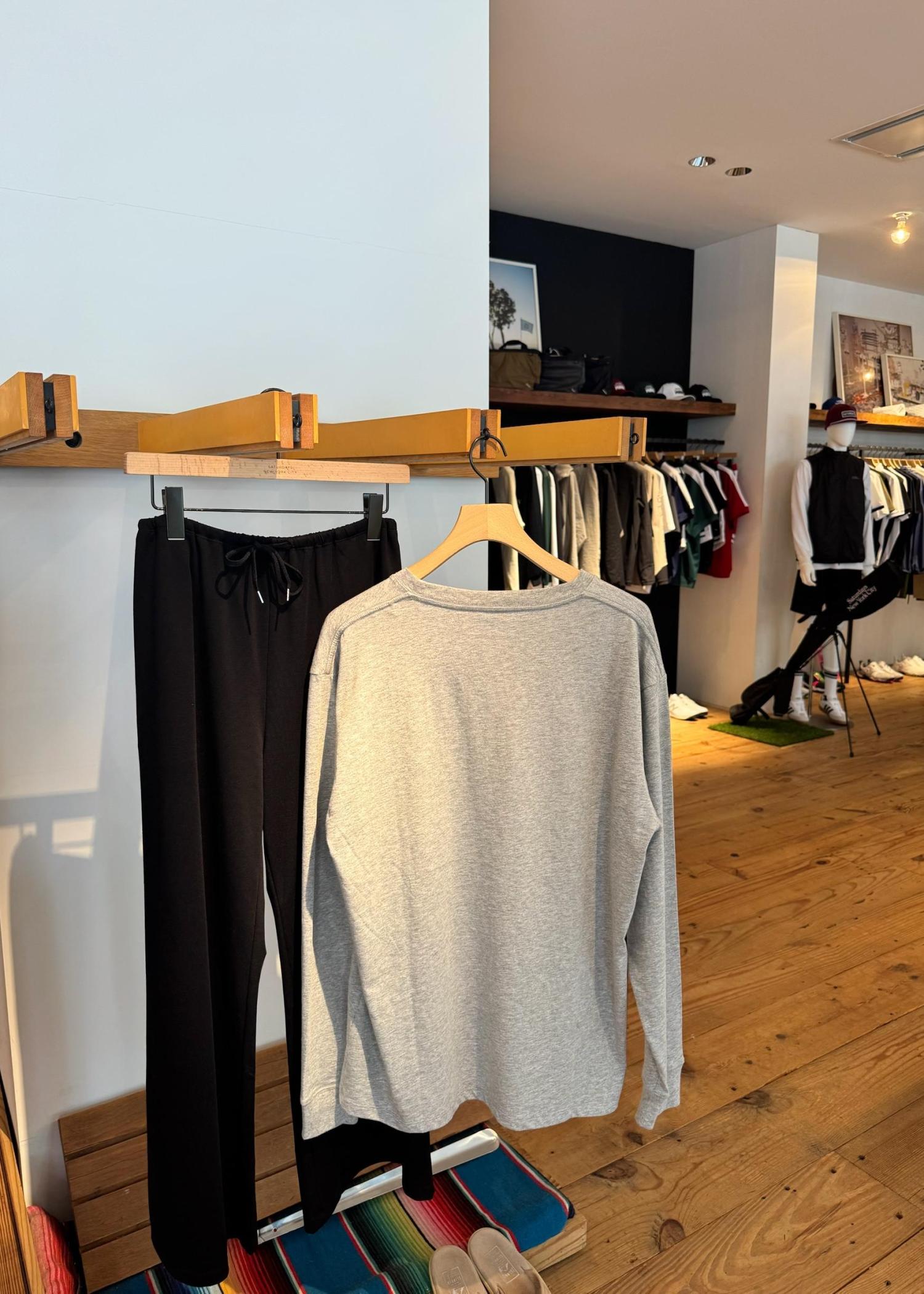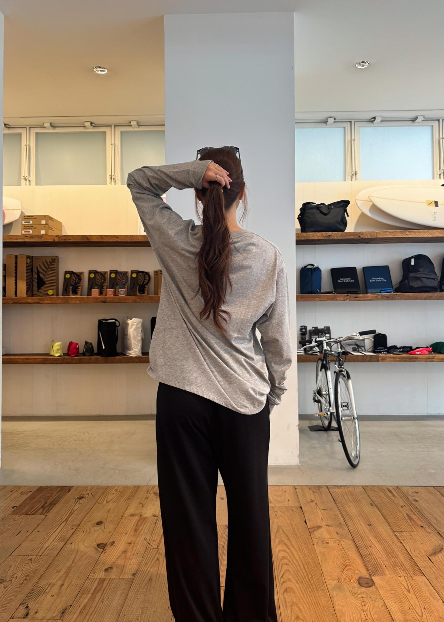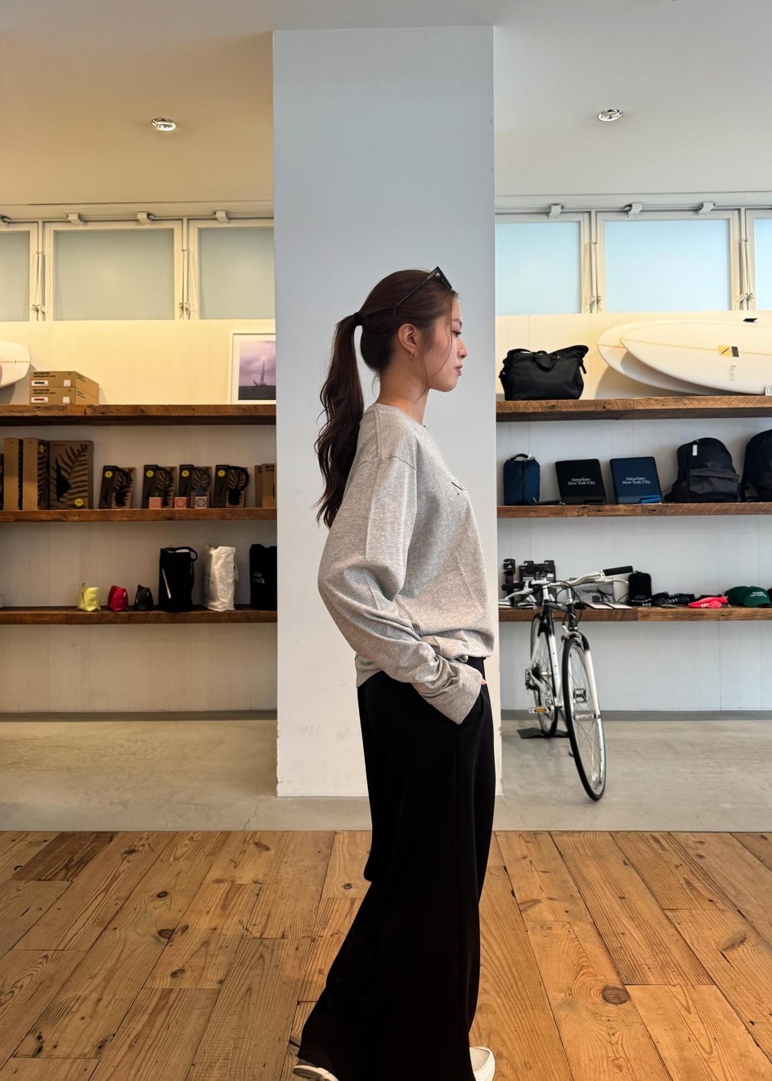 ブランドロゴが入ったシンプルなロンTは、柔らかいグレーが大人っぽく落ち着いた雰囲気を表してくれます。