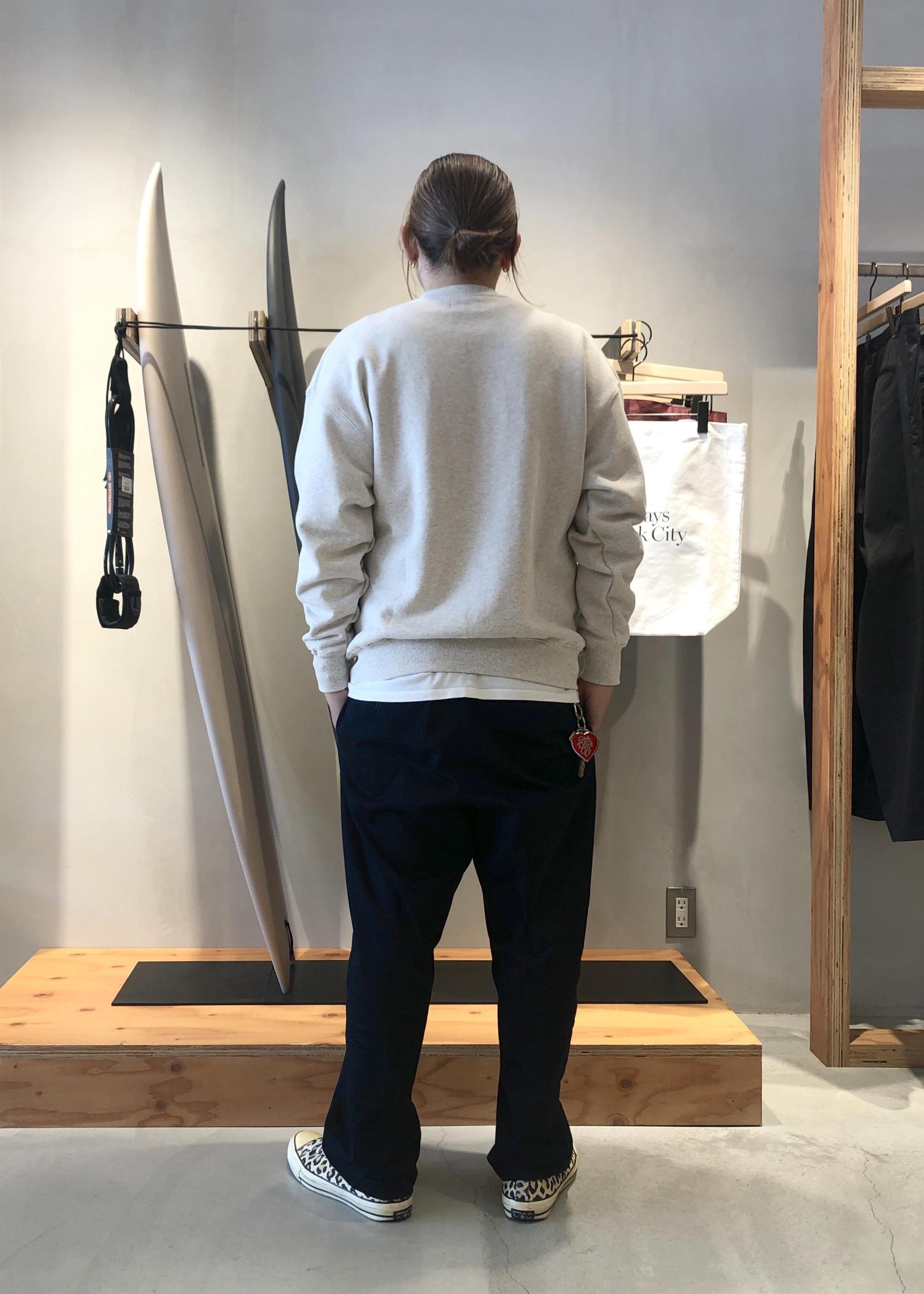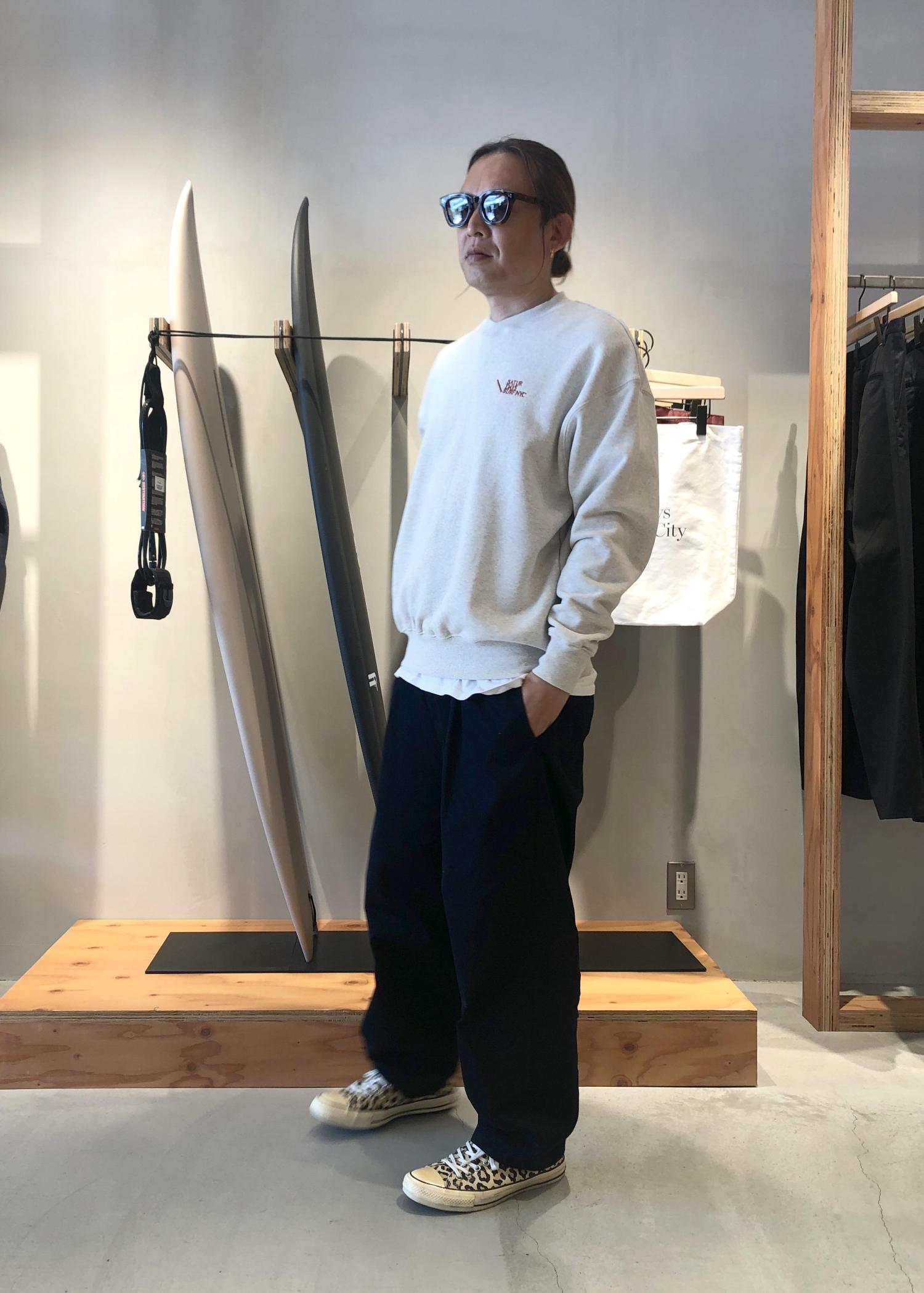 トップスは、シンプルながらも重ね襟のリブがレトロなムードを感じさせるリラックスシルエットのスウェットです。 左胸の刺繍もポイントになっています。