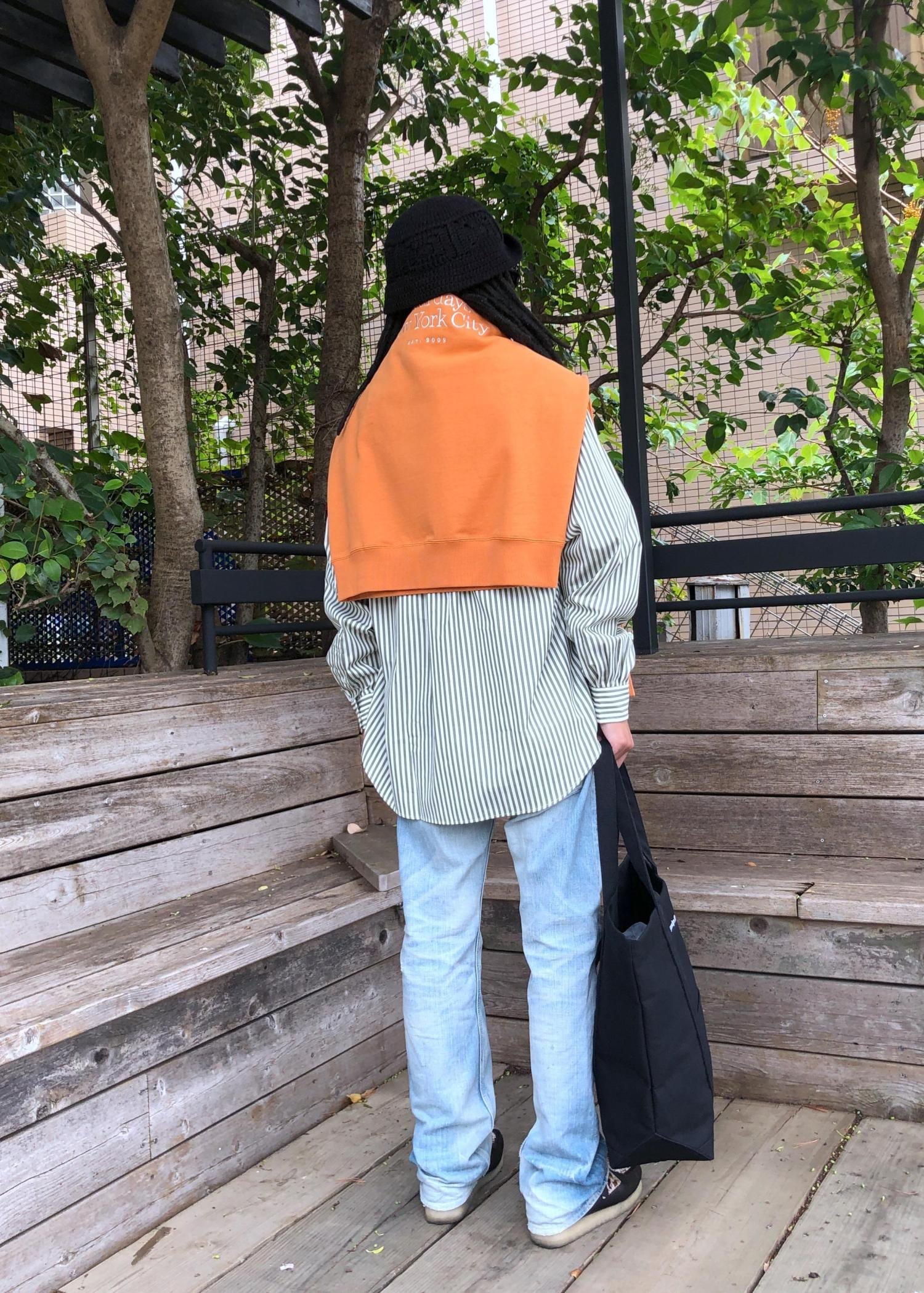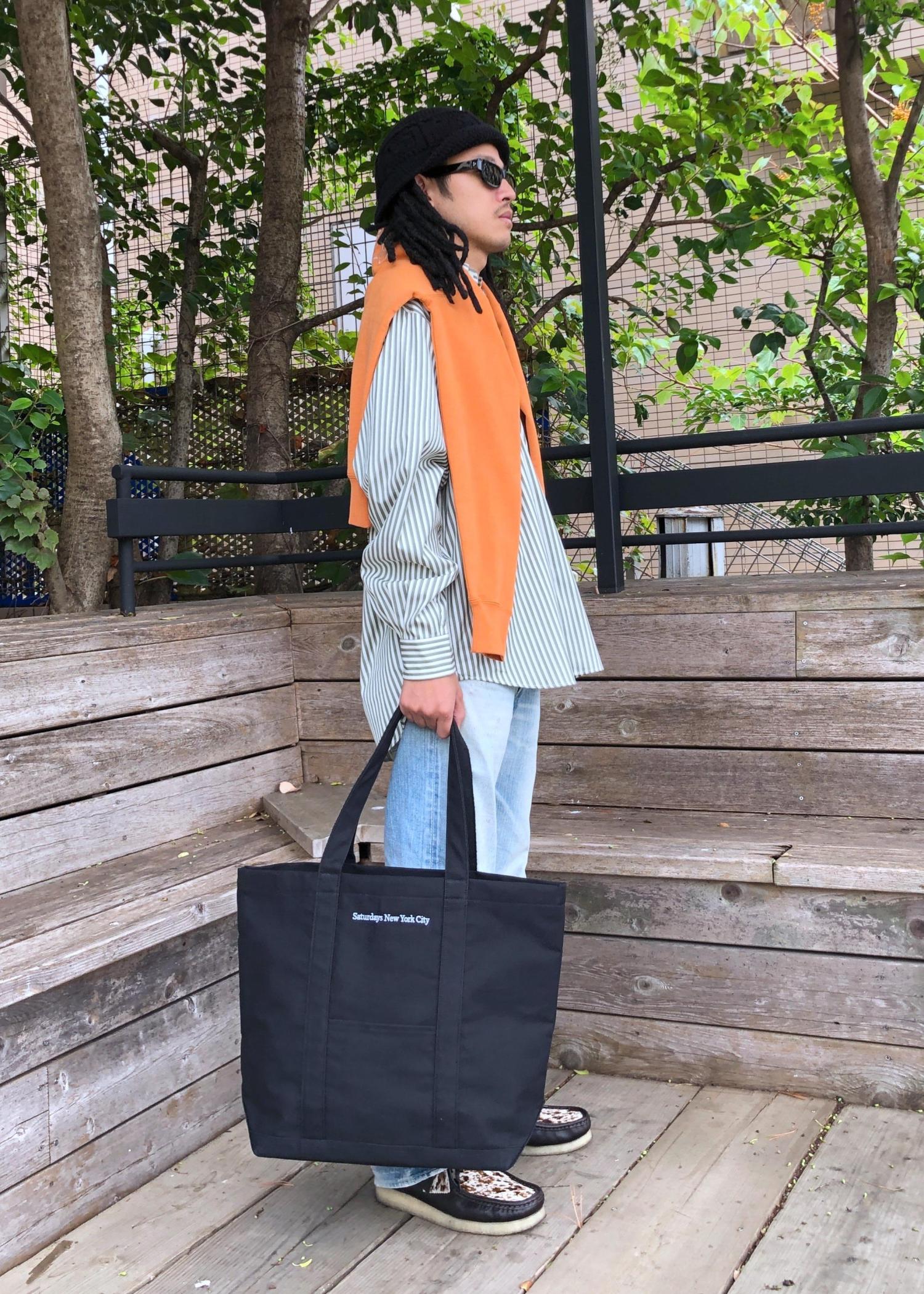 差し色が欲しかったので、首元にはSaturdays NYCのコアとなすアイテムの、Bowery Miller Standard SweatshirtをON。