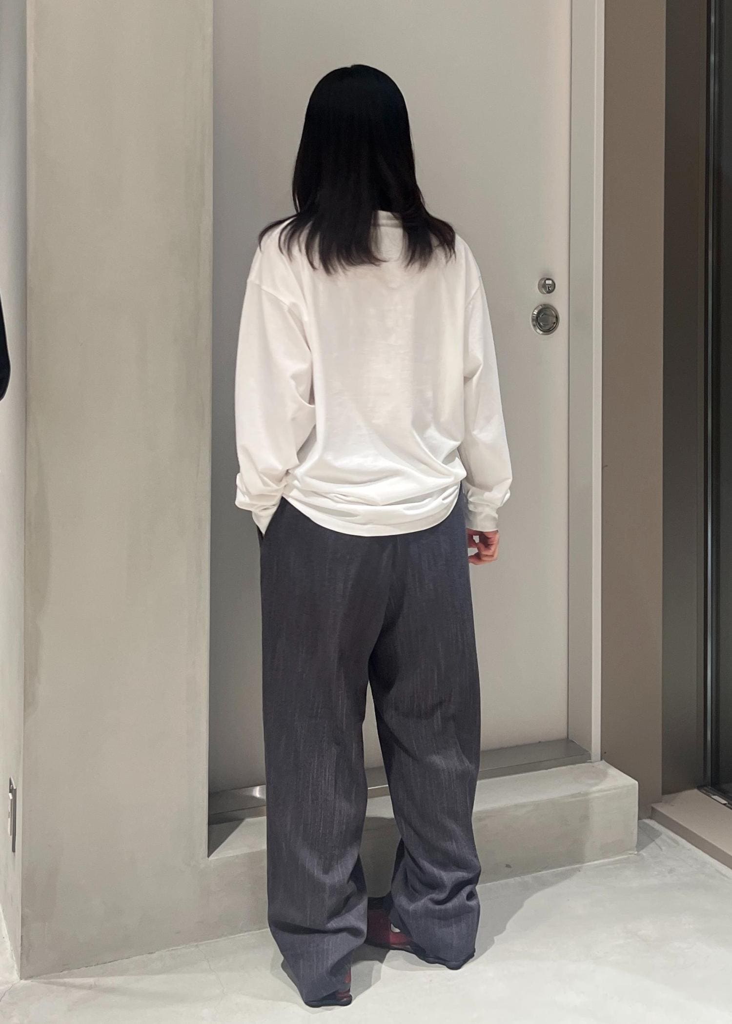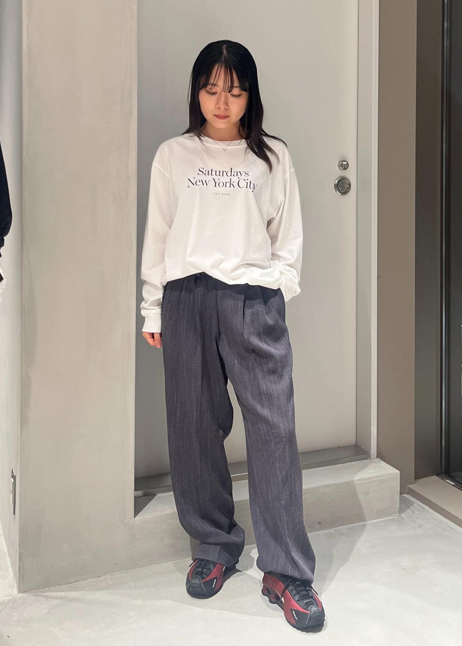 シンプルなロゴのロンTと、スポーティーなシューズを合わせて、外しつつカジュアルな雰囲気がお気に入り!