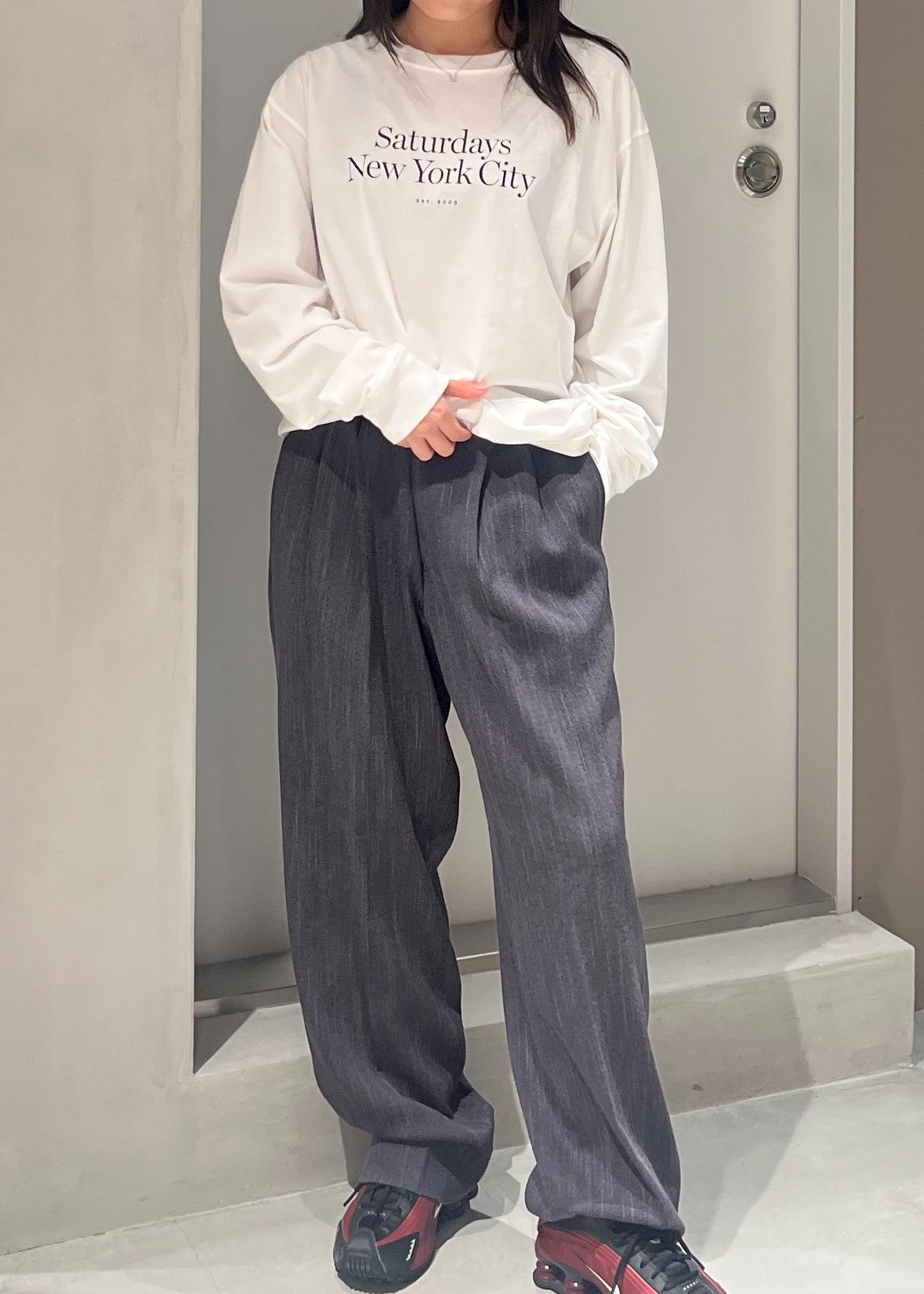 Saturdays NYCGeorge Tweed Two Tuck Pantチャコール / S¥25,300レビュー2タックから入るゆとりのある腰回りから、綺麗なラインで伸びるストレートシルエットは大人のリラックスシルエットを表現したパターンになっています。