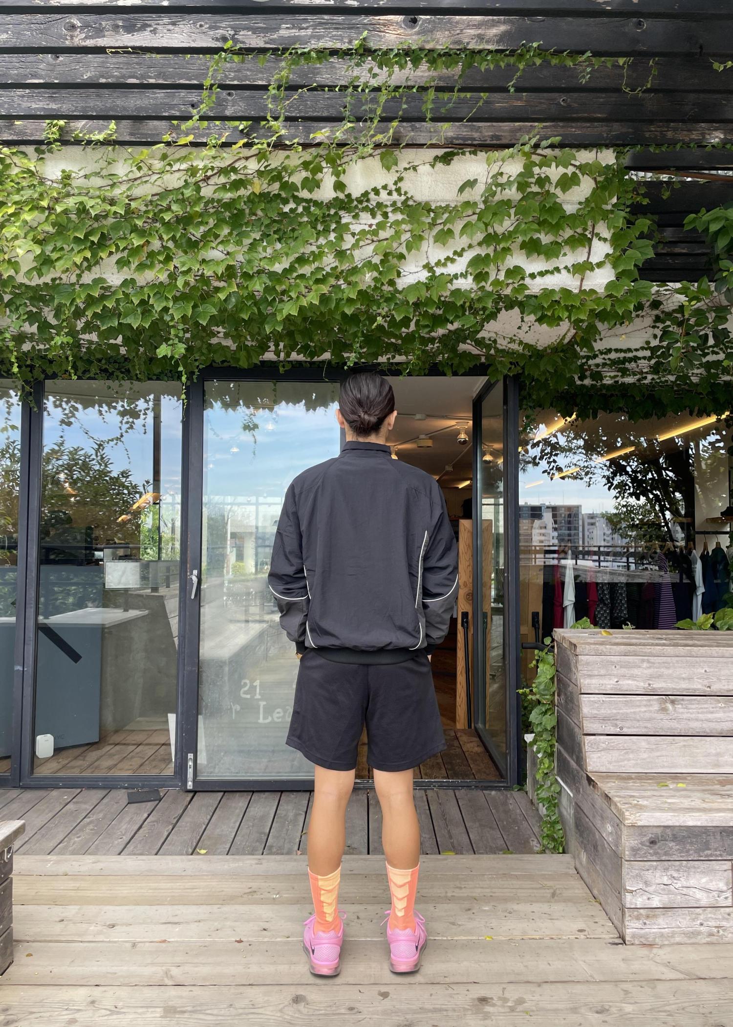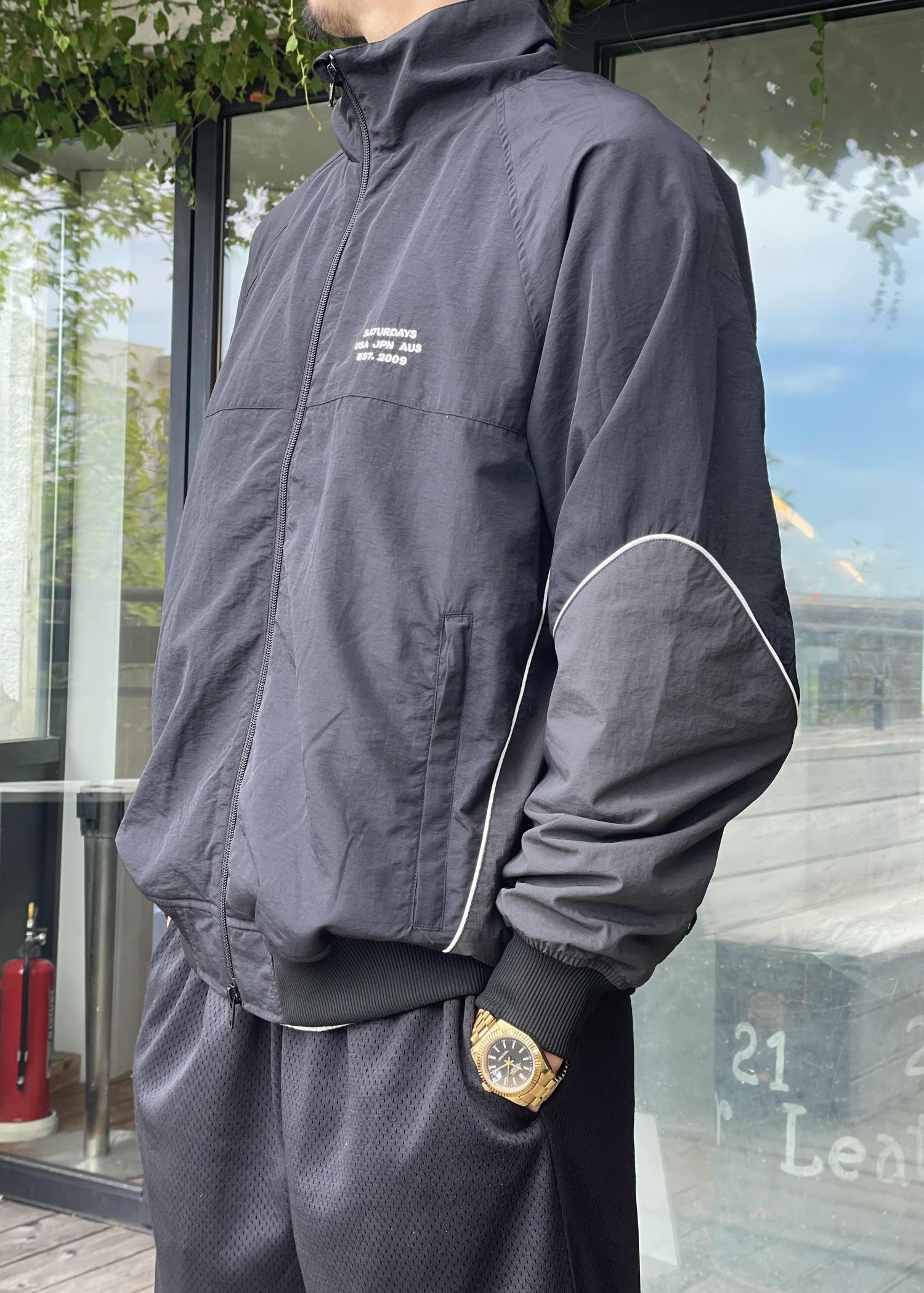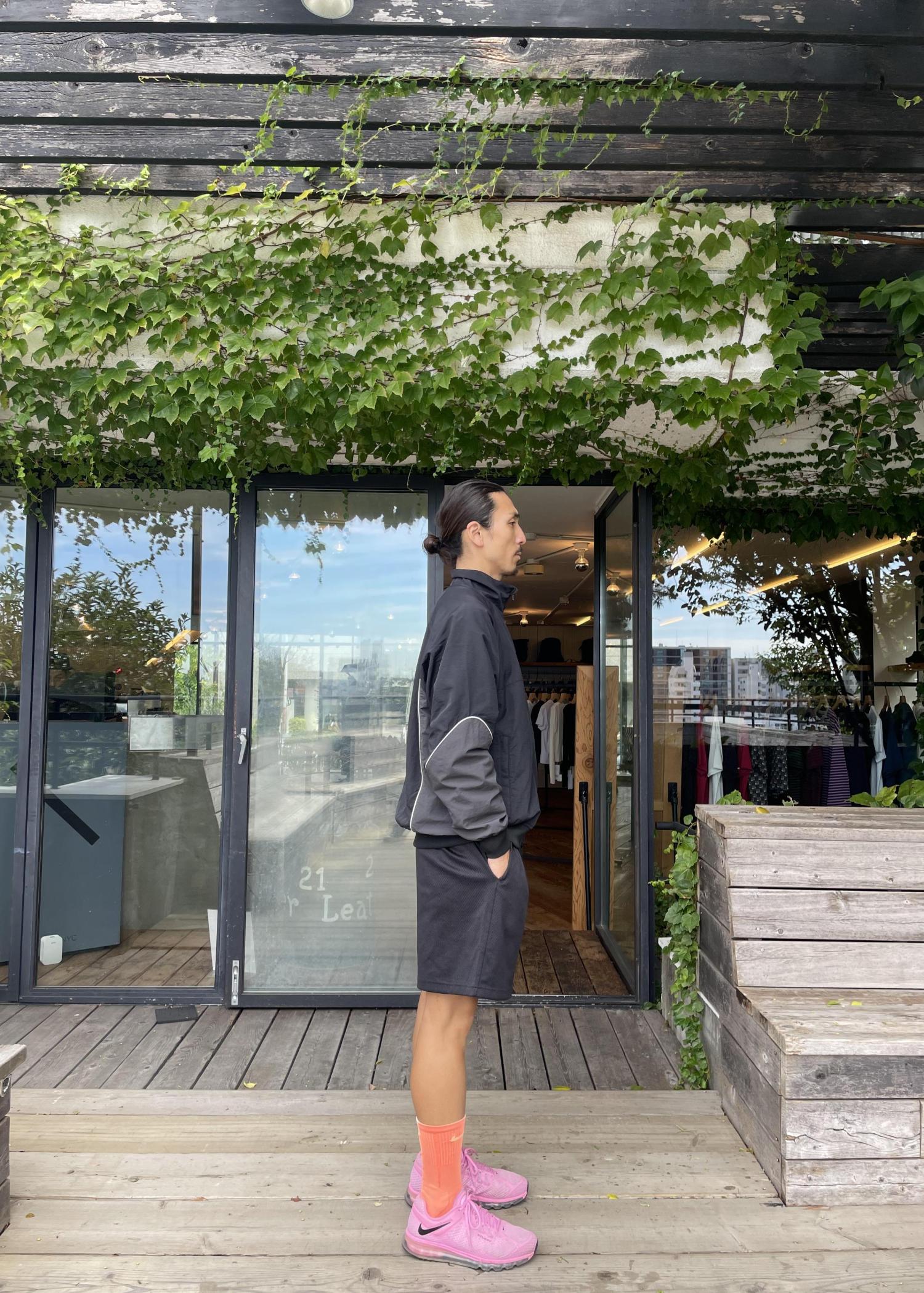 スポーティーな素材感のジャケットだが、上下ブラックカラーで統一感を出しつつ、足元で差し色を入れたスタイリング!