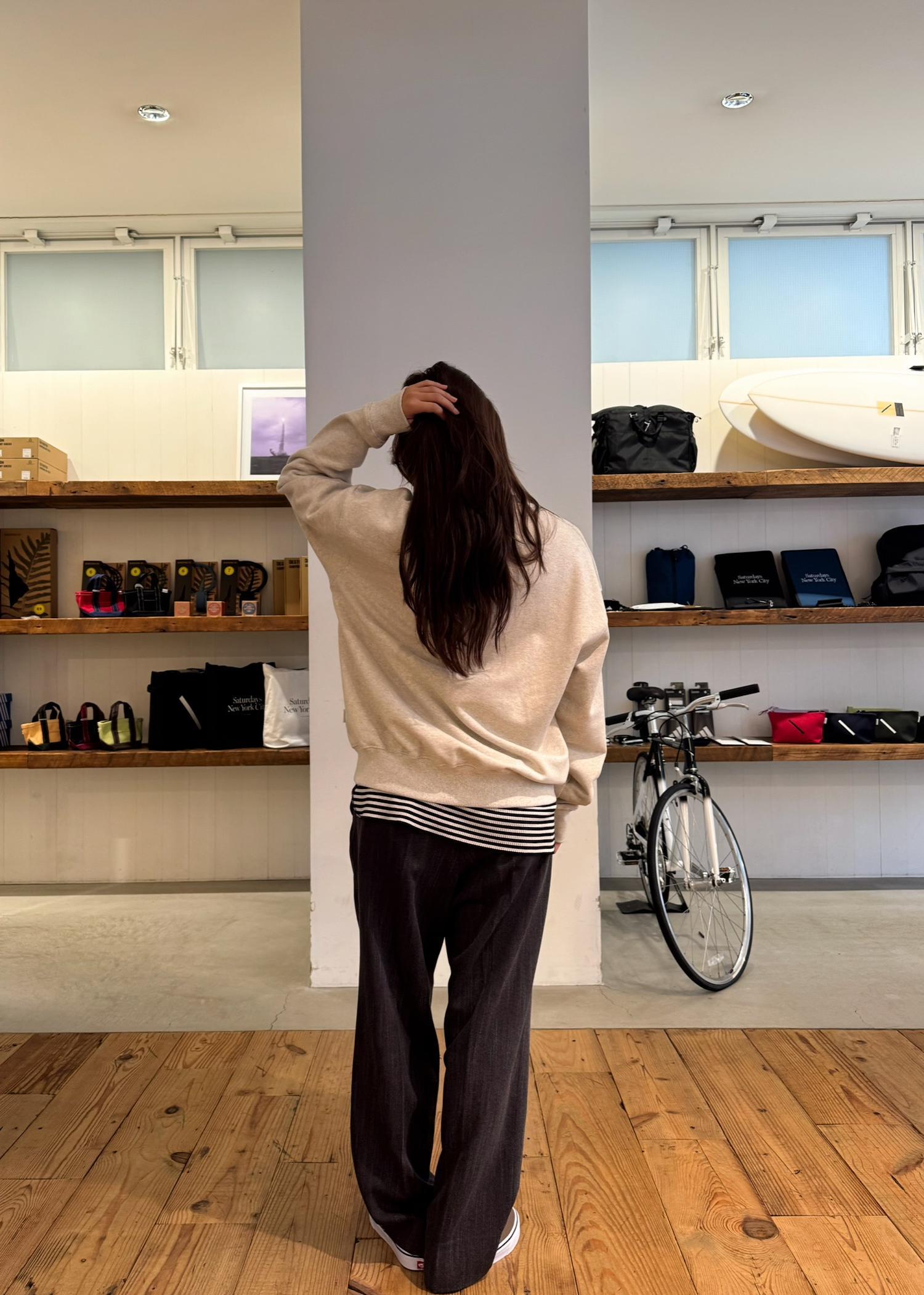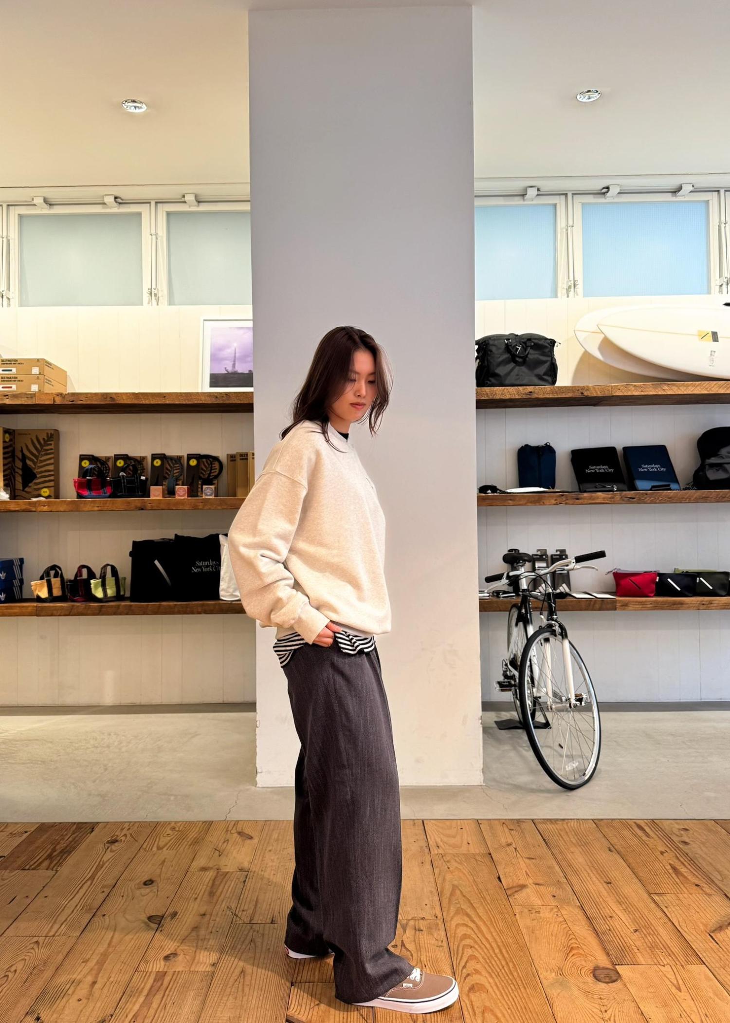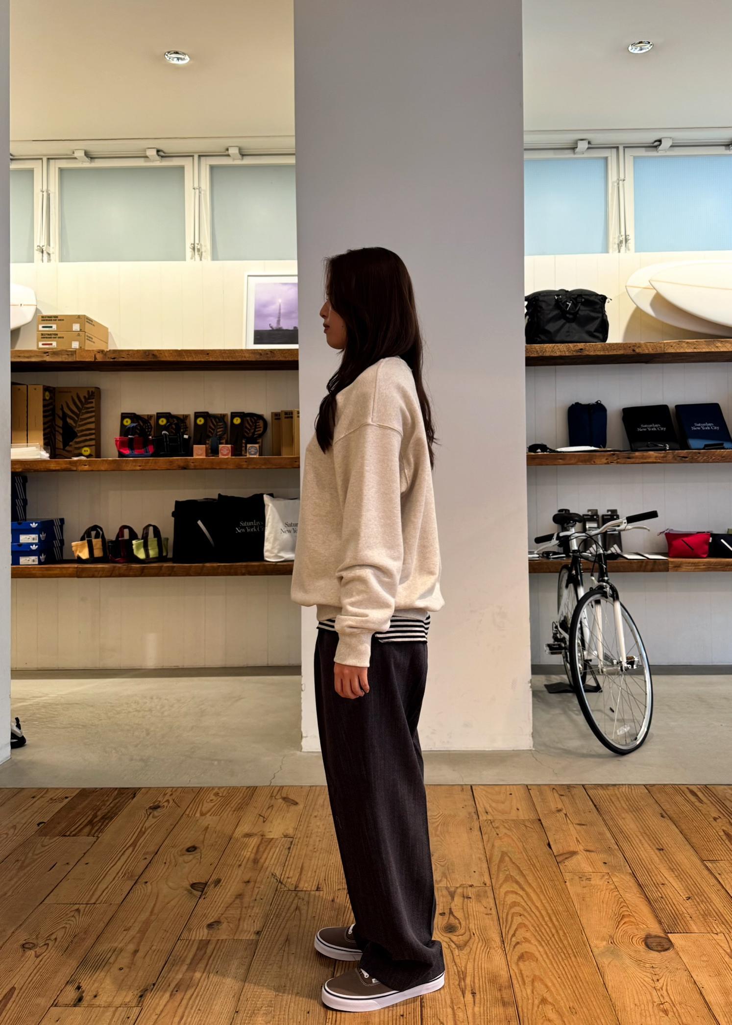 裾や袖からチラ見せすることで、シンプルなスウェットに遊び心をプラス!パンツは落ち感のあるチャコールグレーのスラックスで上品に。リラックスしたシルエットで大人っぽい印象に!足元はスニーカーで軽やかに仕上げました⭐︎