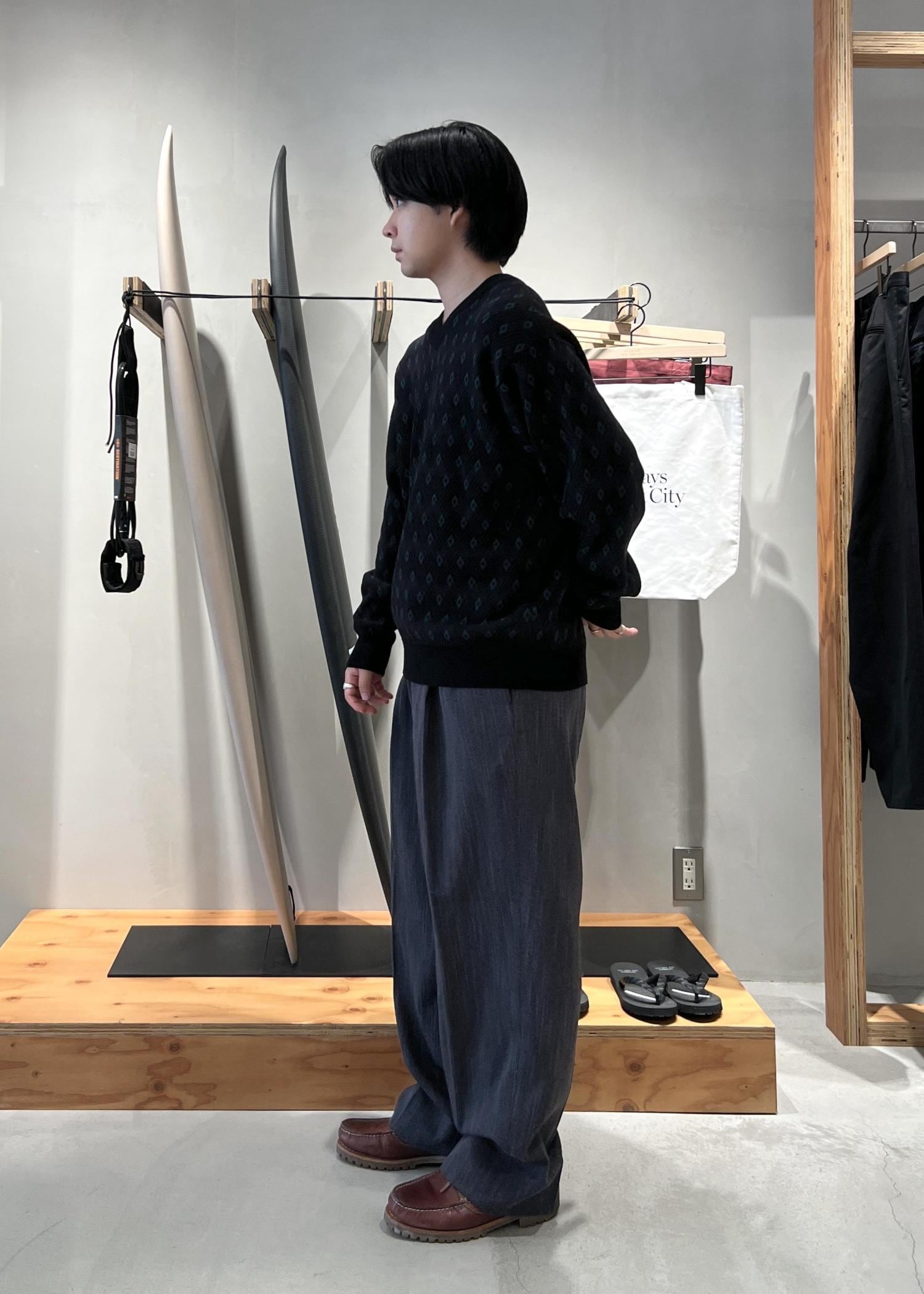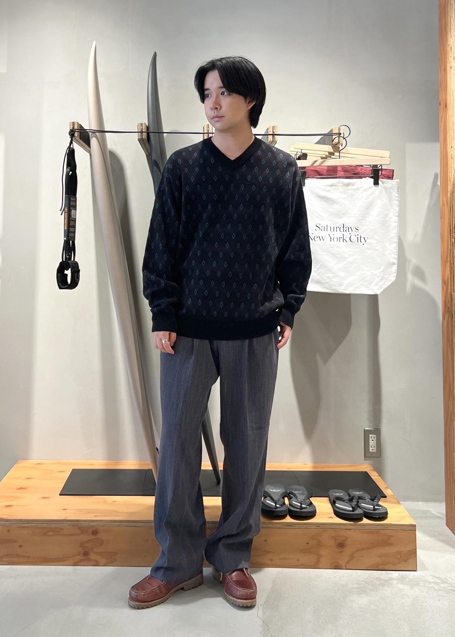 クラシックな柄のコットンVネックニットとレトロツイードが特徴的な2タックスラックスの合わせです!