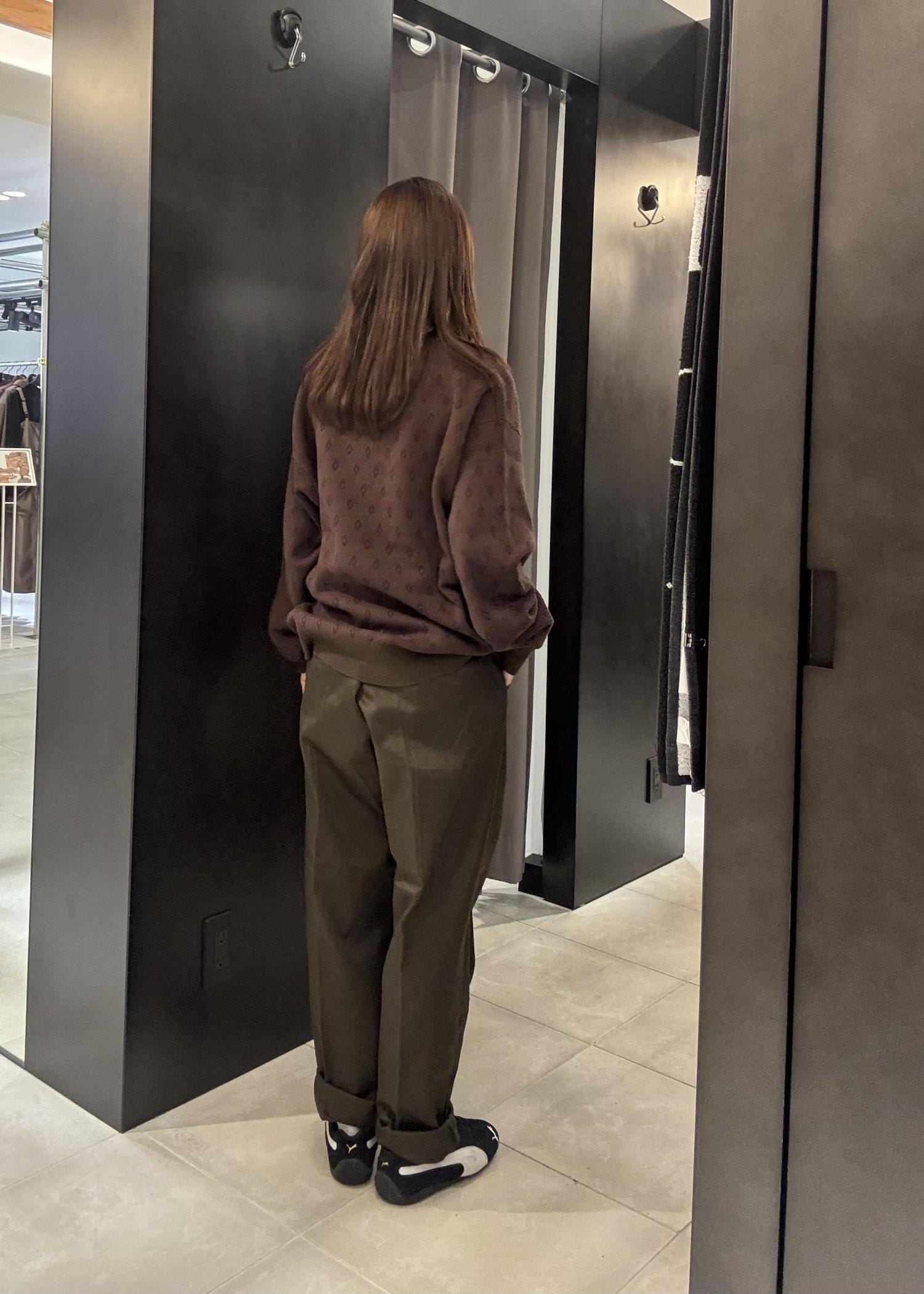 着用しているパンツは、シーズンレスで着用できるテーパードタックパンツです。