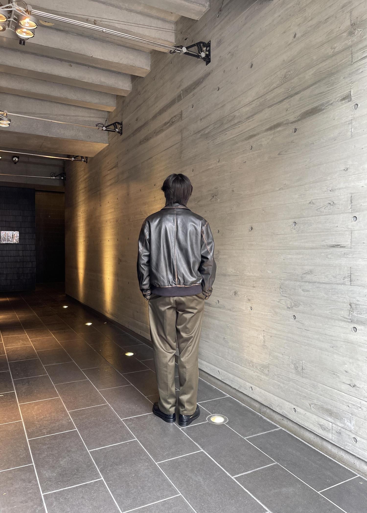 172cm トップスMサイズ レザージャケットLサイズ ボトムスMサイズ着用。