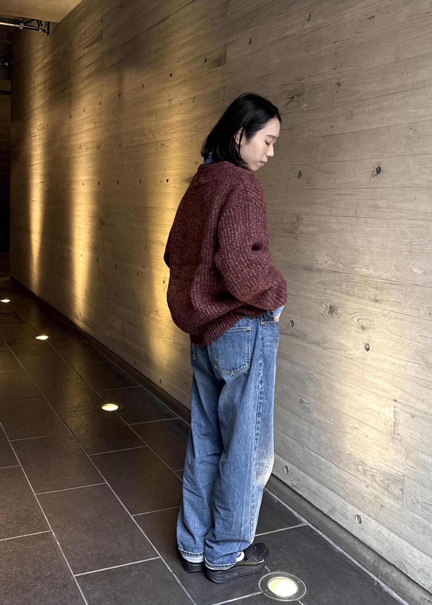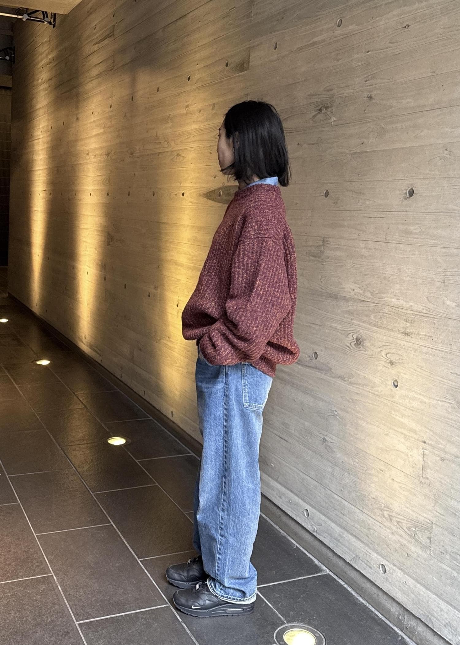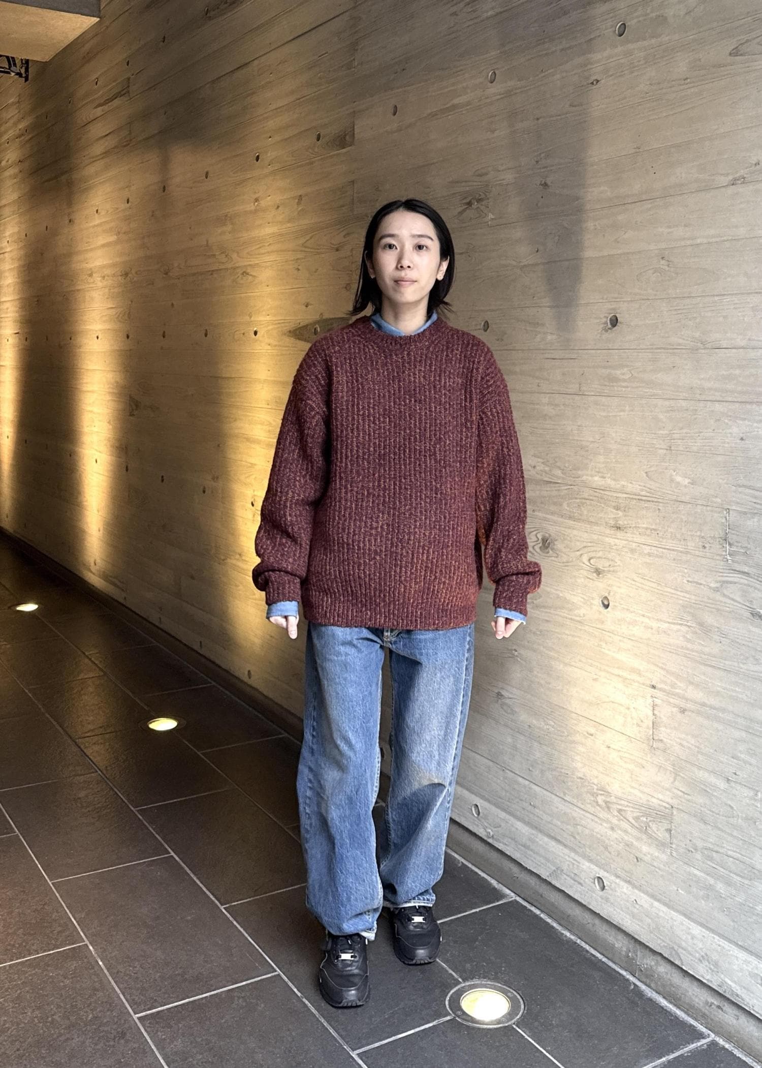 ボリューム感が特徴のローゲージニットを使用したコーディネートをご紹介いたします。