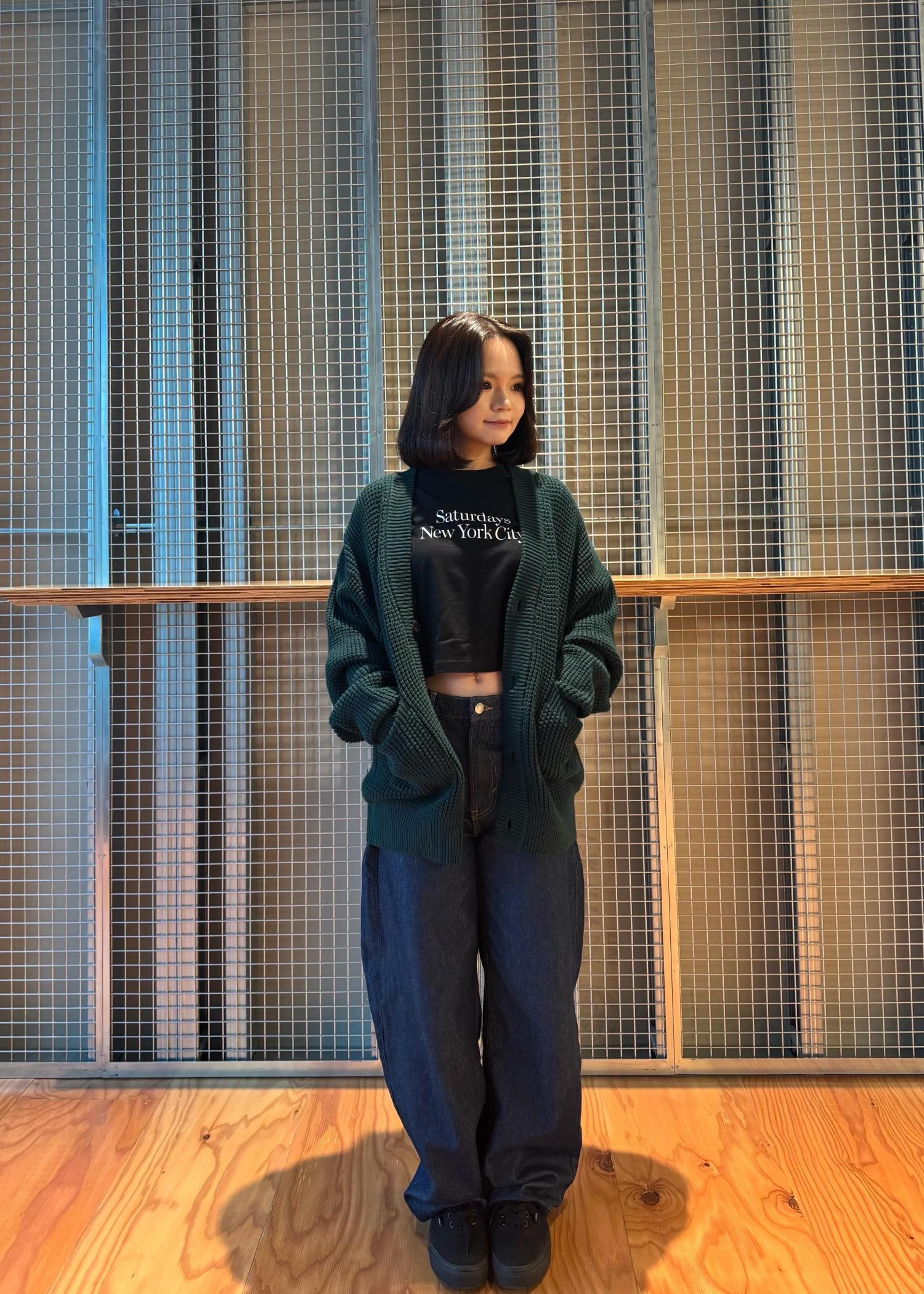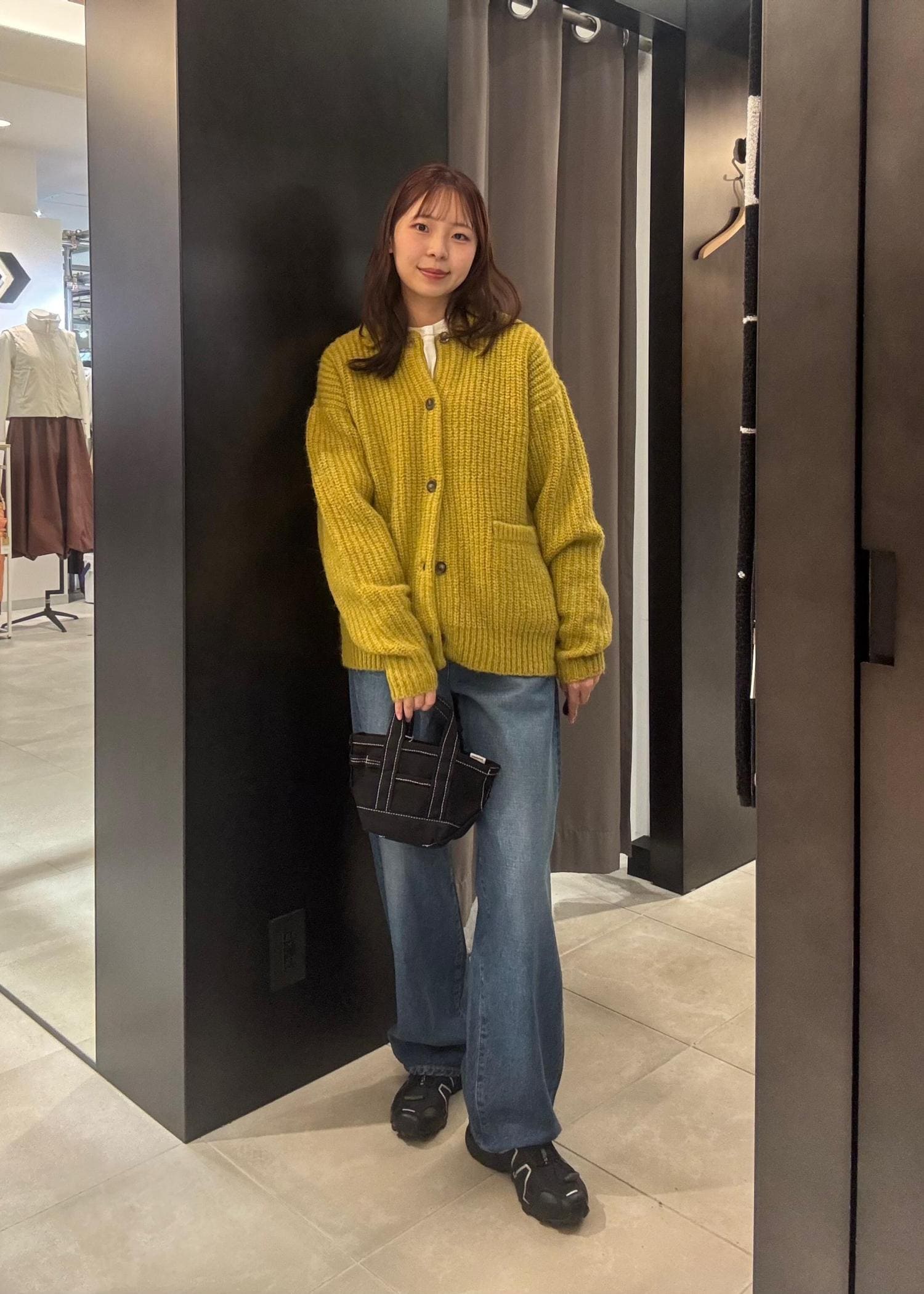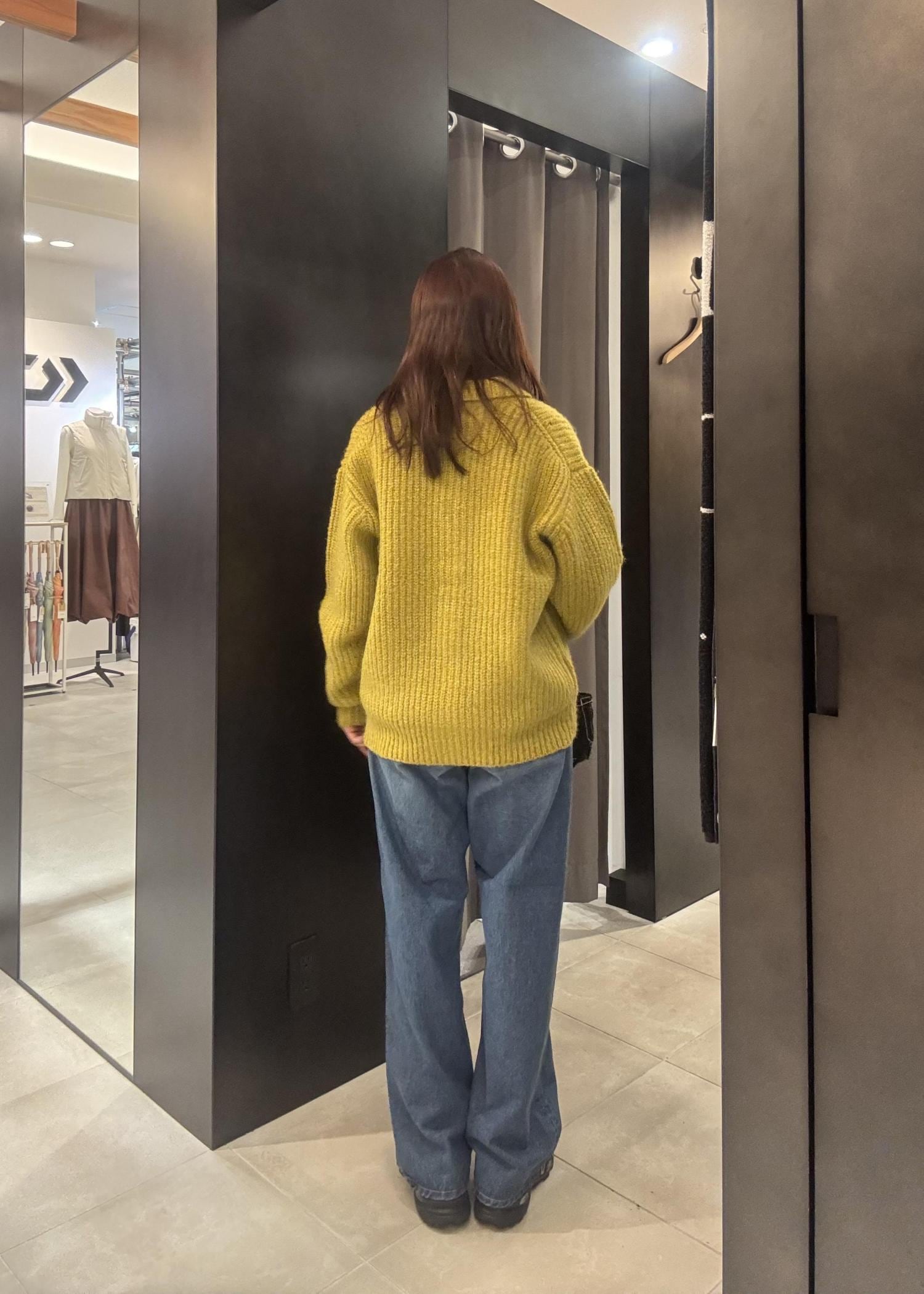 着用しているニットは、度目が詰まったローゲージの片畦で編み立てたボリュームのあるポロカーディガンです。