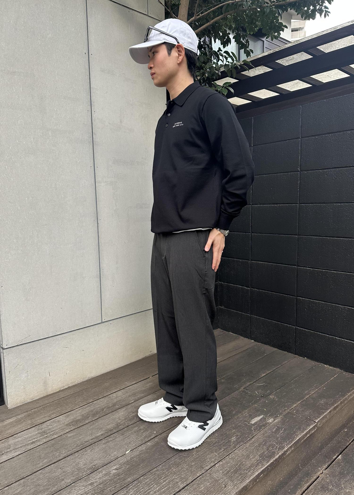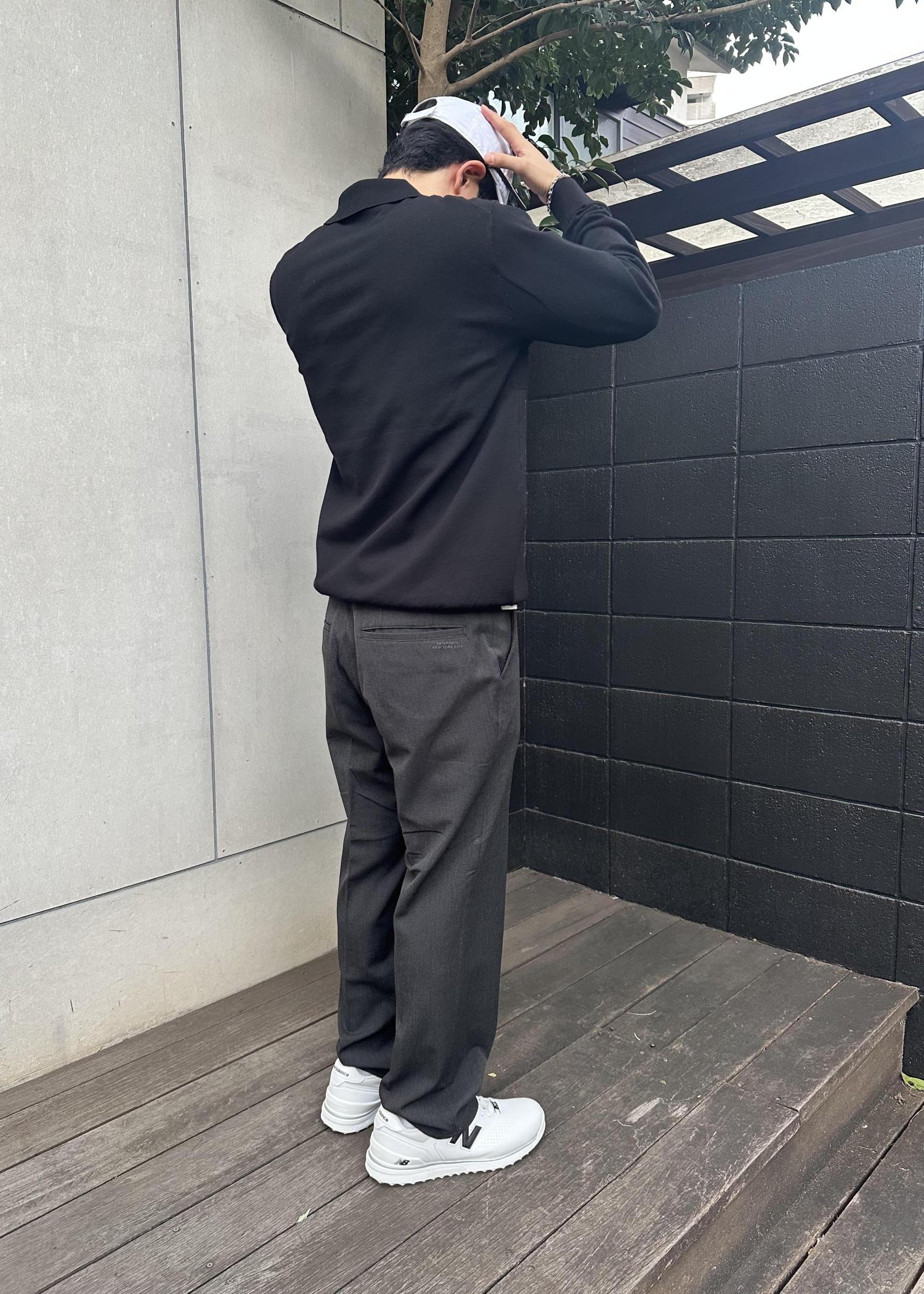 ブラックの長袖ニットポロ、チャコールグレーのスラックスは普段使いもできます!