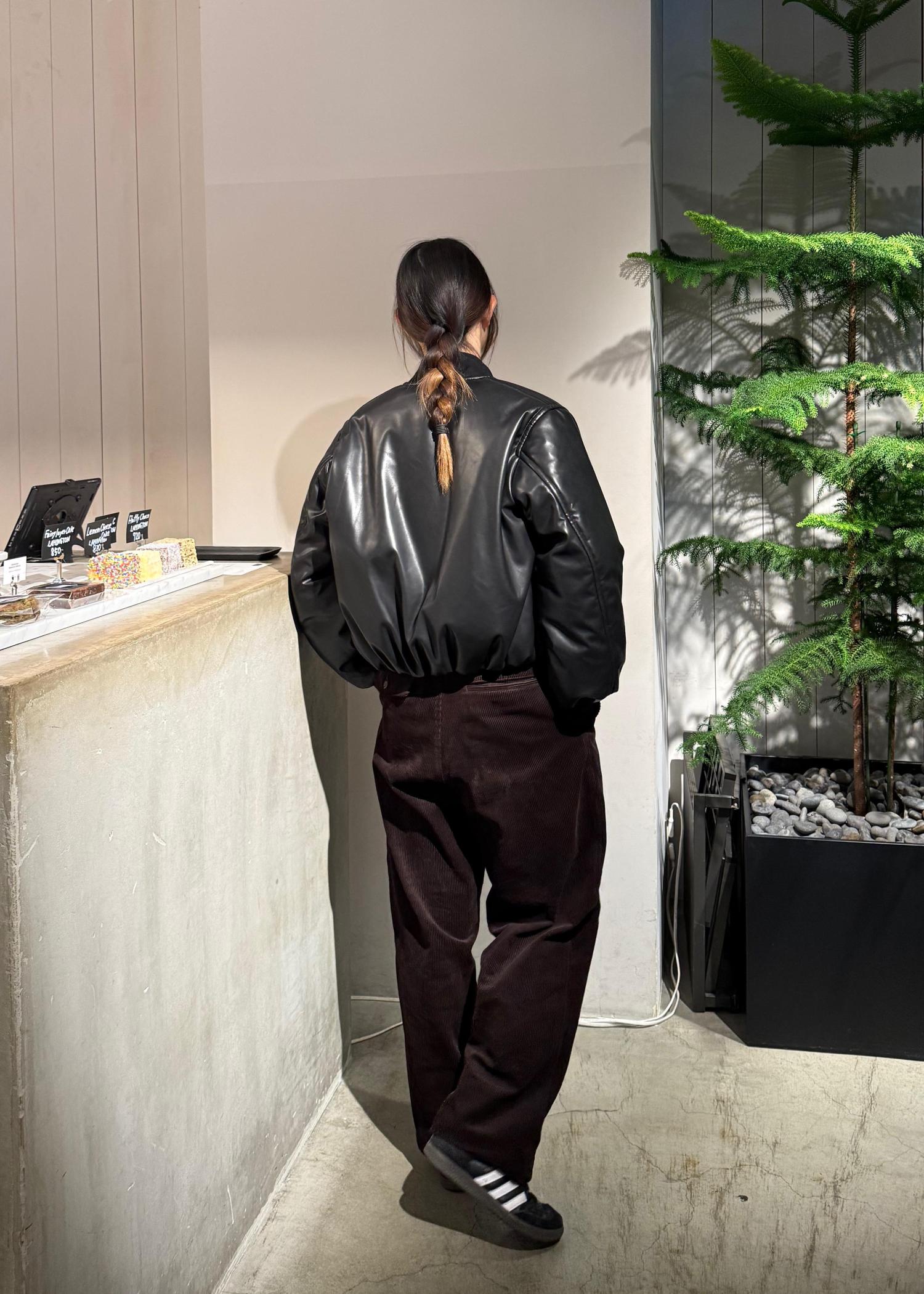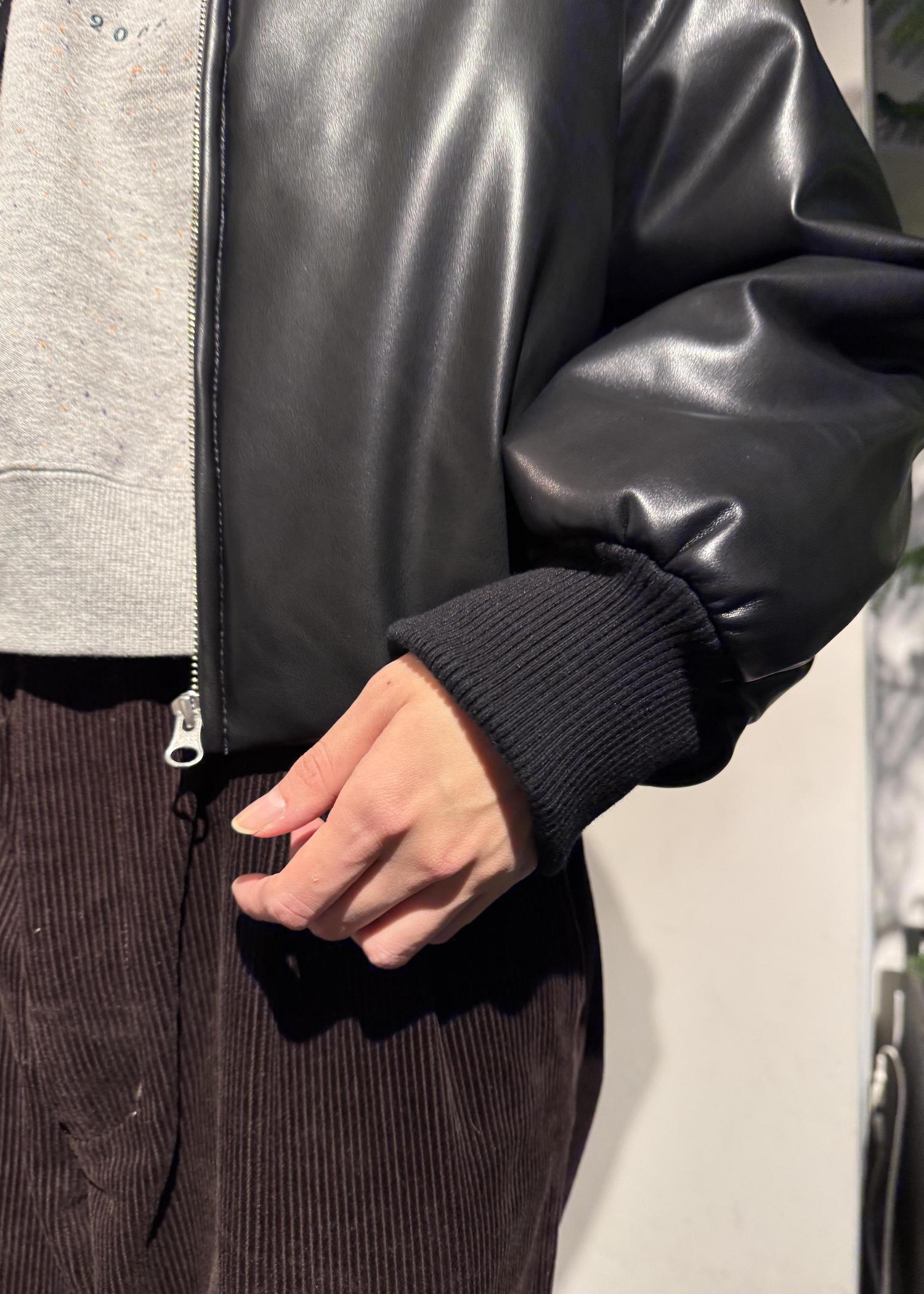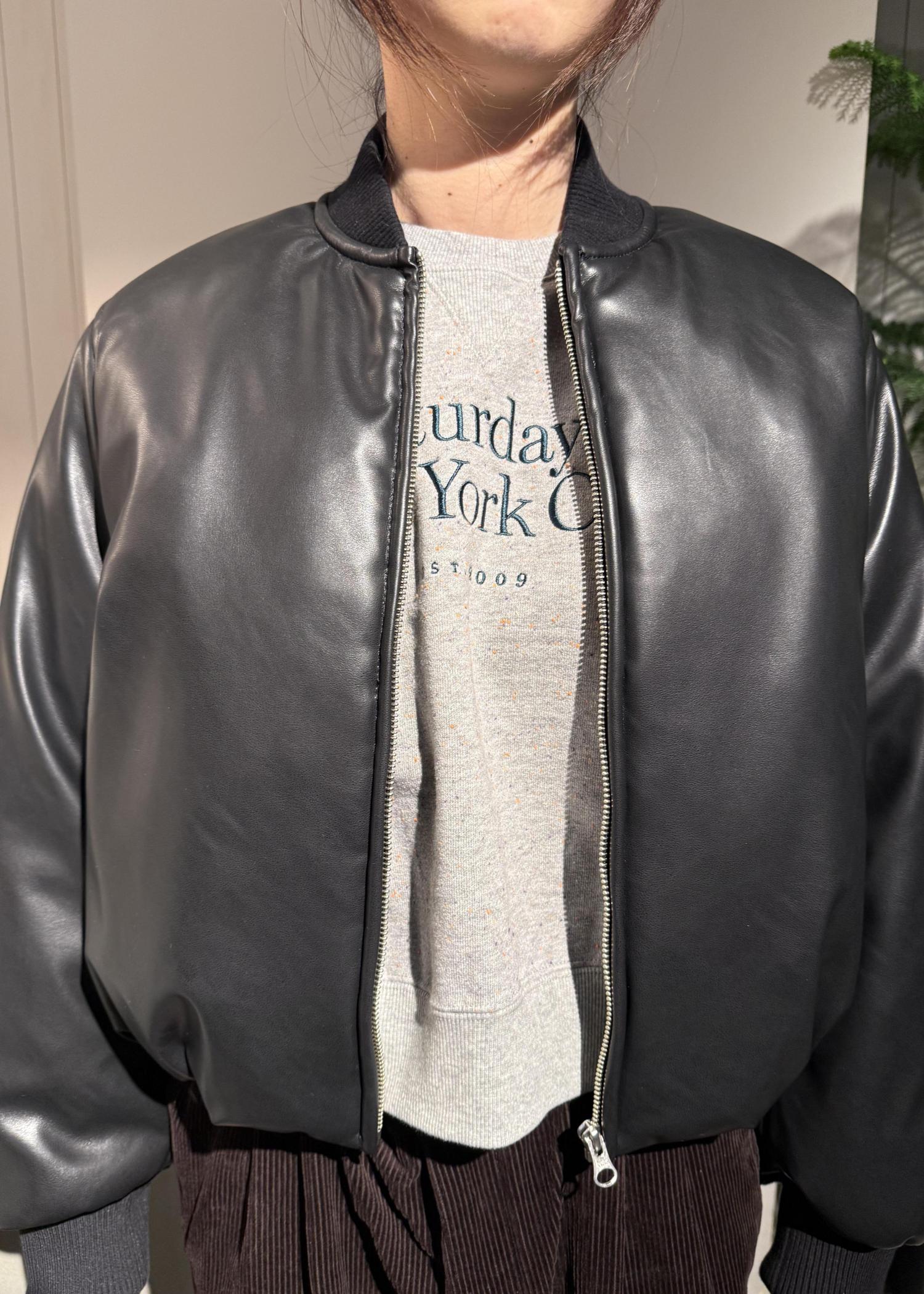 フェイクレザーに中綿を入れることで軽やかさと防寒性を両立。どんなスタイルにも活躍する万能アウターです! -