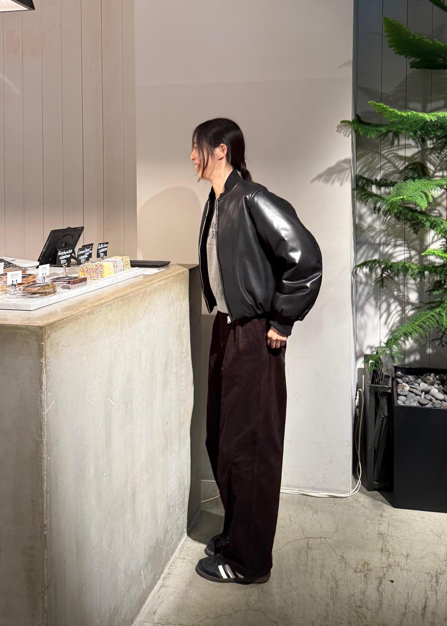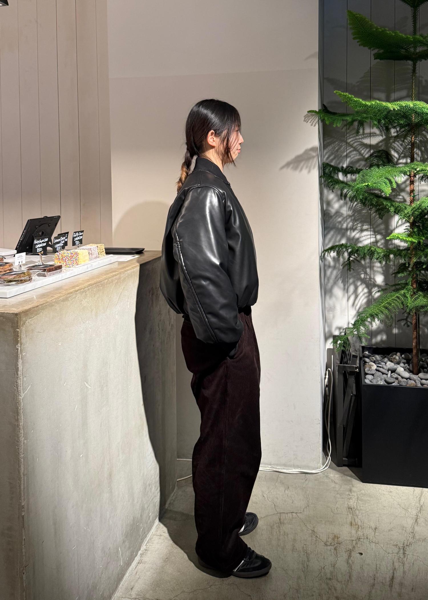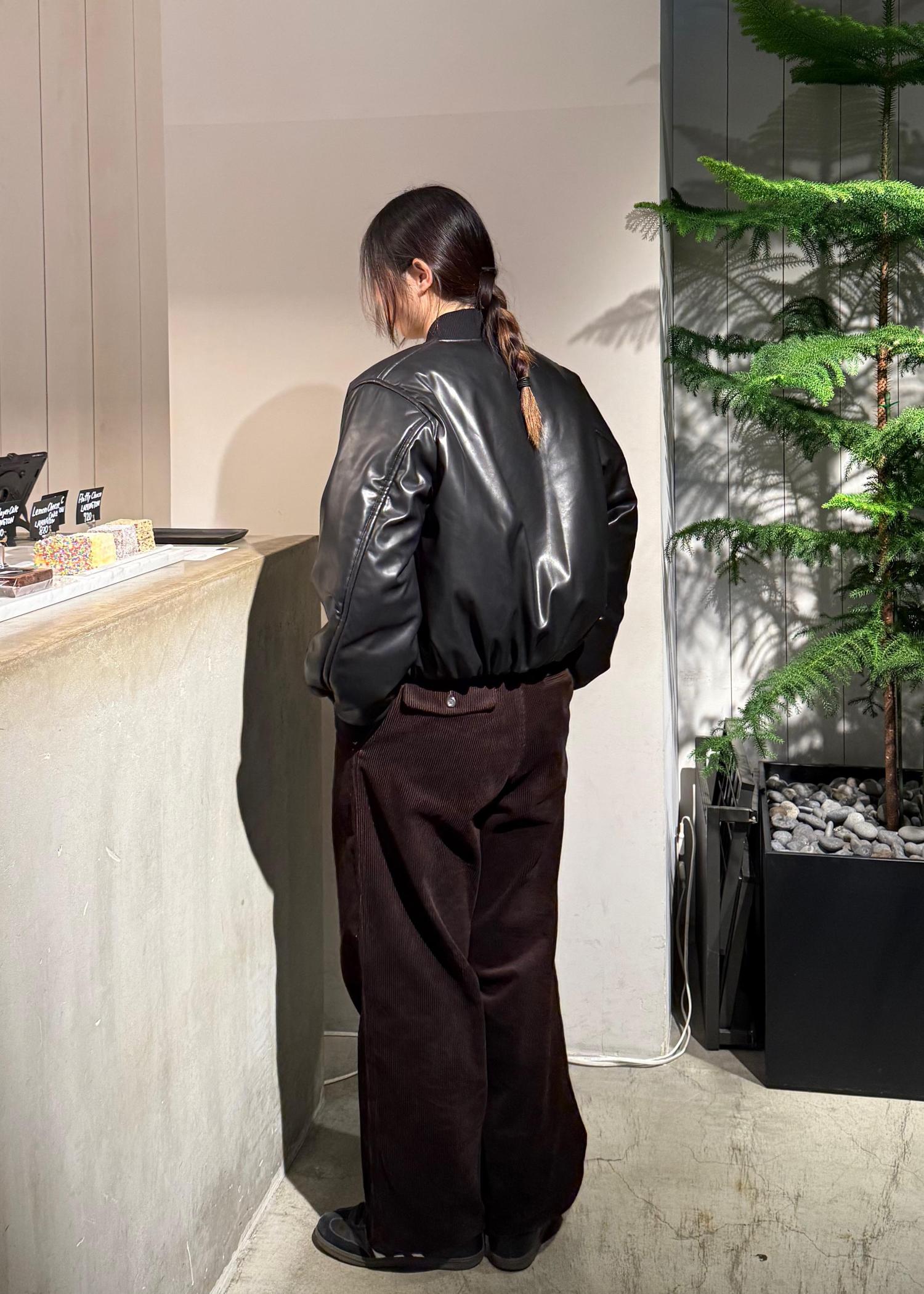 フェイクレザーに中綿を入れることで軽やかさと防寒性を両立。どんなスタイルにも活躍する万能アウターです! -