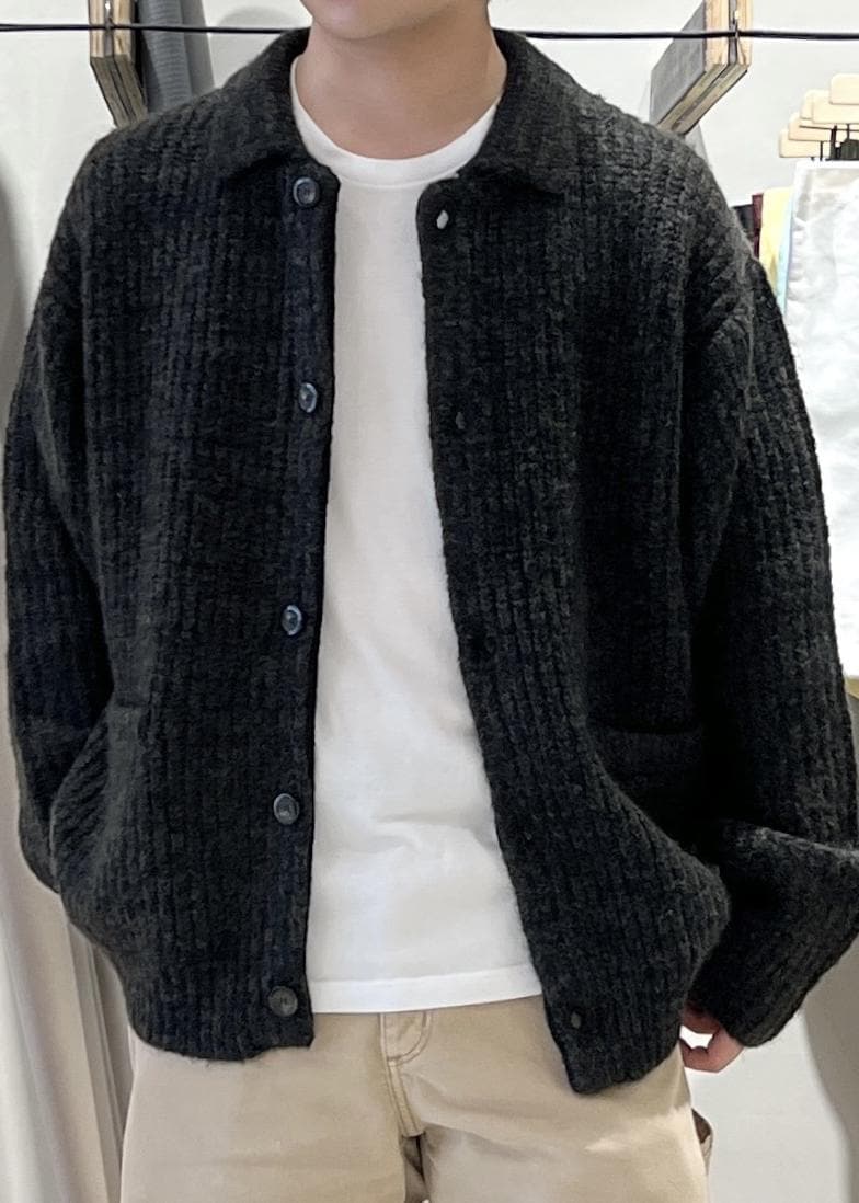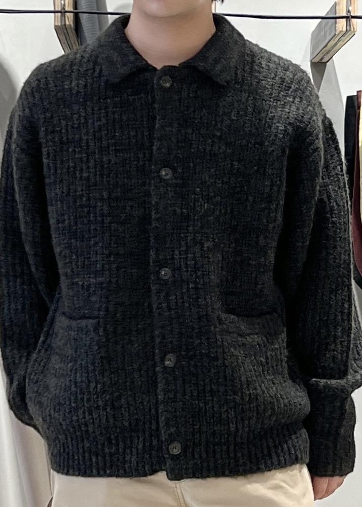 度目が詰まったローゲージの片畦で編み立てたポロカーディガンを着用しております!