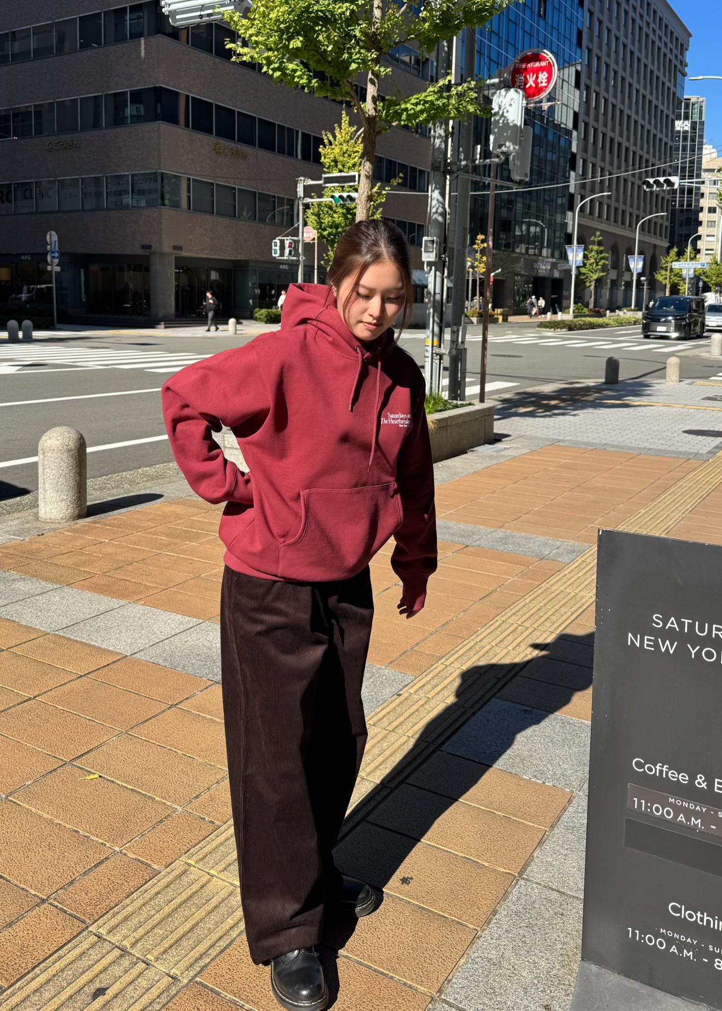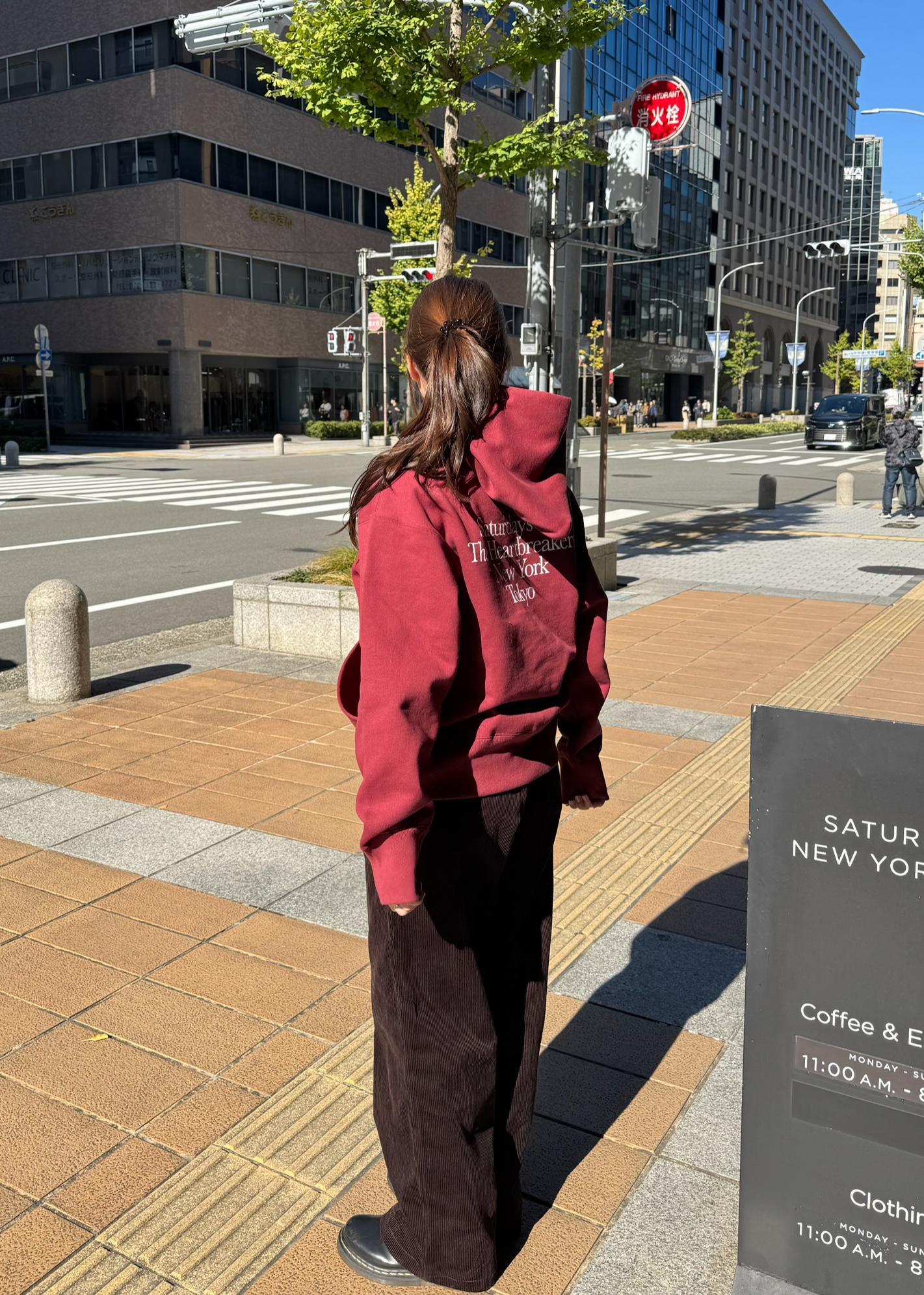 ワインレッドで落ち着いたトーンのコラボフーディーは、バックプリントがとにかくかわいい!