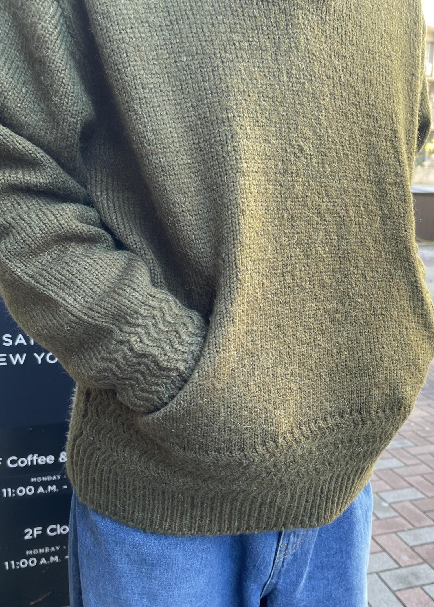ローゲージの天竺編みで、色味も落ち着いたオリーブ