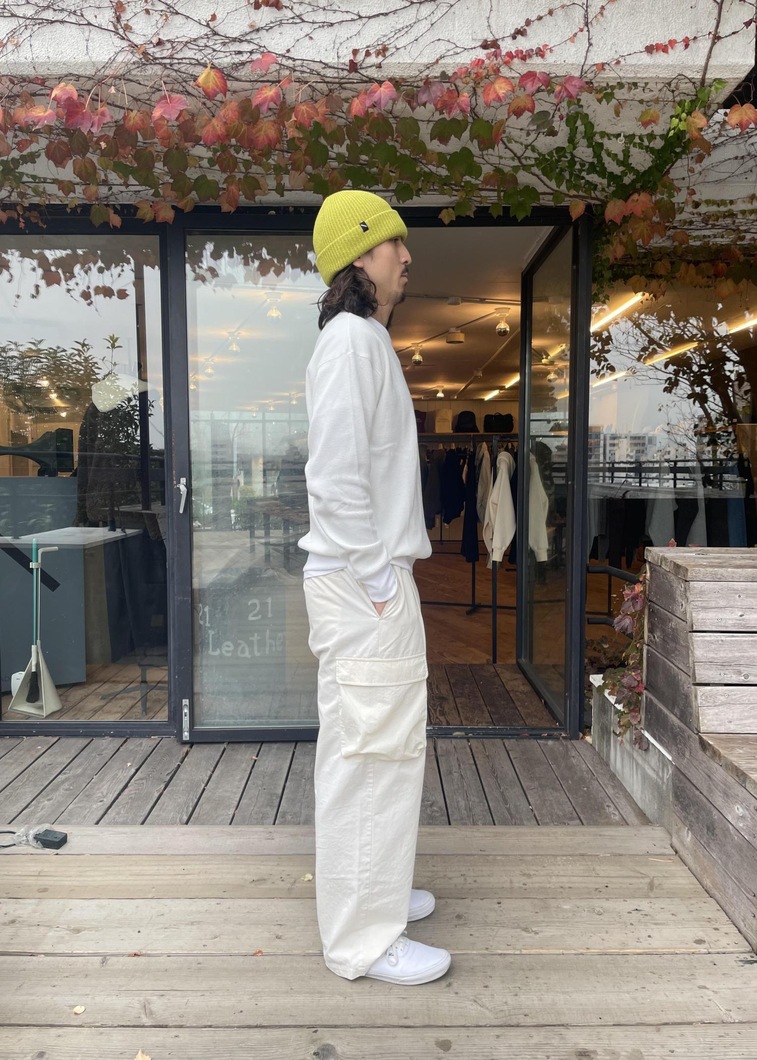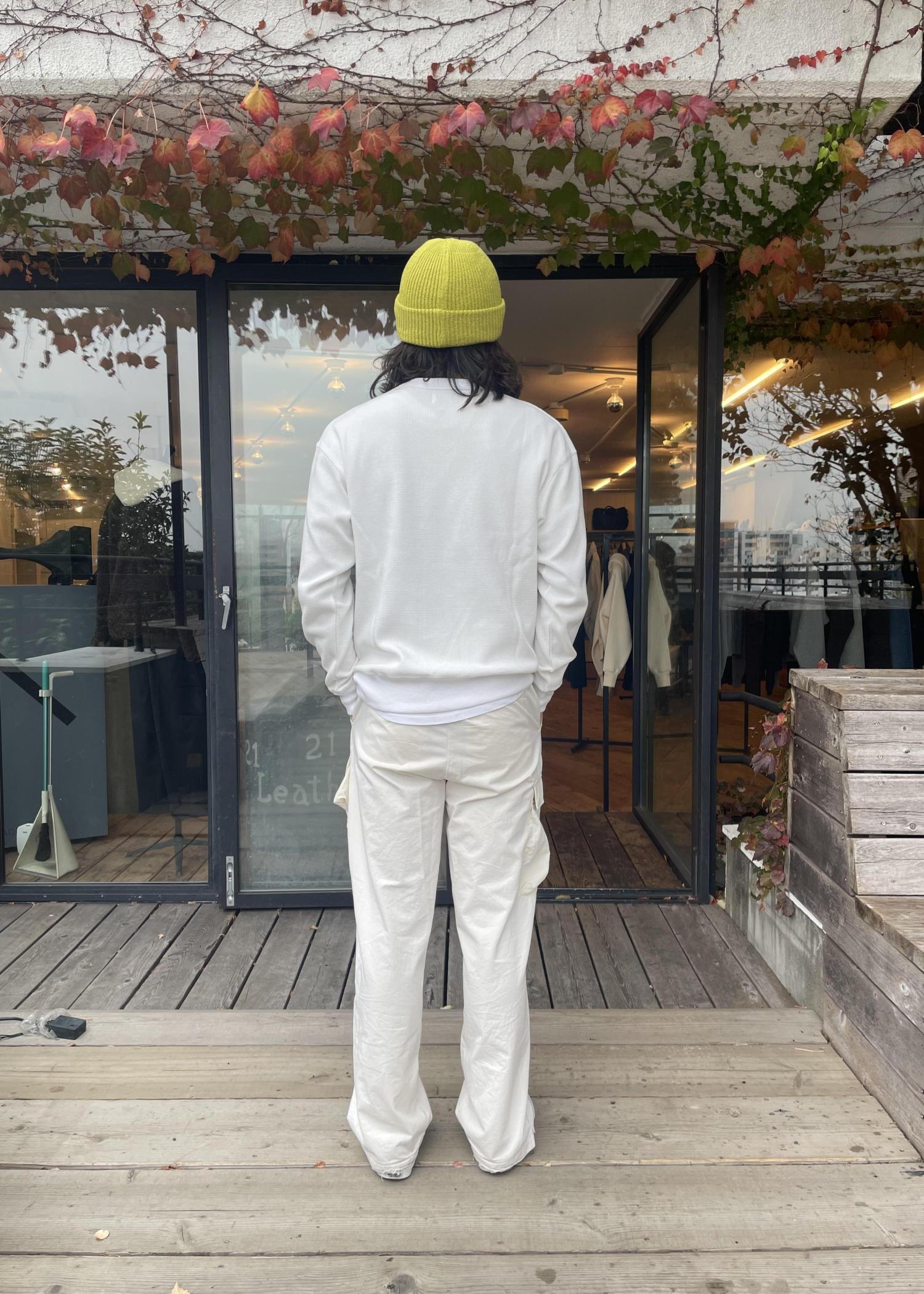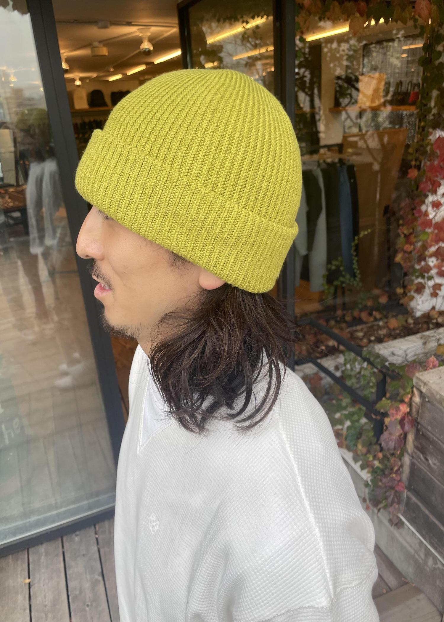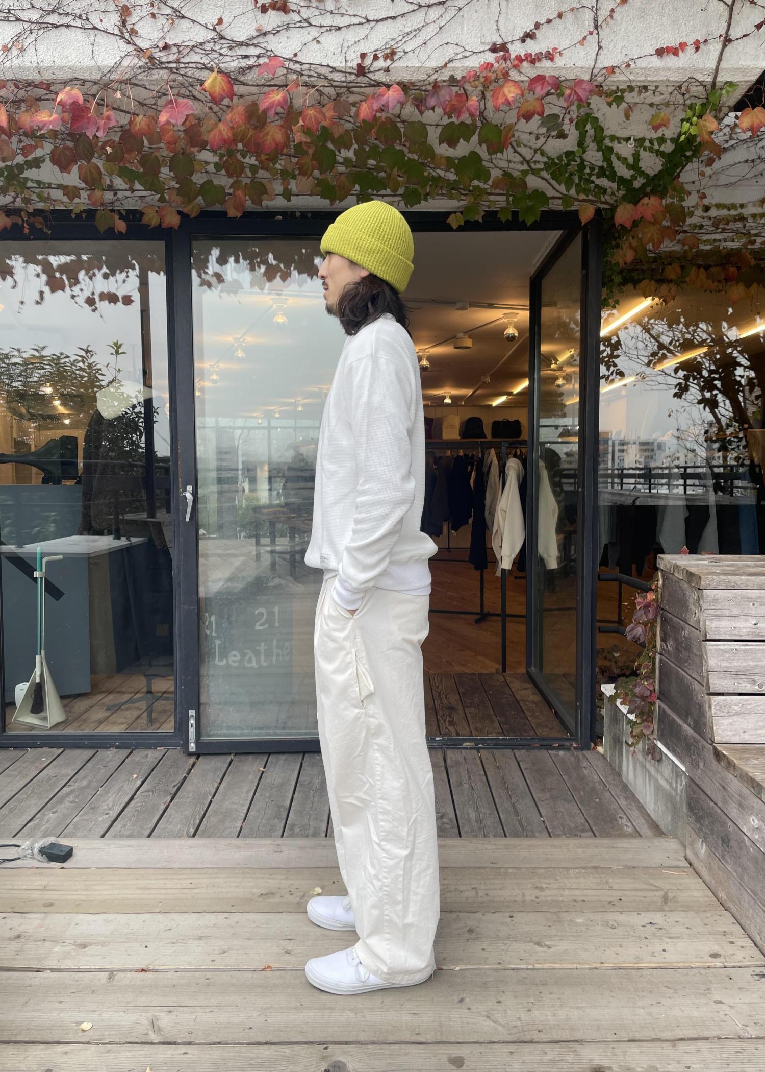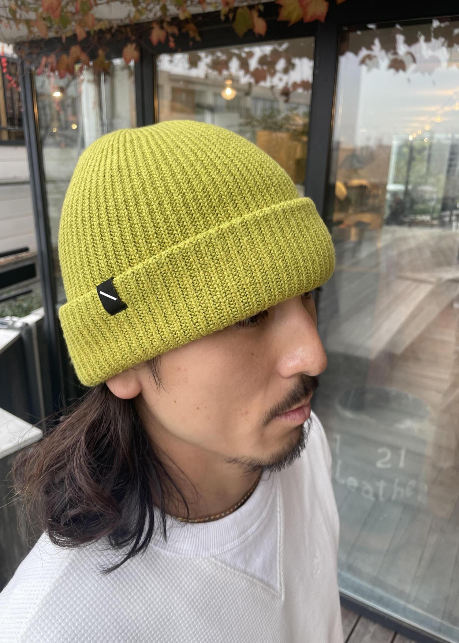 ニット帽は、今回はオールホワイトのスタイリングに差し色で黄色のニット帽がアクセントになっています!