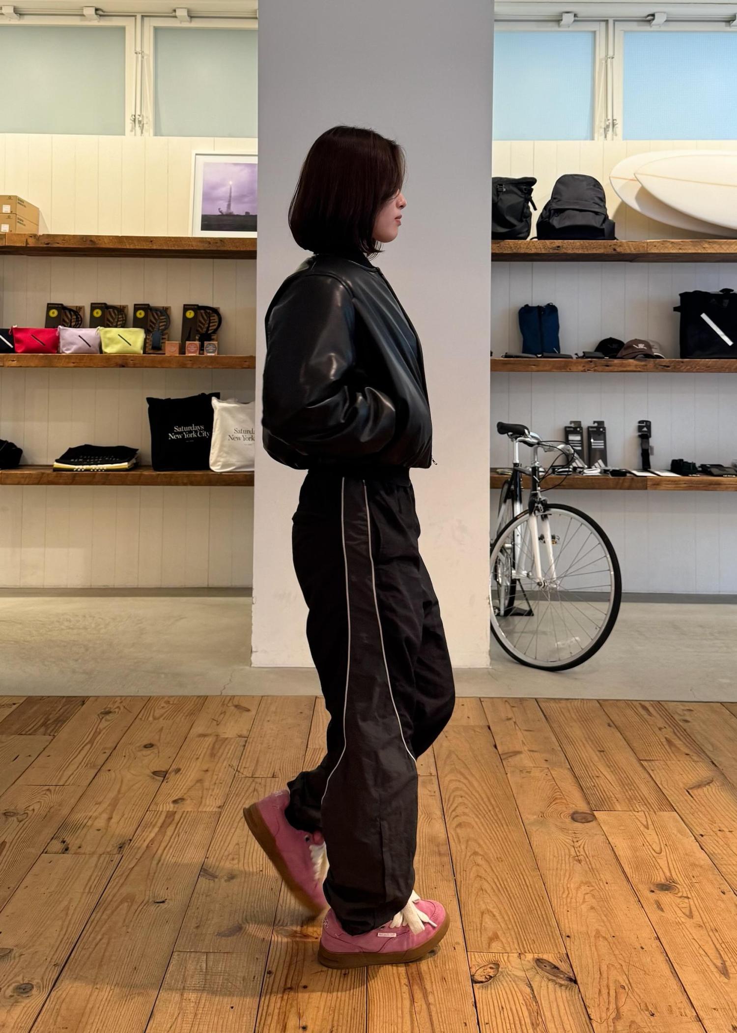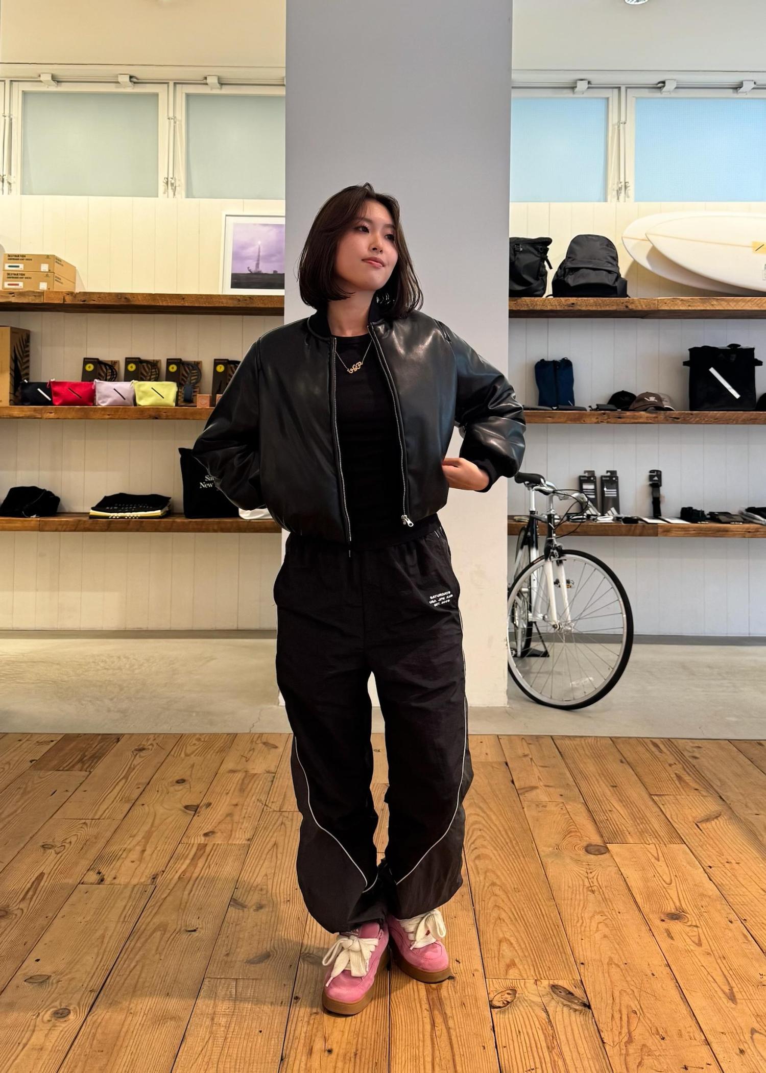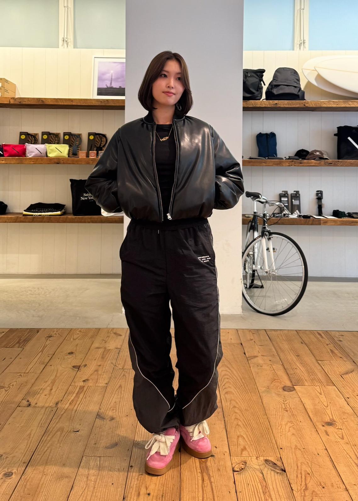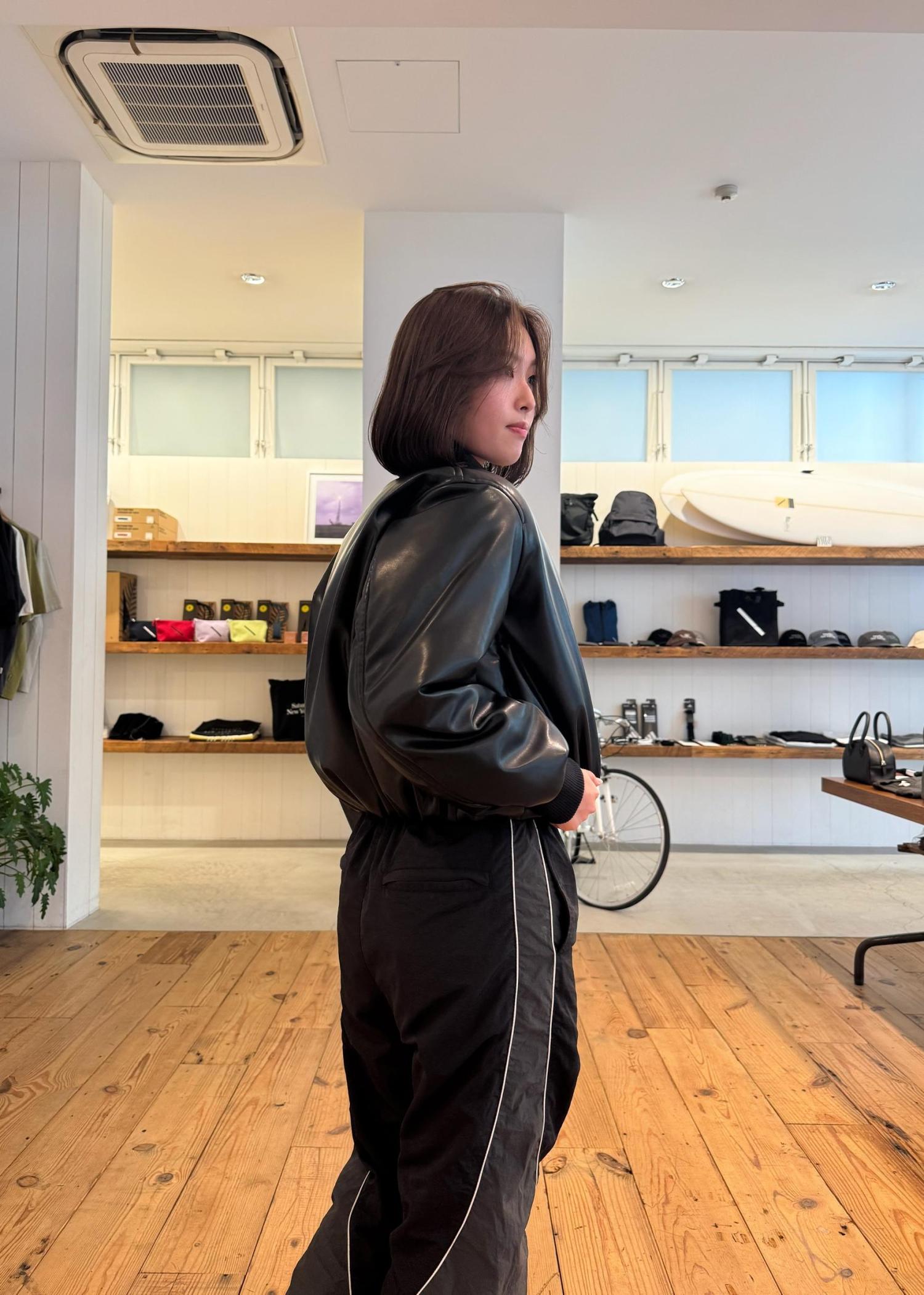 オールブラックでまとめた冬のおすすめコーデをご紹介します。レザーの艶感とナイロン素材の軽さを合わせることで、バランスの良いスタイリングに仕上げました。
