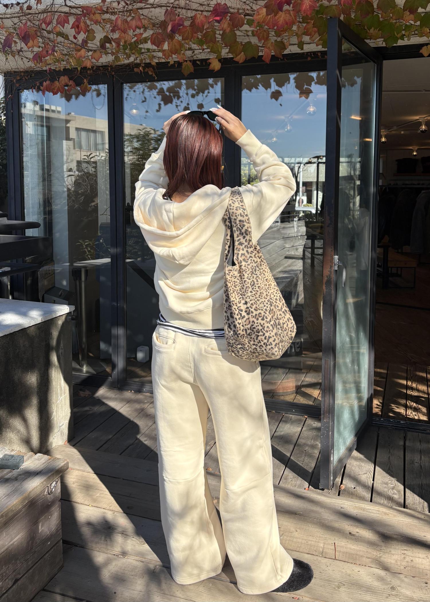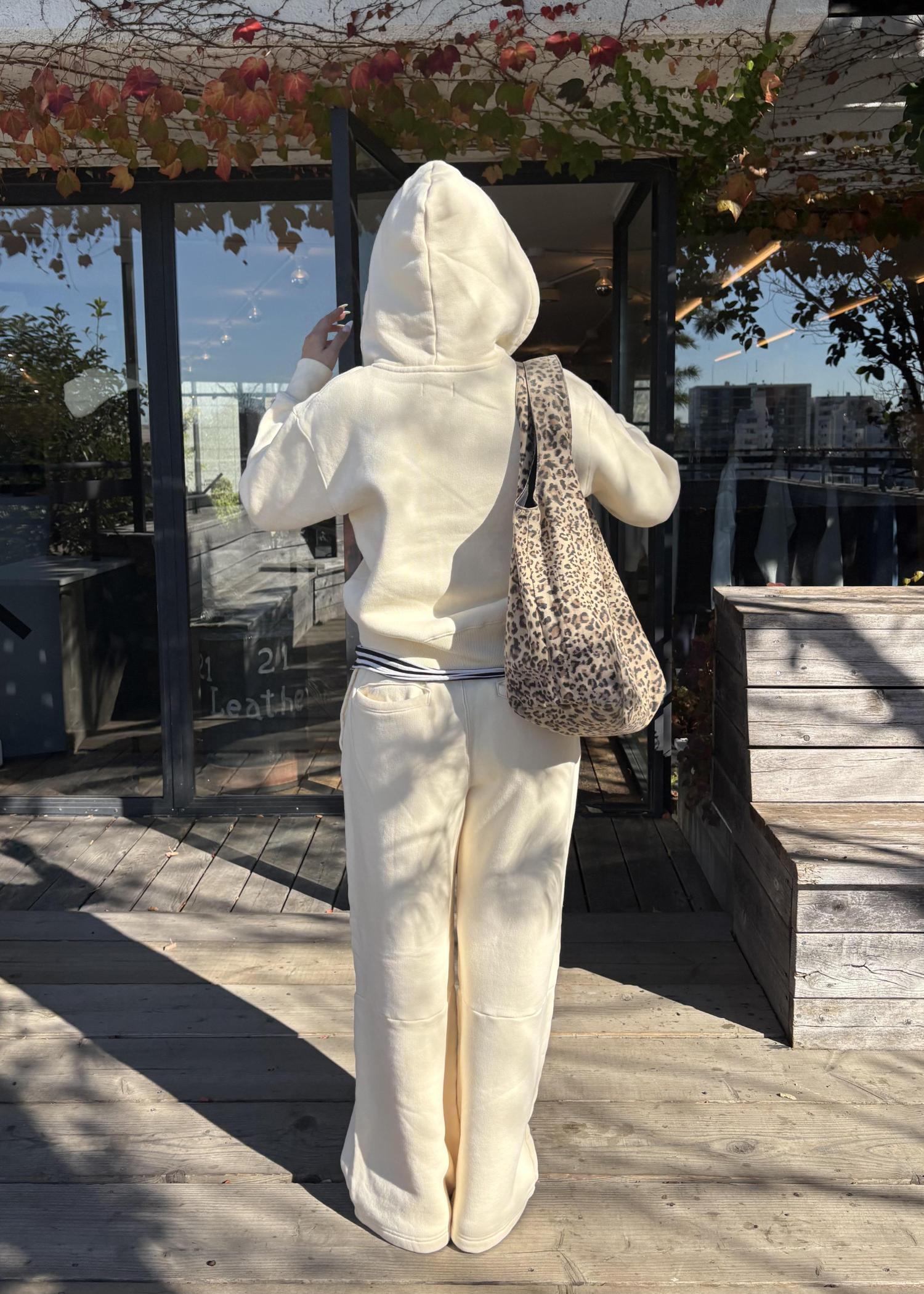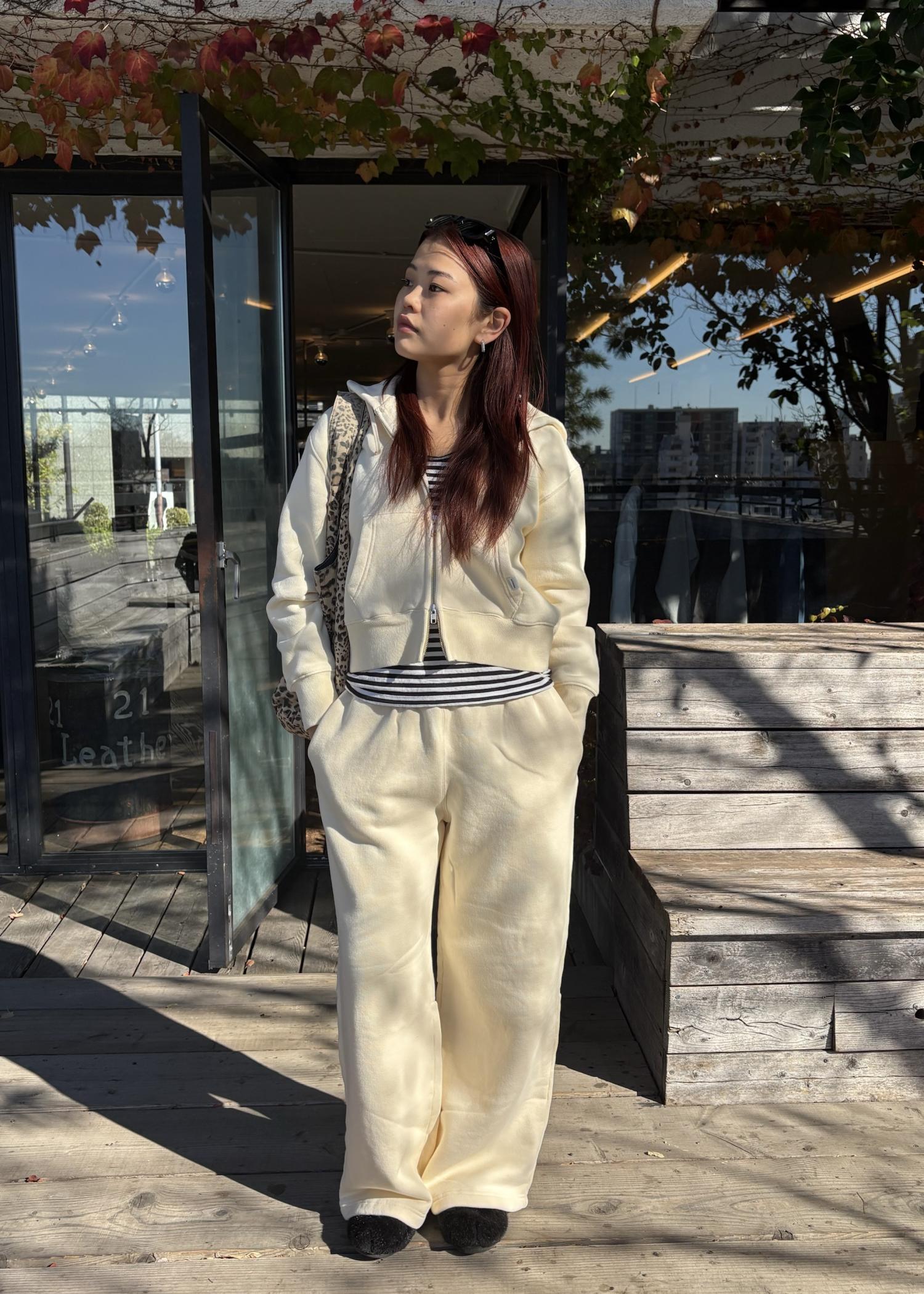 スウェットパンツは、私は165cmでレディースアイテムの場合普段はMサイズを着用するのですが、大きめに履きたかったのでLで合わせています。 ストンと綺麗に足元までシルエットキープされつつ、腰回りのリブが太めだったり、ポケットの使いやすさ、最高です!