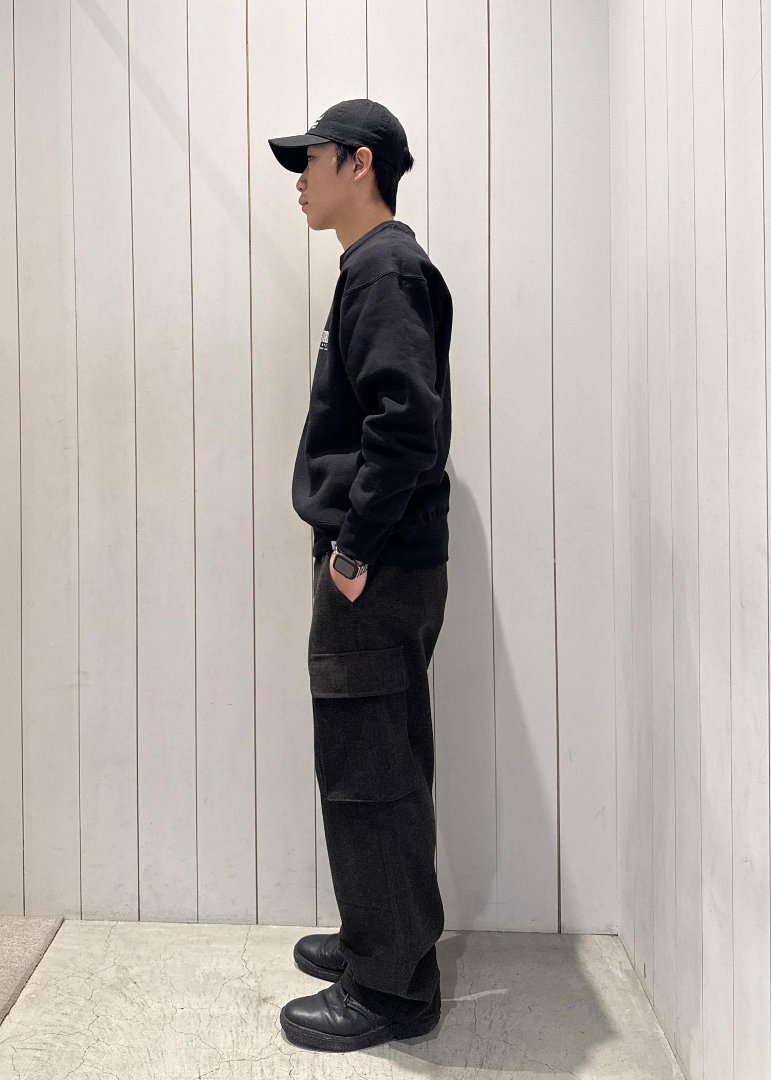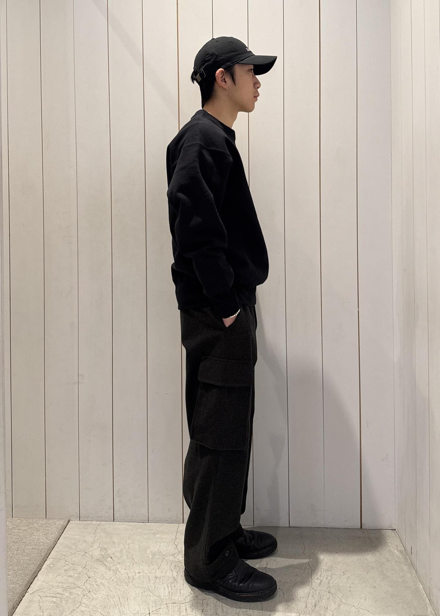 ゆったりした腰回りからまっすぐ落ちるワイドストレートシルエットは無骨ながらも上品なデザインになっています。