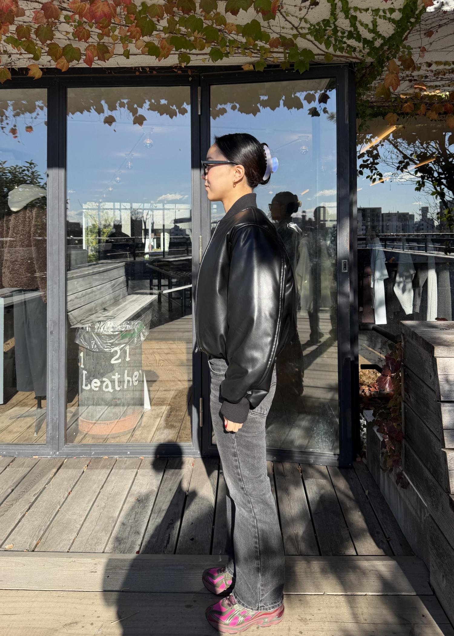フェイクレザーに中綿を入れることで軽やかさと防寒性を両立。めちゃくちゃ暖かいです