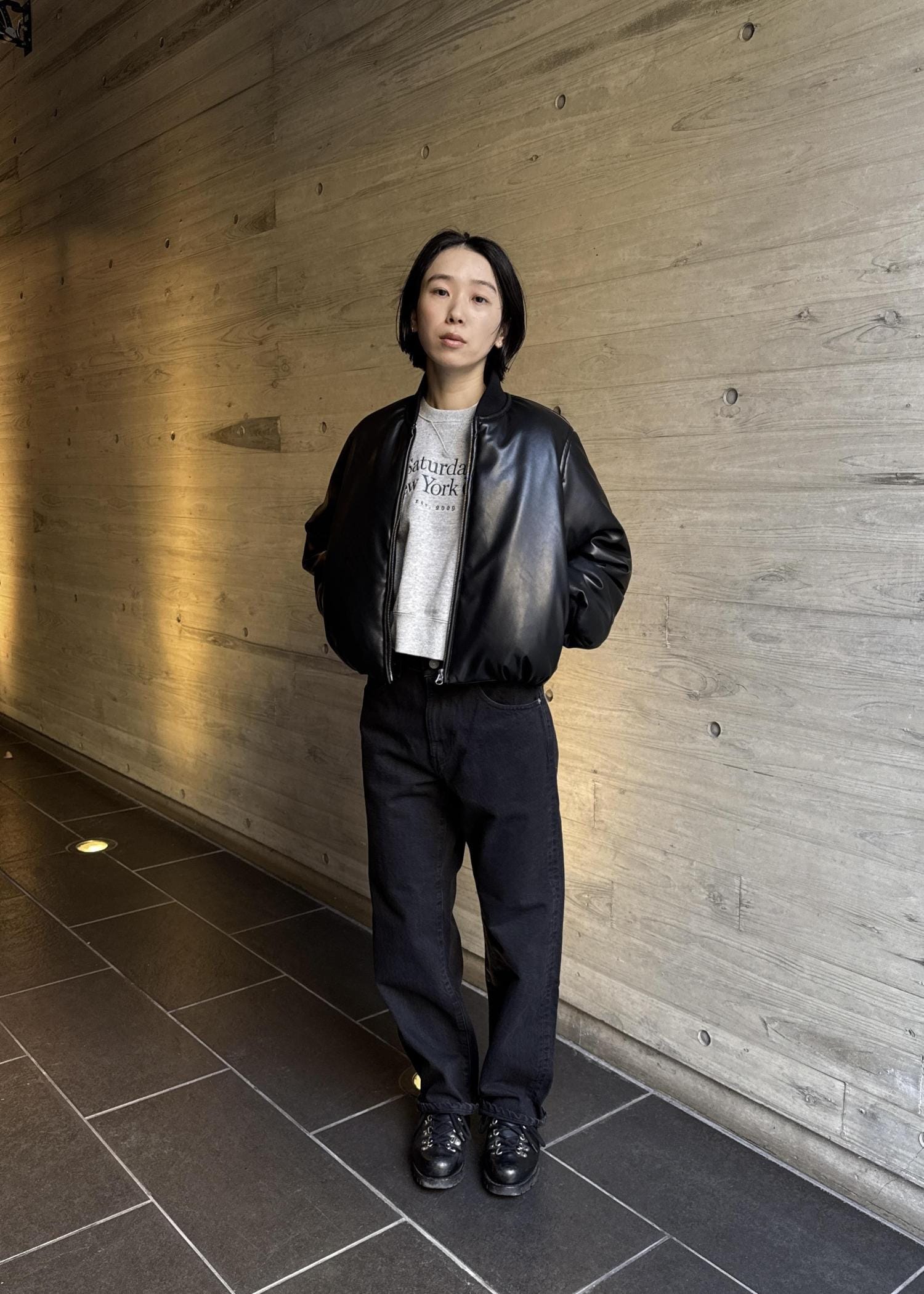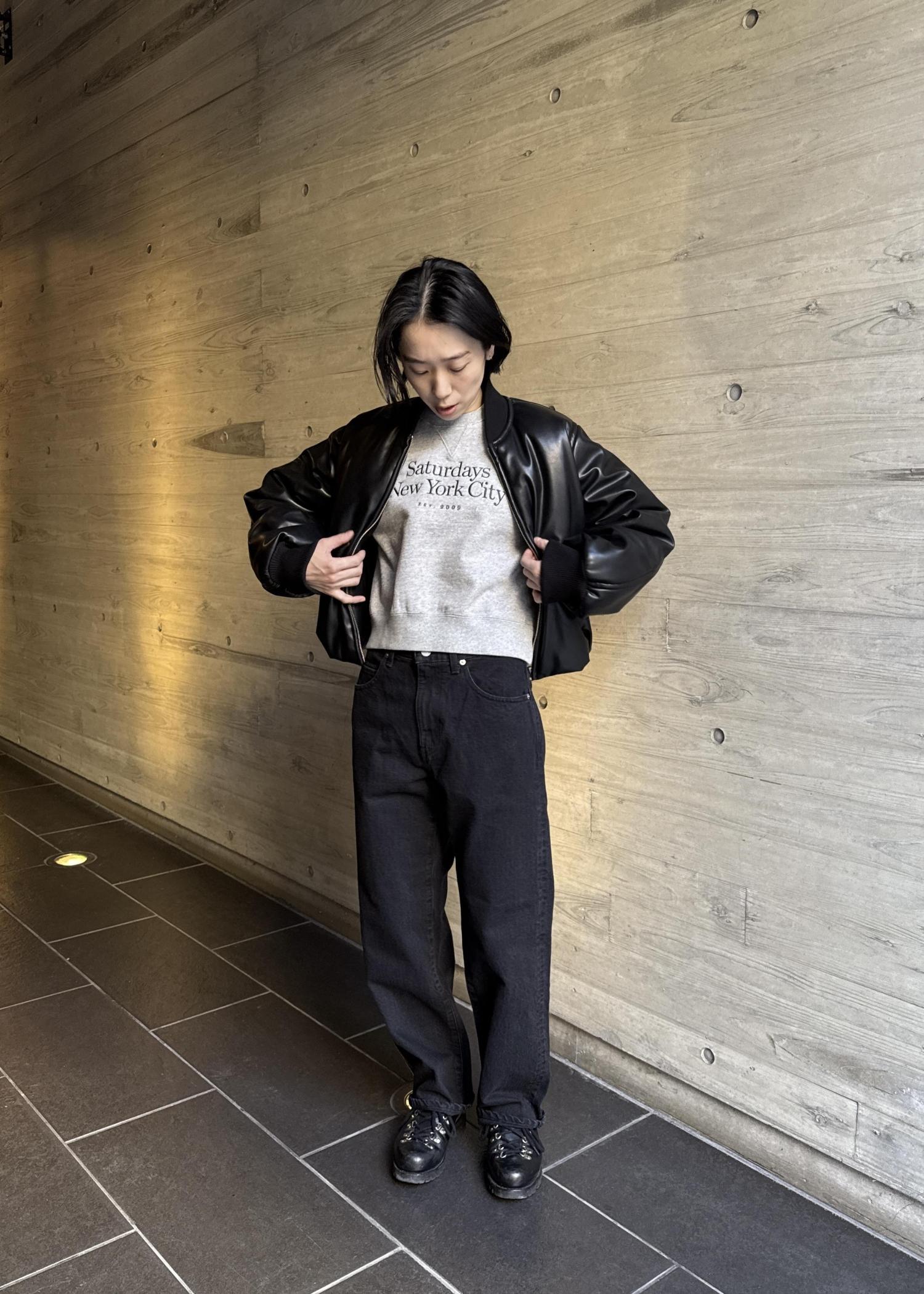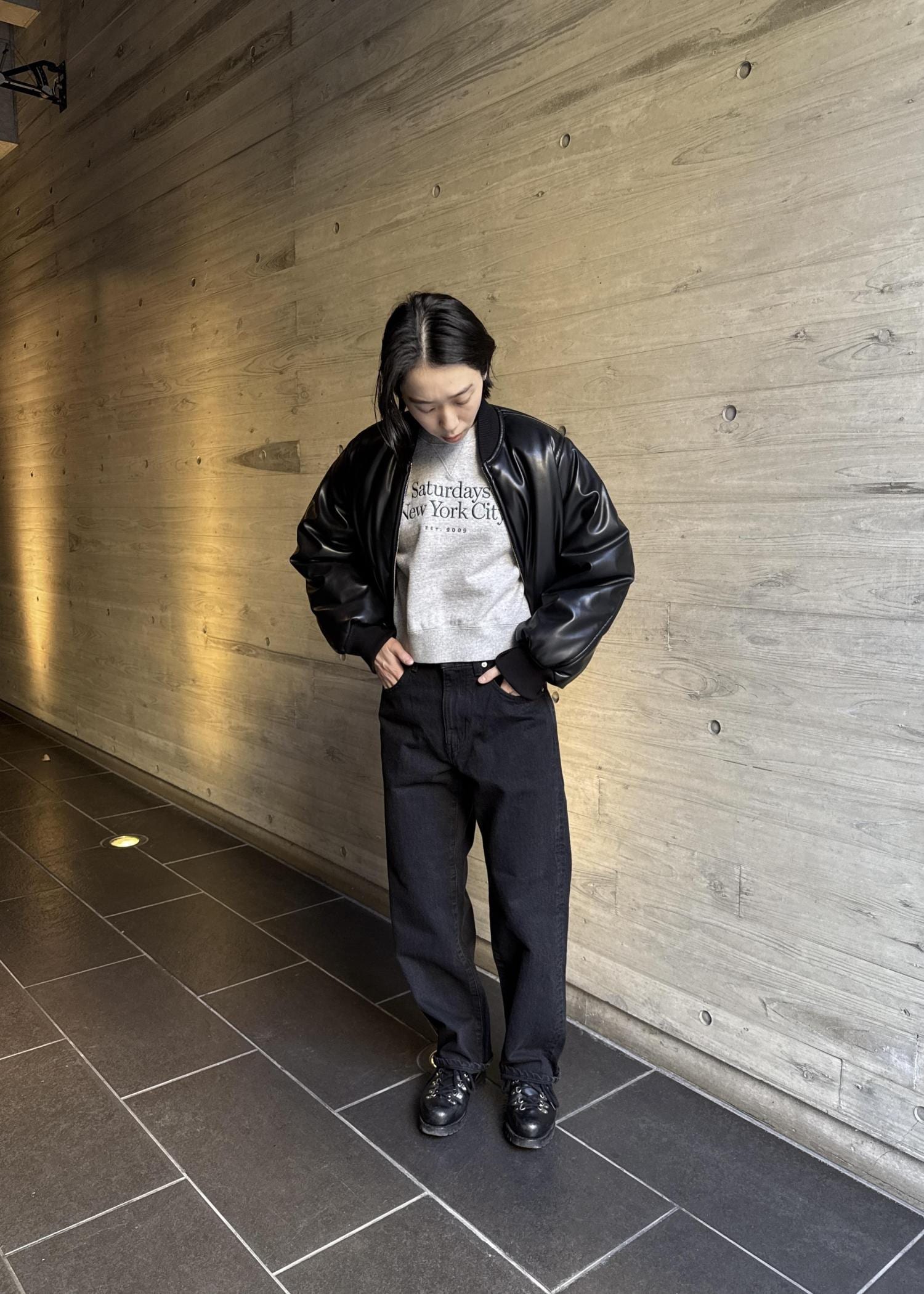 インナーのネップ柄スウェットとアウターどちらもショート丈で合わせてストリートですが、上品にまとめてます。