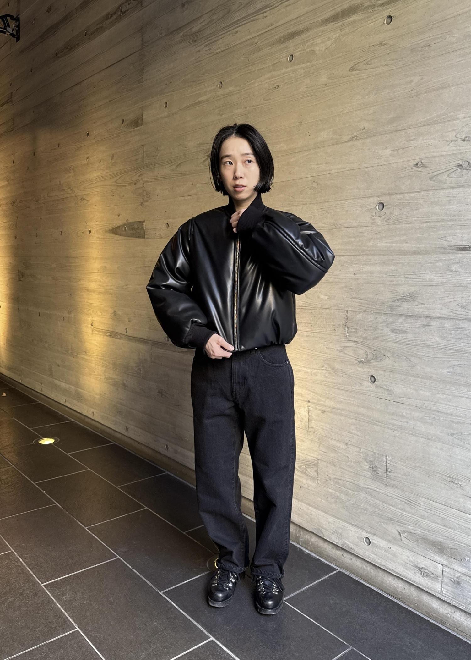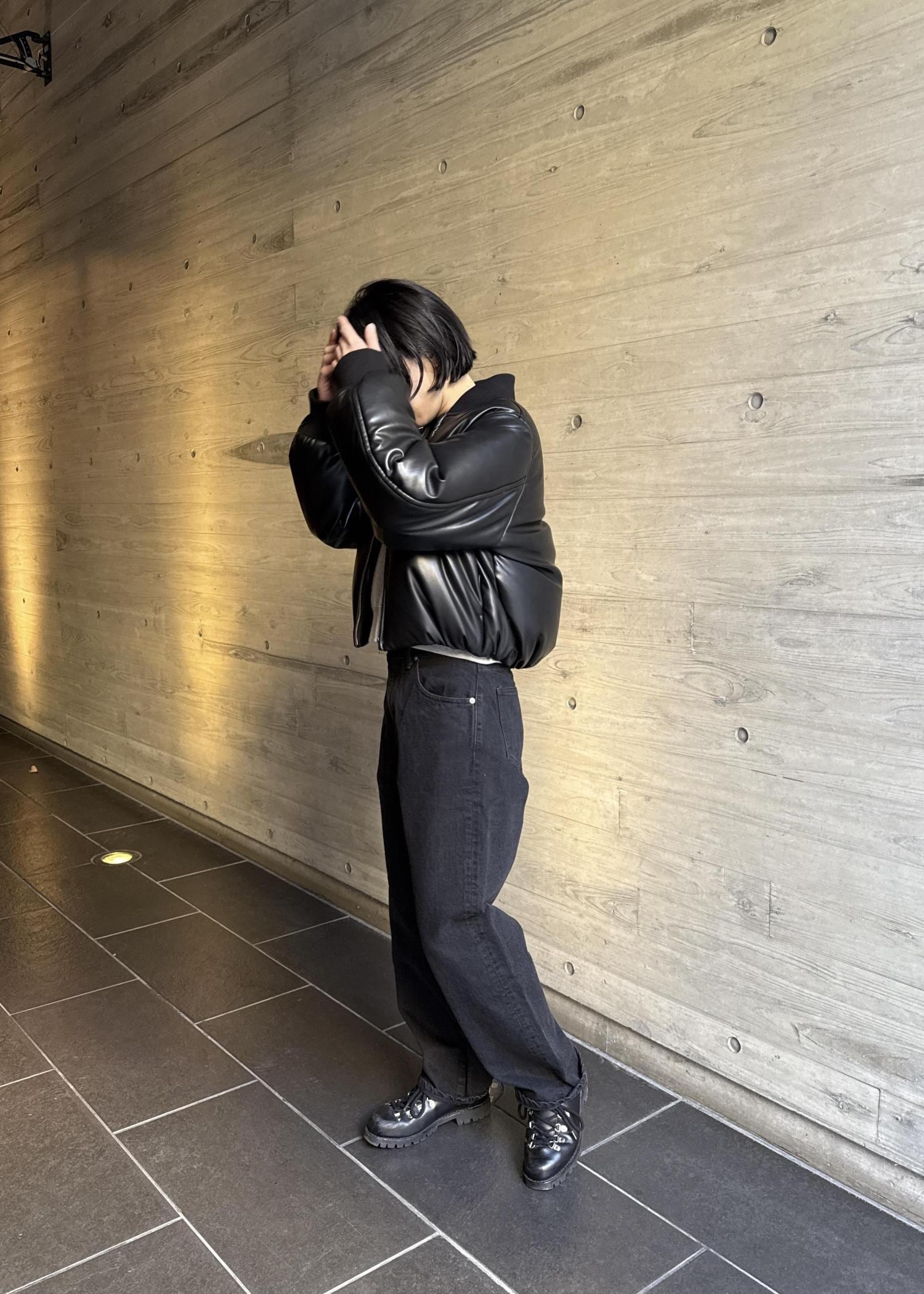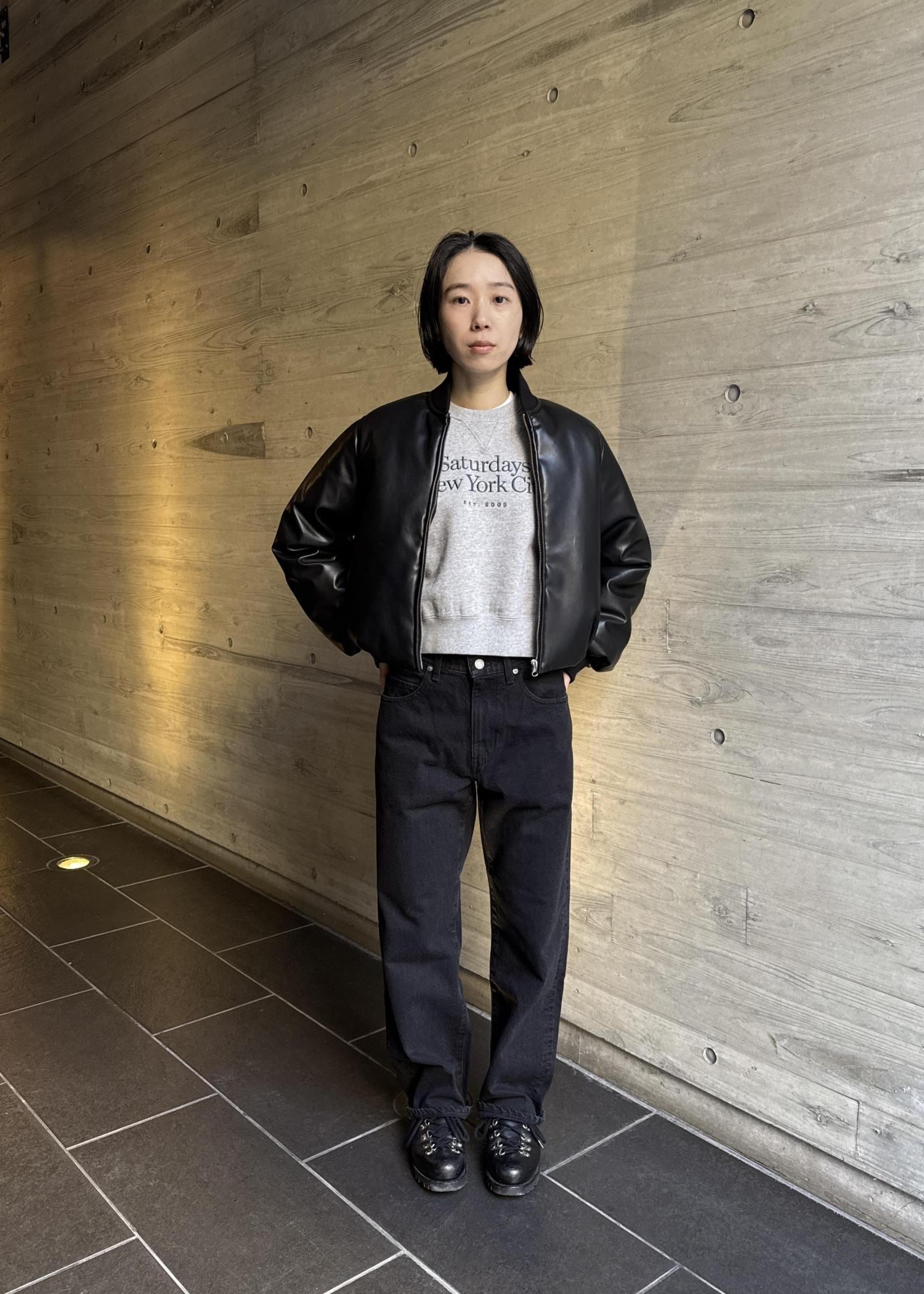 インナーのネップ柄スウェットとアウターどちらもショート丈で合わせてストリートですが、上品にまとめてます。