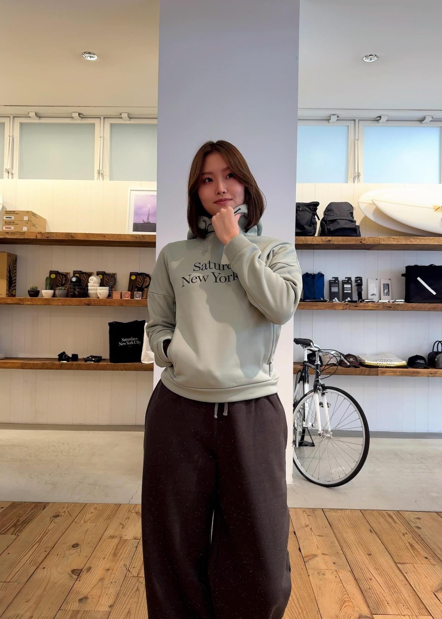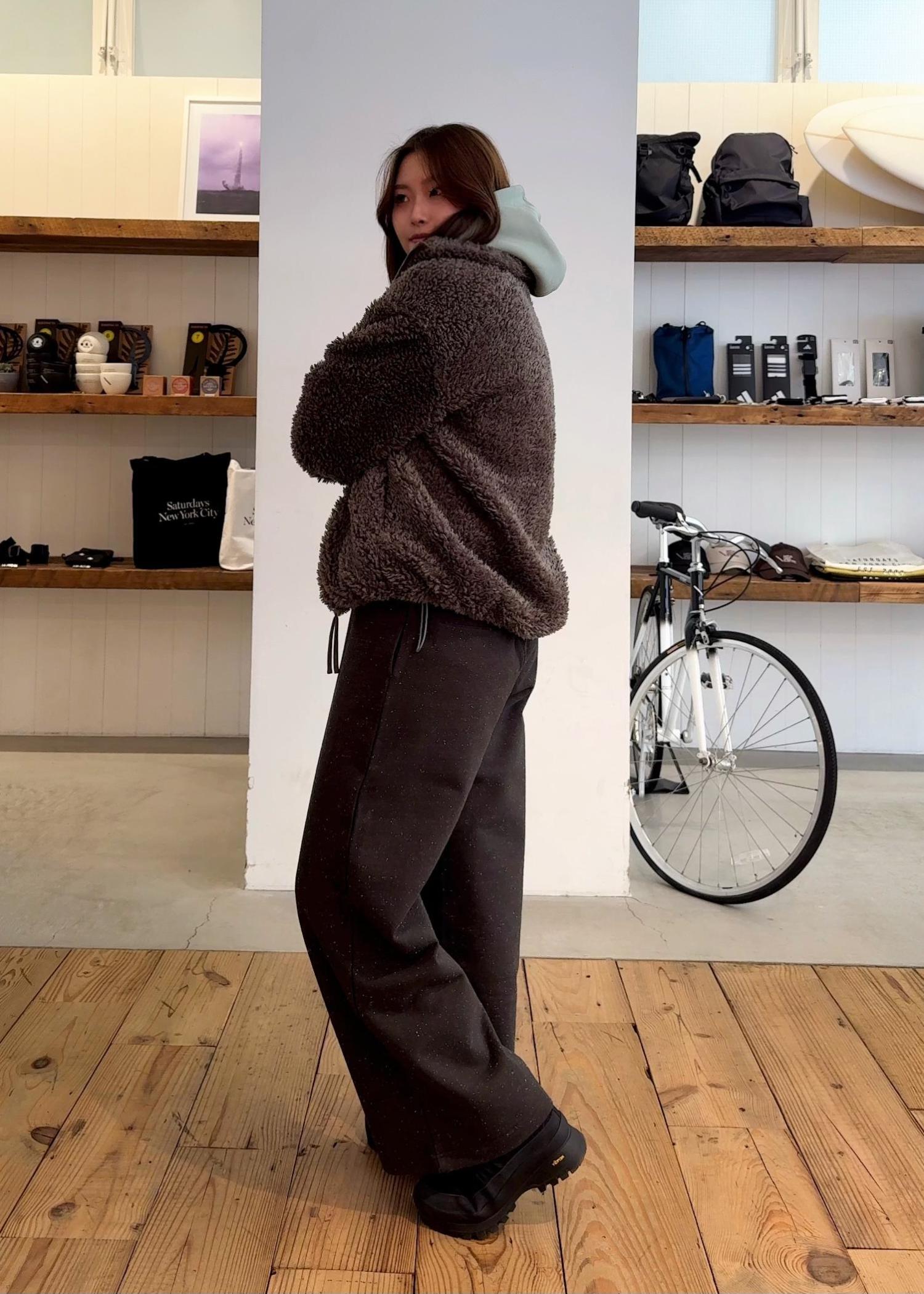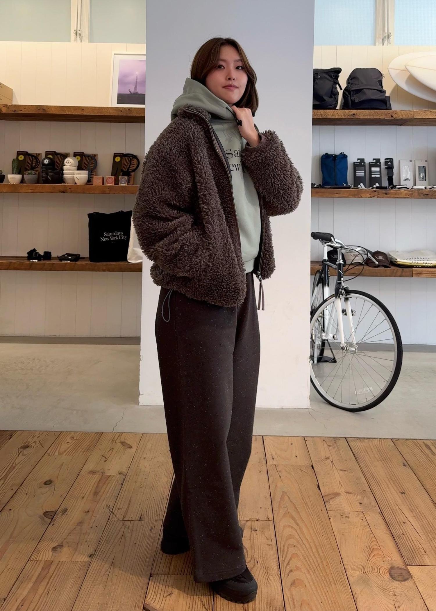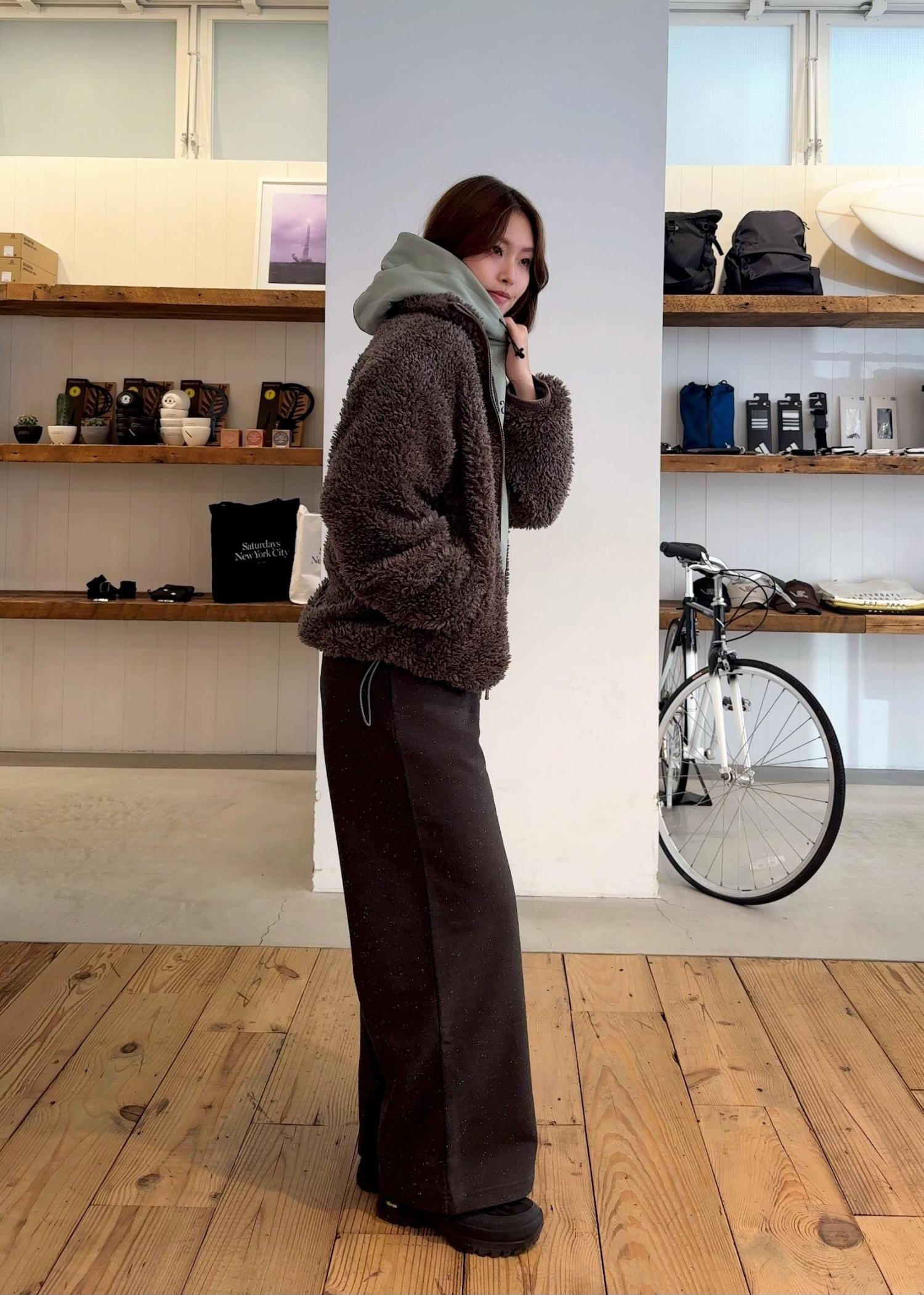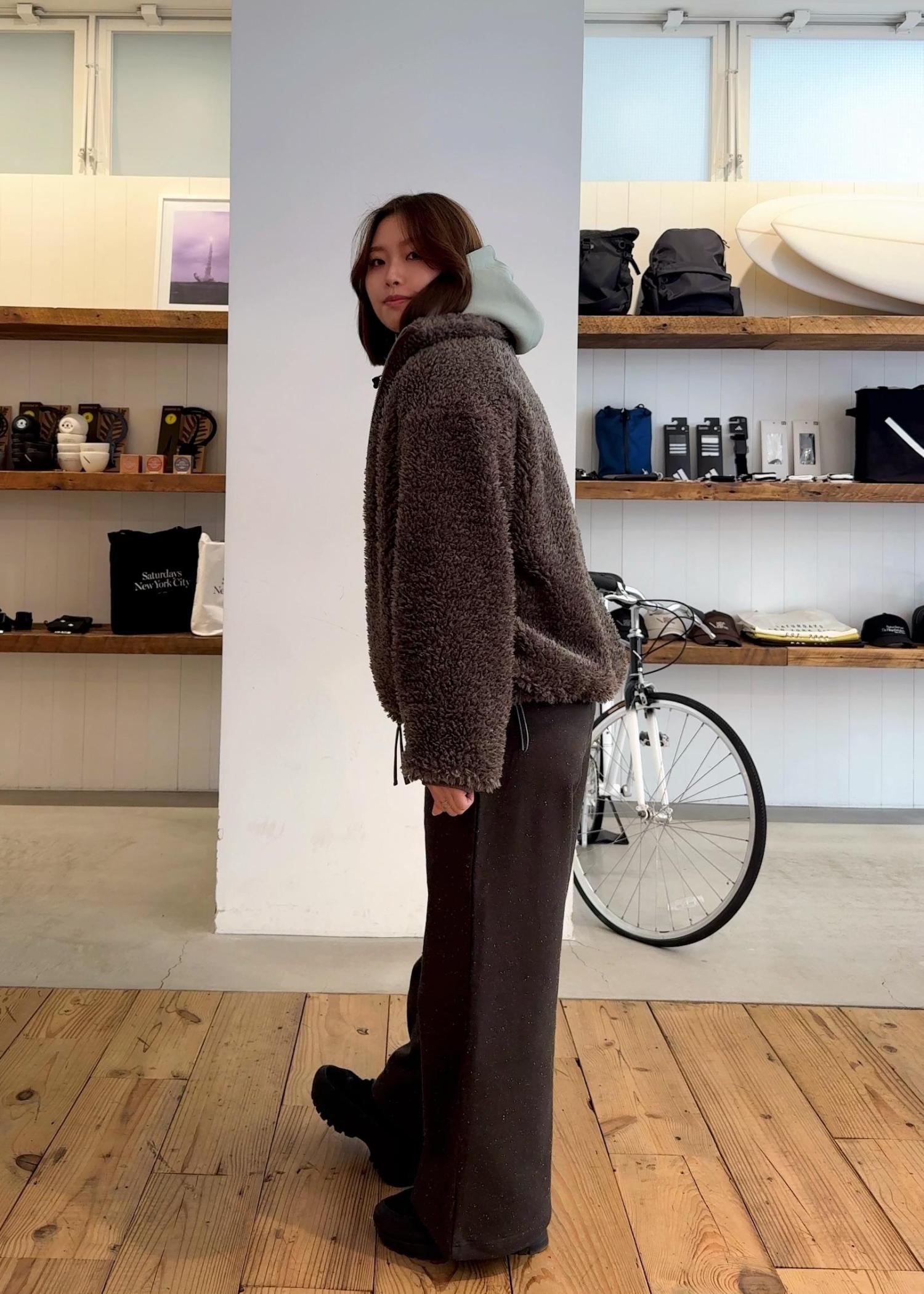 淡いミントのフーディに、深みのあるブラウンを重ねた冬のリラックススタイル。ボアアウターでぬくもりをプラスして防寒対策も抜群。