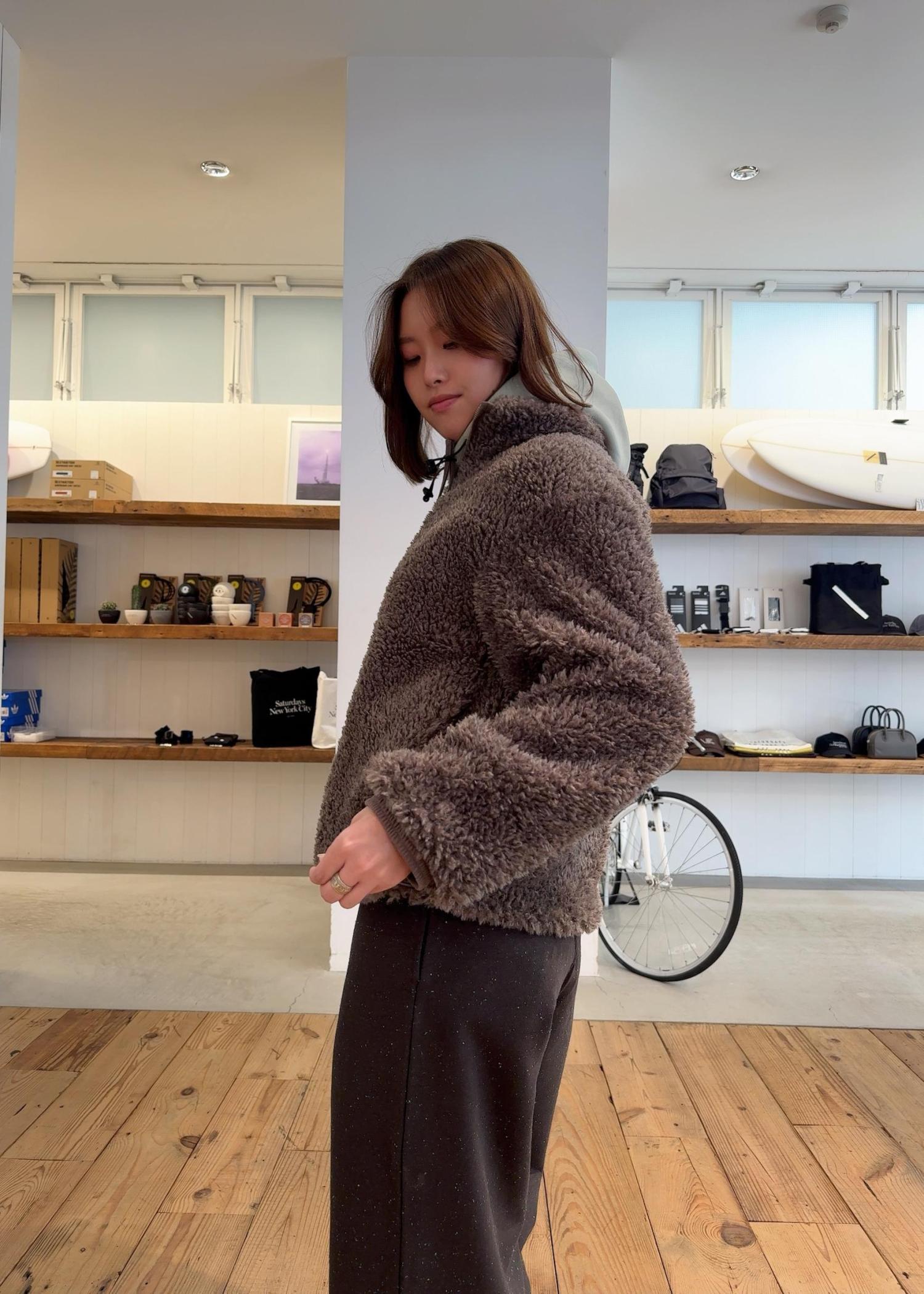 ふんわりしたボアのアウター、女性らしさも出て、冬の軽アウターとして万能◎お尻まで隠れるシルエットで、サイドも絞れるので、シルエットの変更も可能です! -