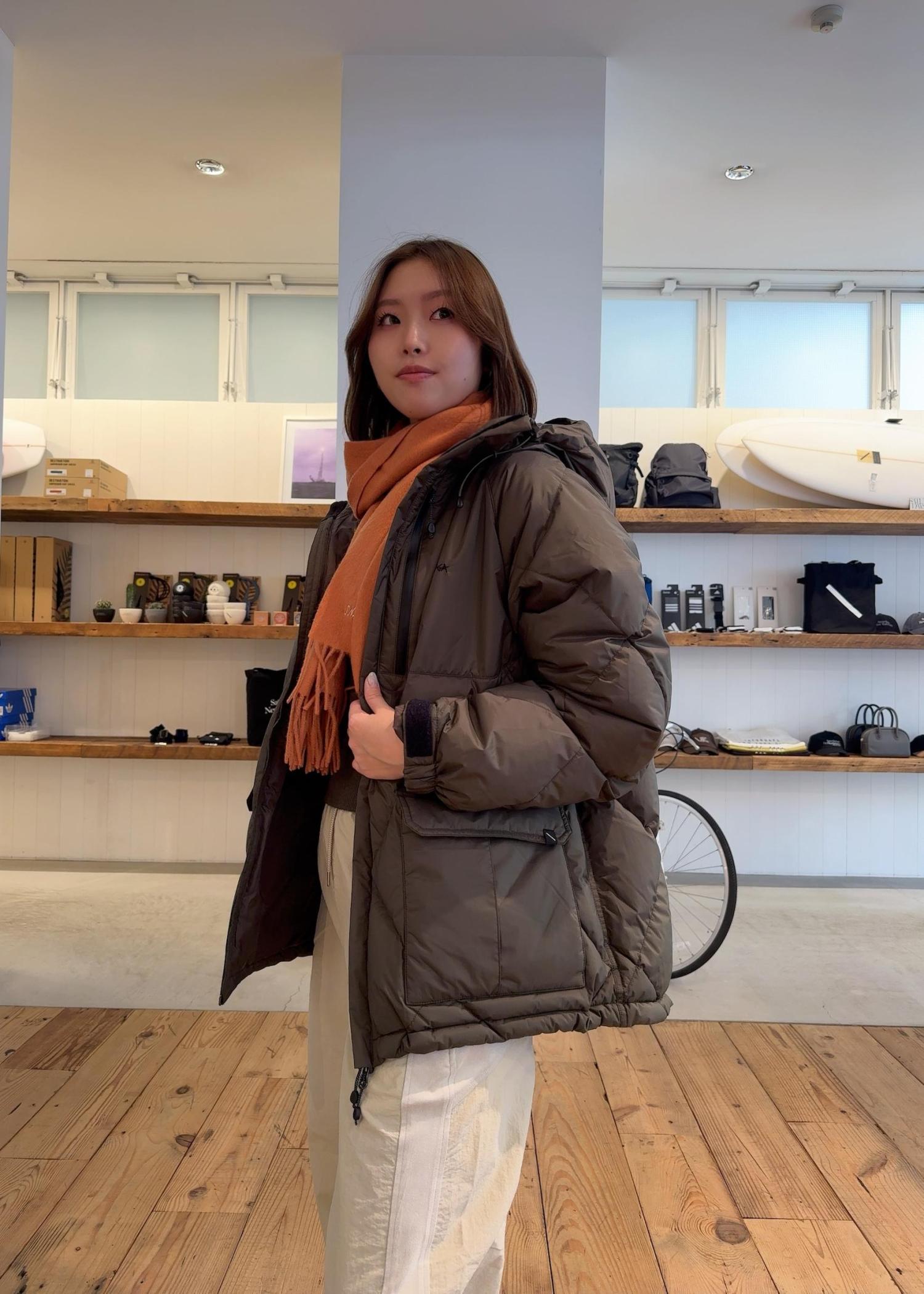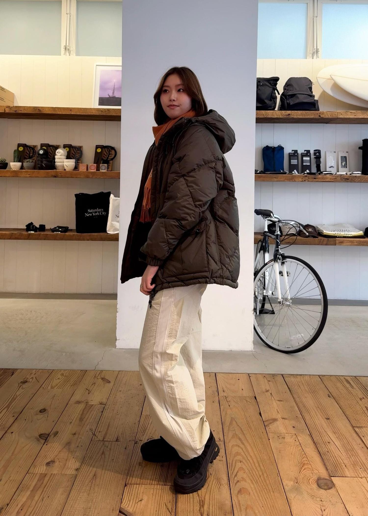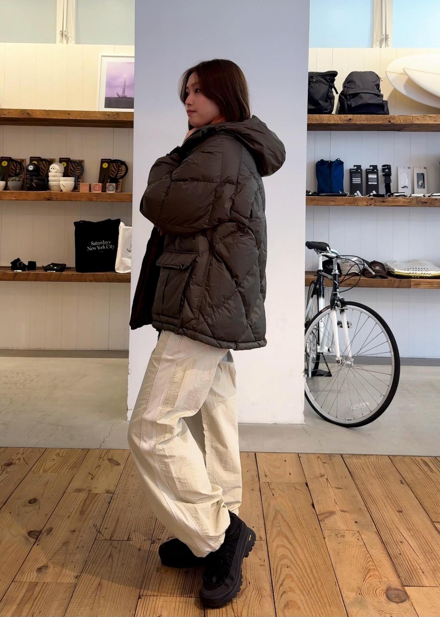 NANGA × Saturdays NYC のダウンを主役にした、都会的アウトドアスタイル。深みカーキのダウンが冬の存在感を与えつつ、軽量でストレスフリーな着心地が魅力。