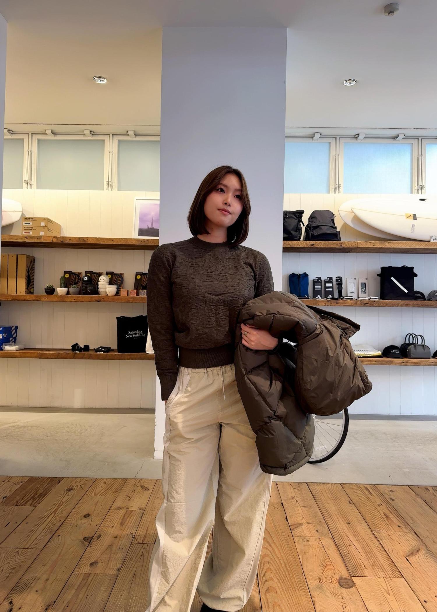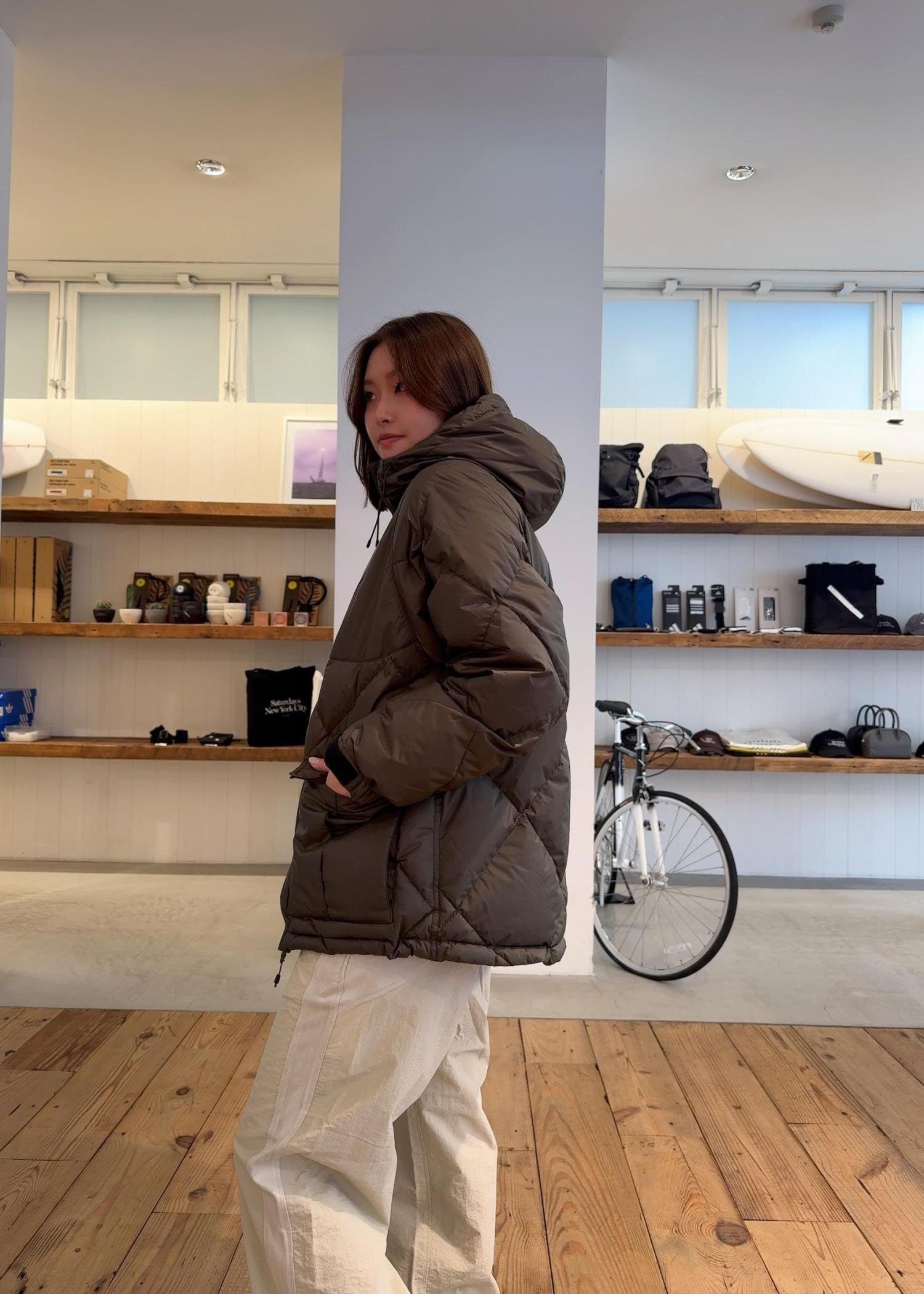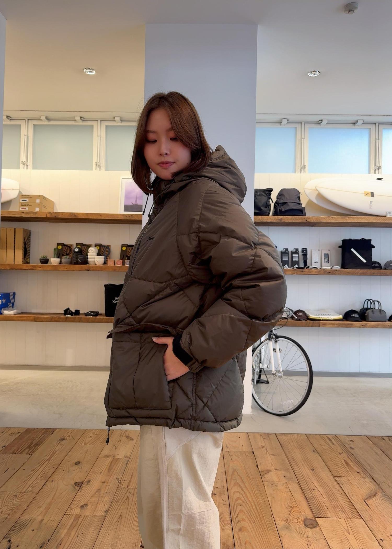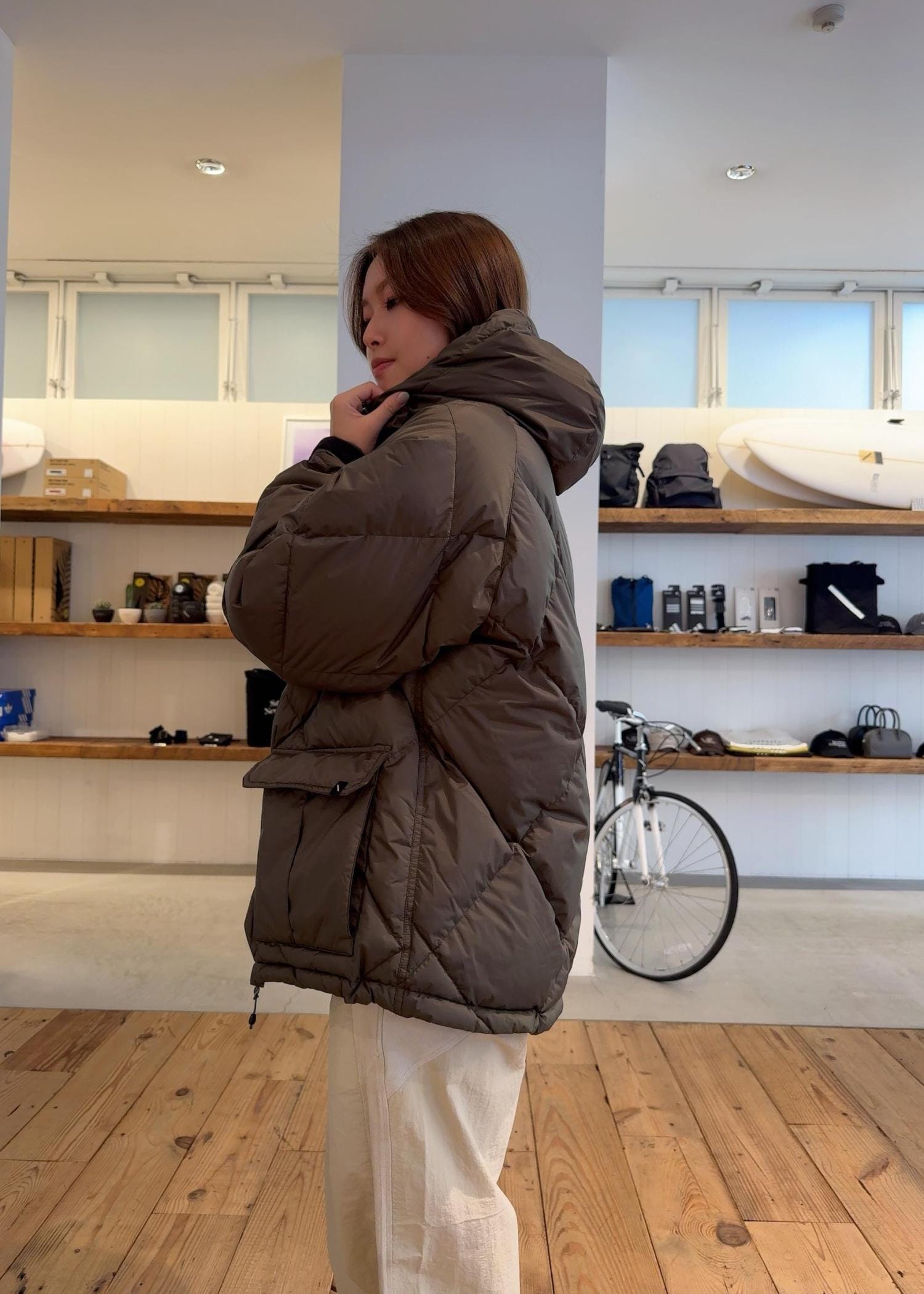 NANGA × Saturdays NYC のダウンを主役にした、都会的アウトドアスタイル。深みカーキのダウンが冬の存在感を与えつつ、軽量でストレスフリーな着心地が魅力。