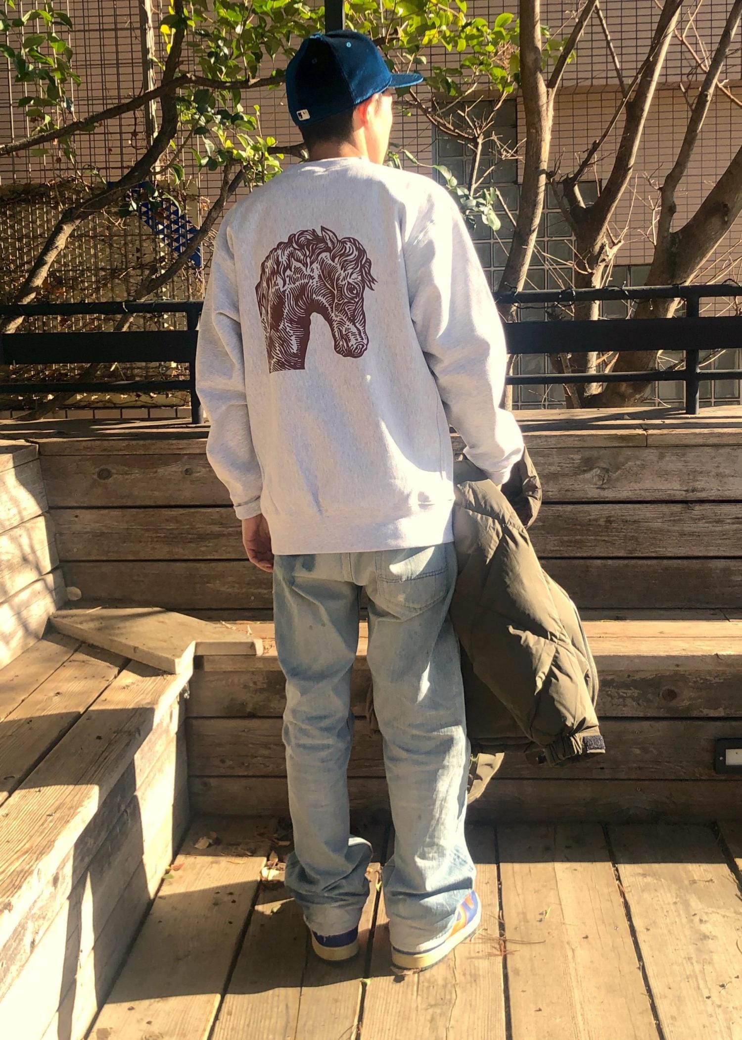 インナーのクルーネックは、巨匠NUTS ART WORKSによる来年の干支の馬がバックプリント。