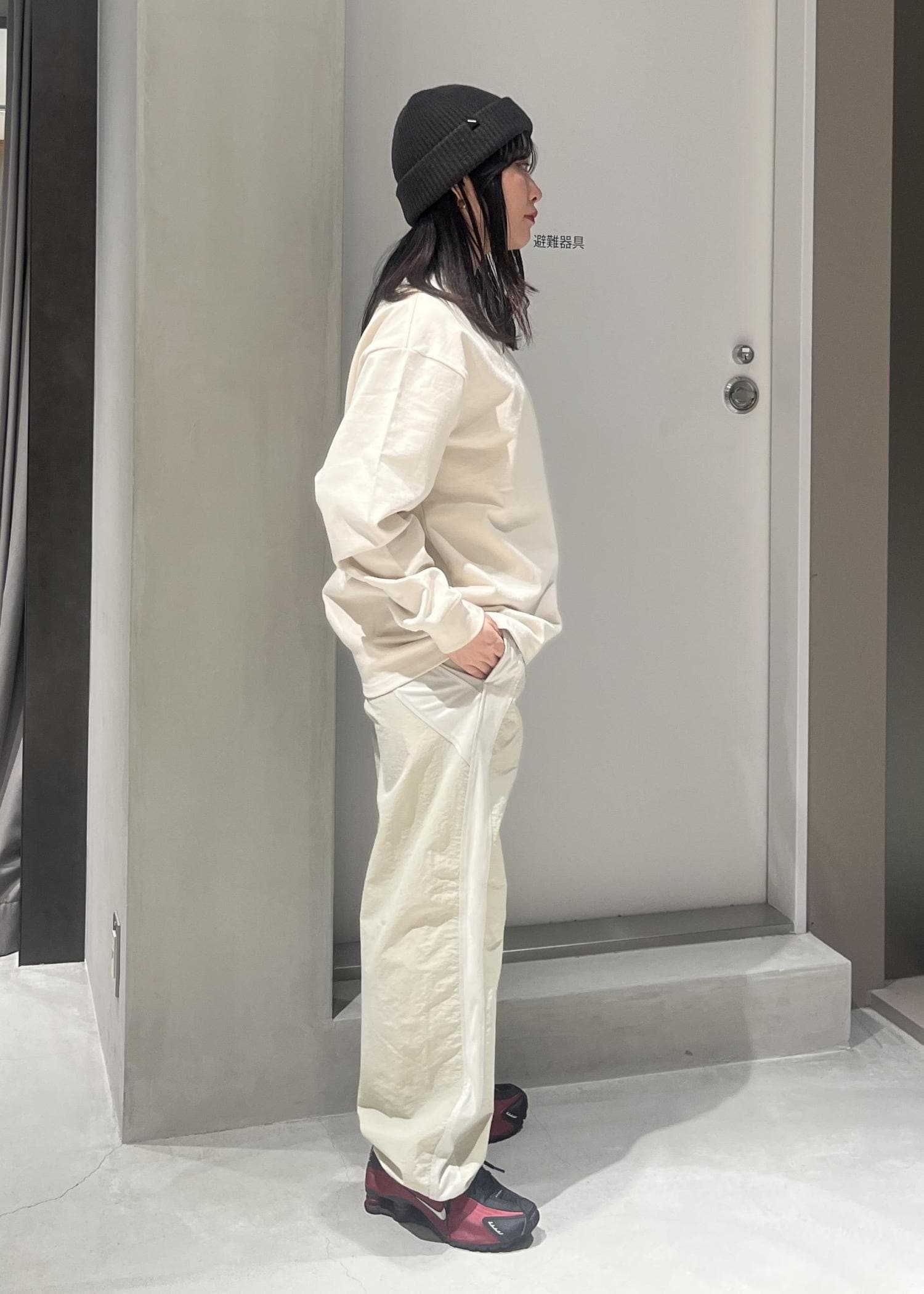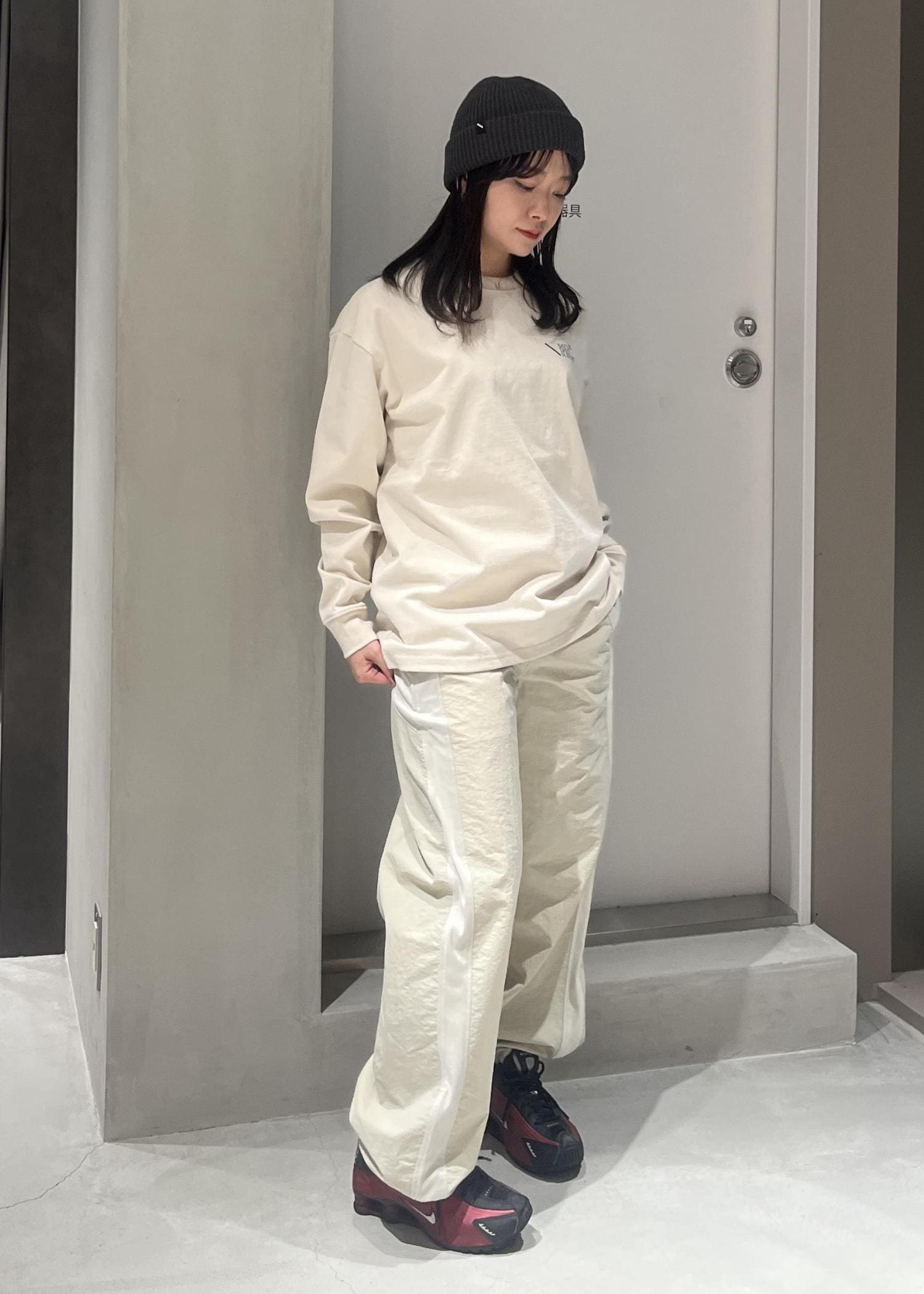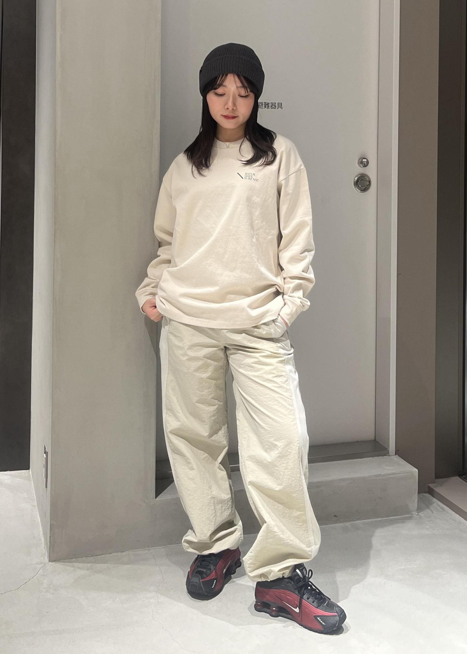 同色のナイロンパンツを合わせてオールホワイトで、素材感でバランスを取るスタイリングがお気に入り!