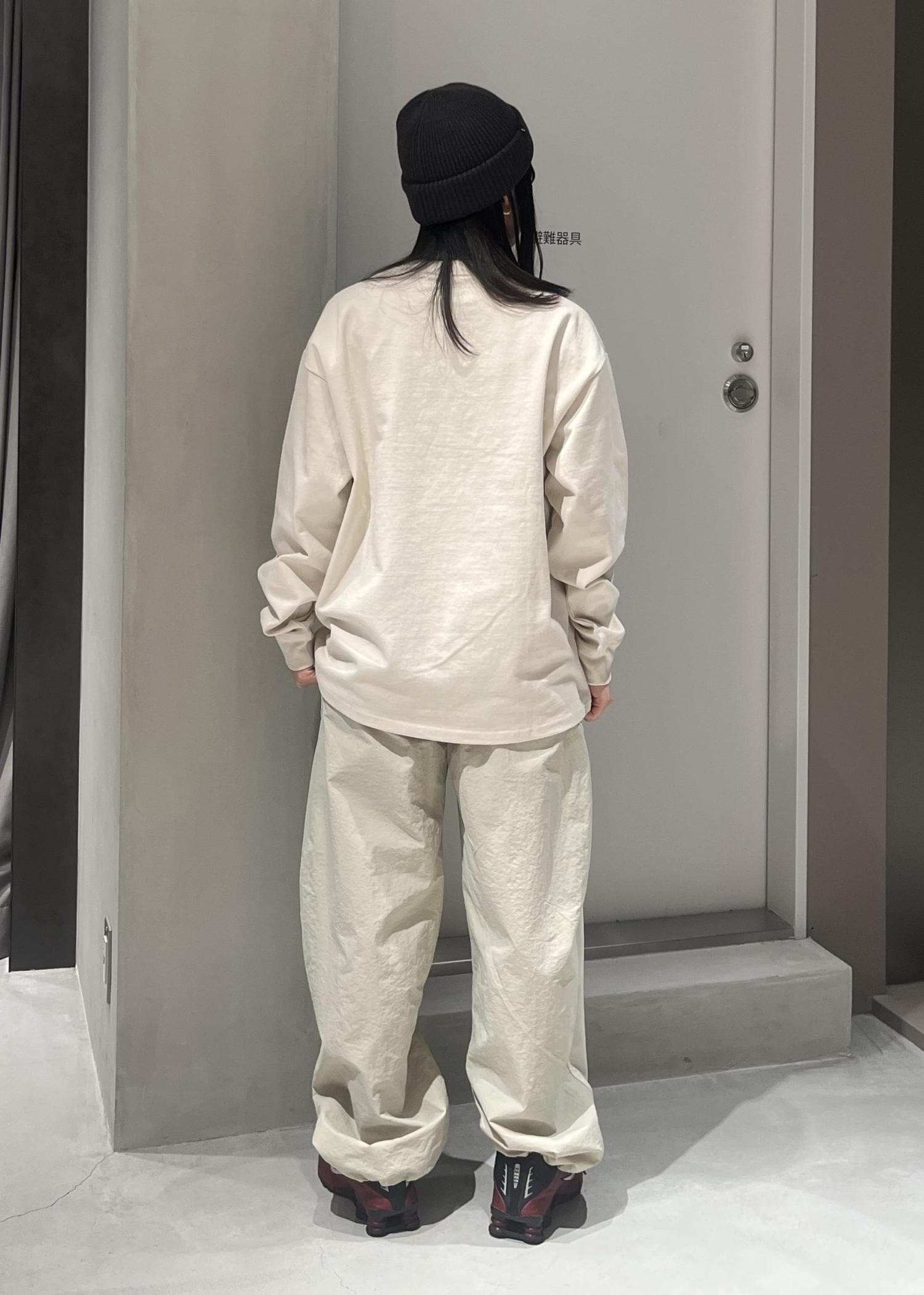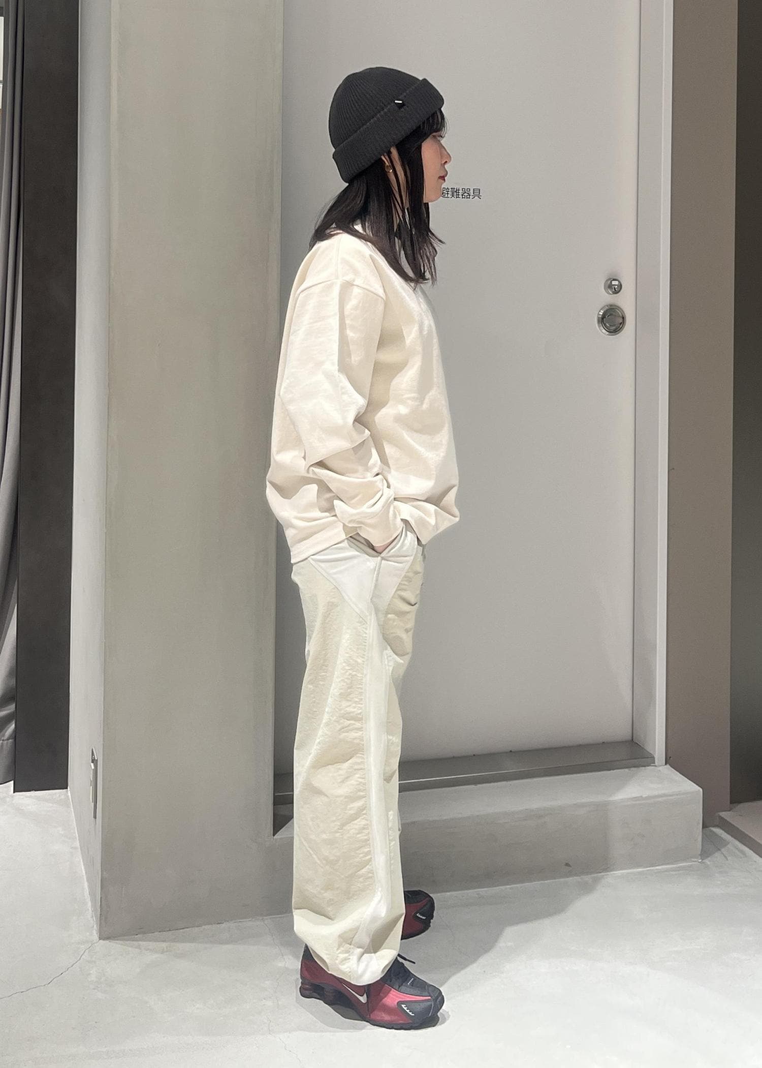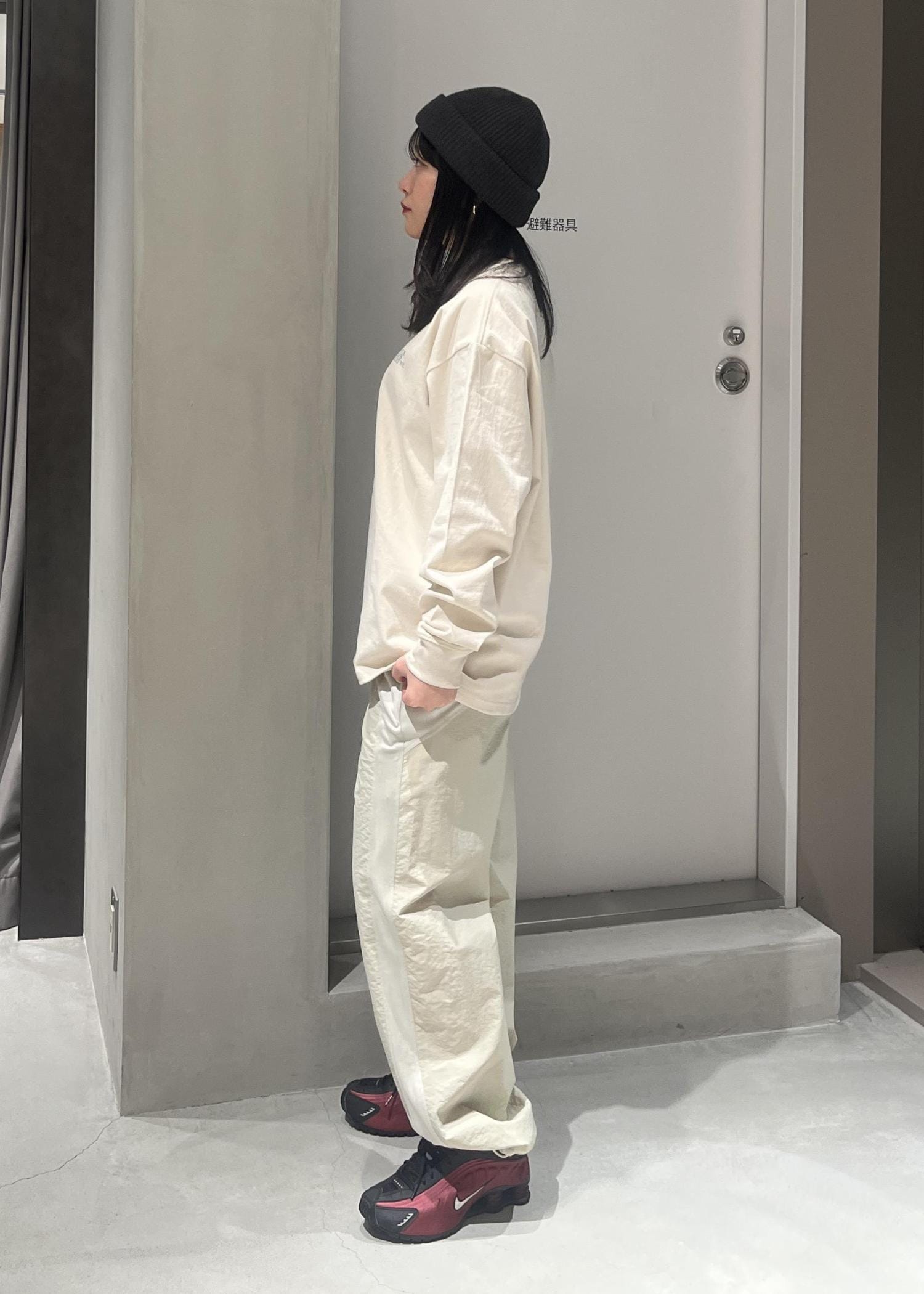 同色のナイロンパンツを合わせてオールホワイトで、素材感でバランスを取るスタイリングがお気に入り!