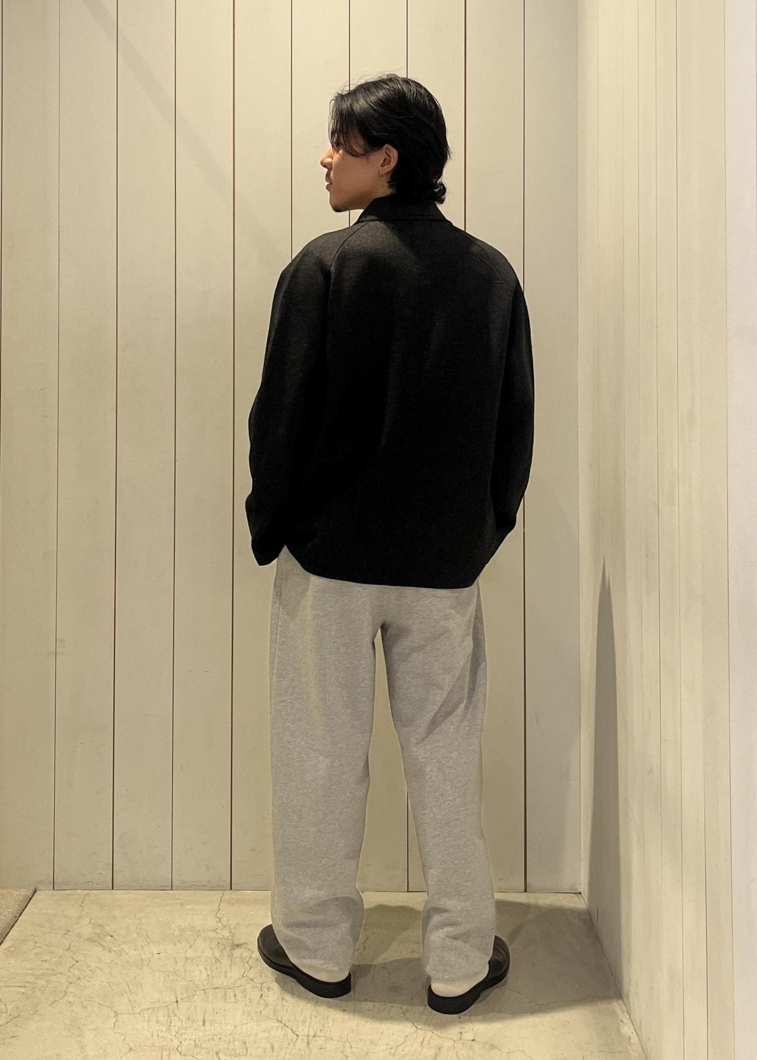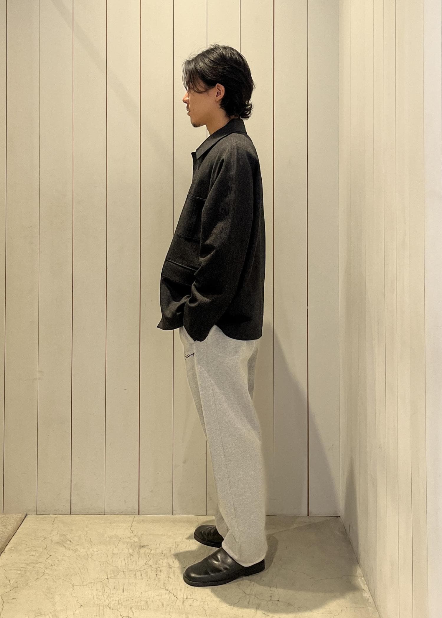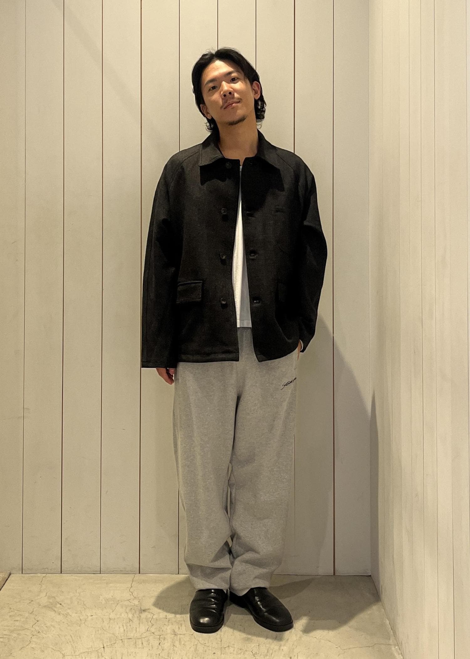ジャケットの落ち着いた表情と、グレーのスウェットパンツの抜け感が好バランス!