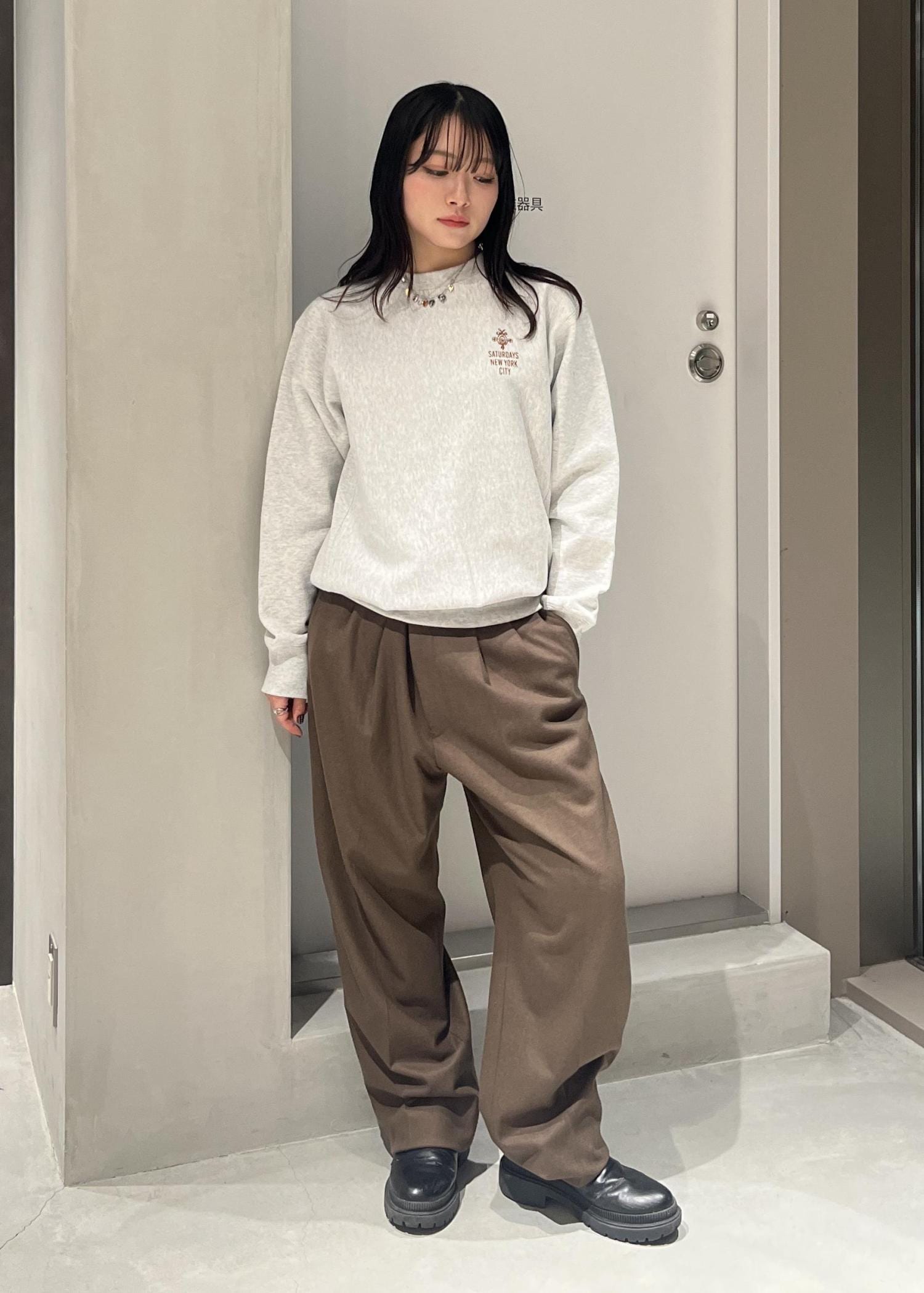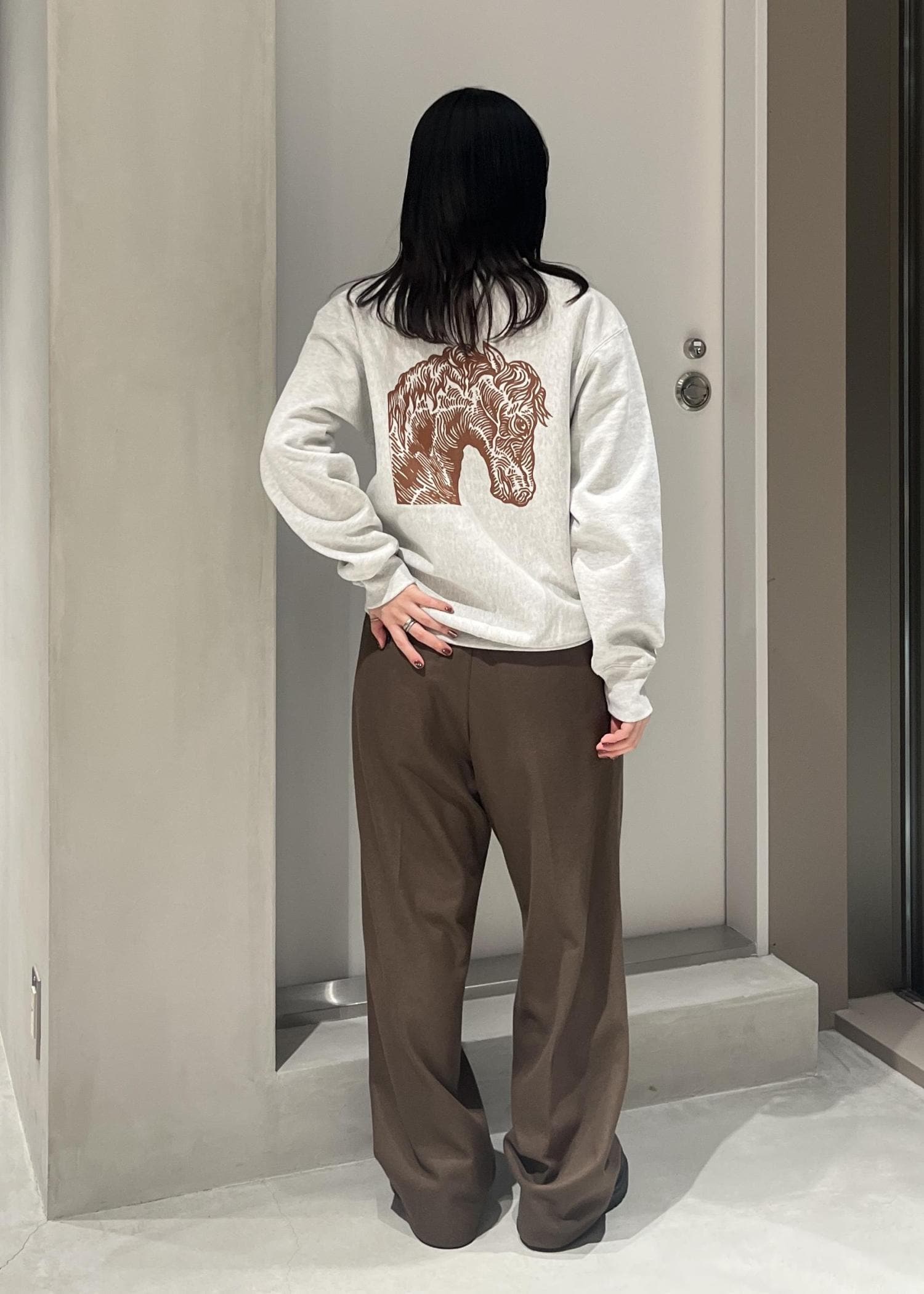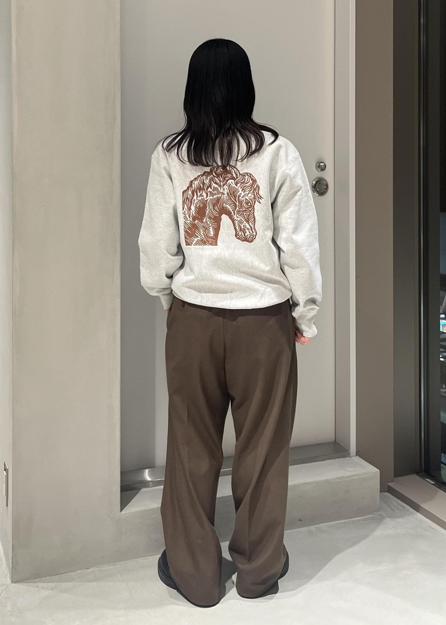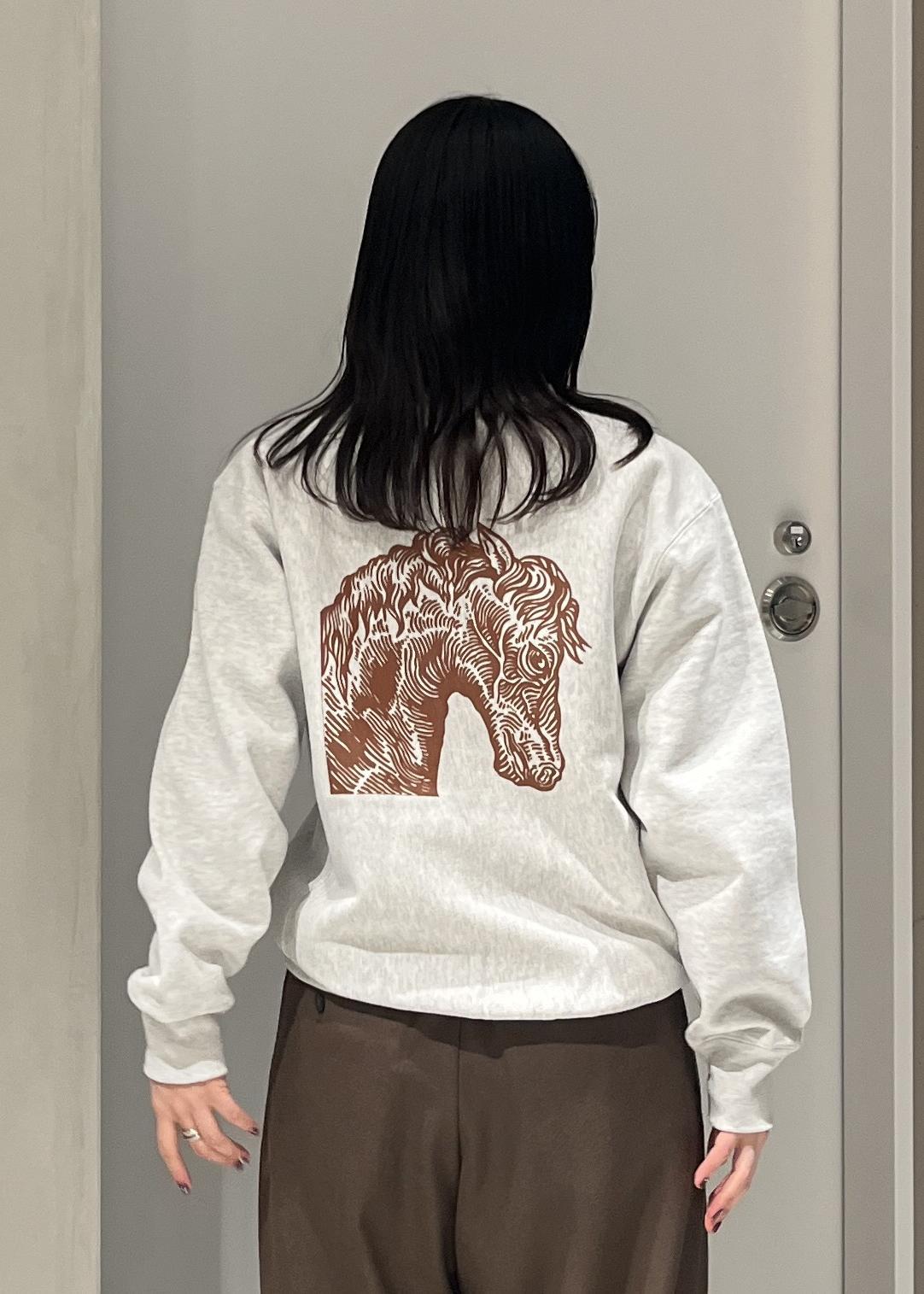 着用しているスウェットは NUTS ART WORKS × Saturdays NYCのアイテムで、代官山店にて来年の干支である「馬」のモチーフをハンドペイントした時のデザインがバックにプリントしてあります!
