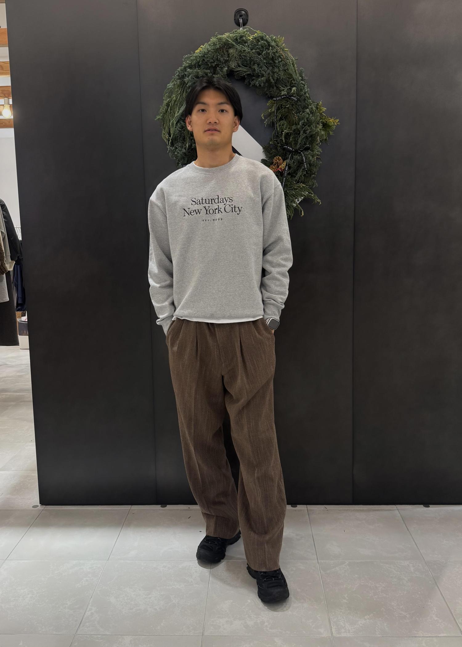 本日ご紹介させていただくのは、saturdays定番のブランドロゴが印象的なグレースウェットを主役に、落ち感のあるブラウンのワイドスラックスを合わせたスタイリング。