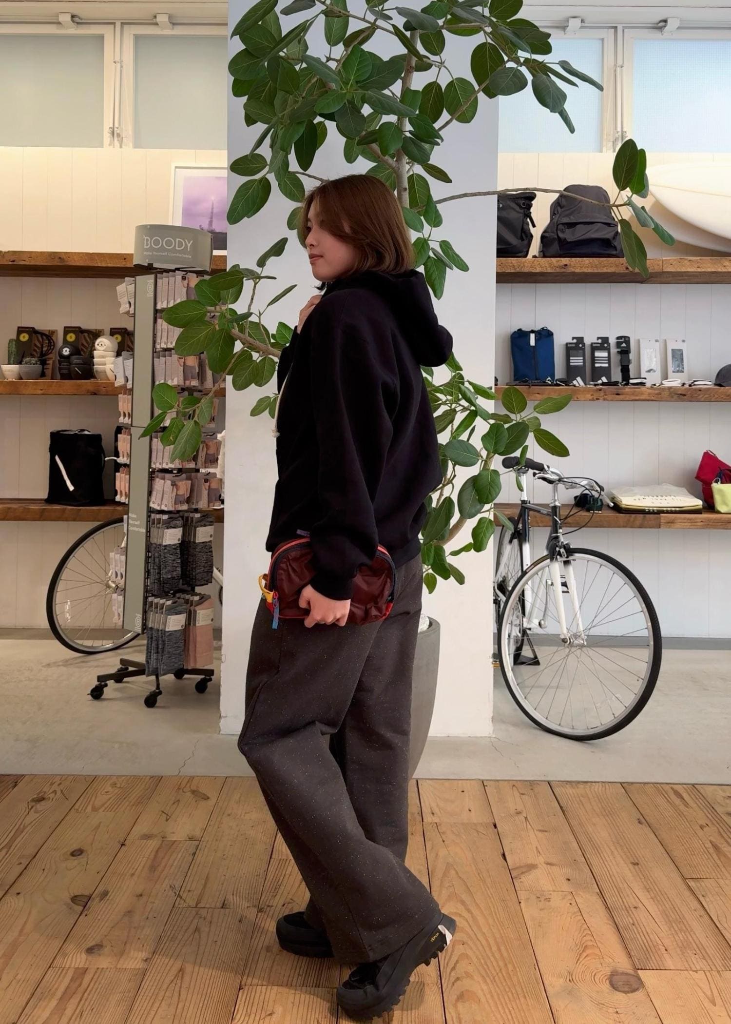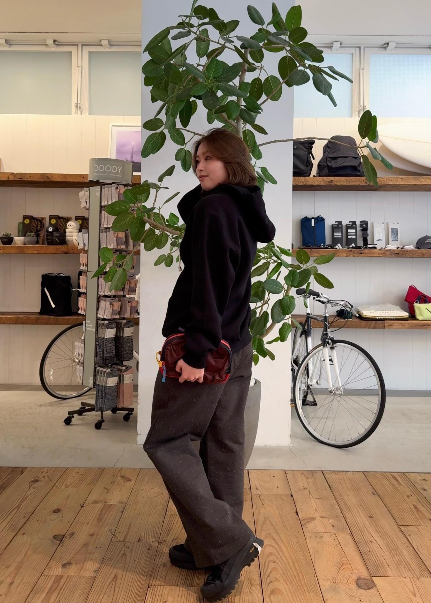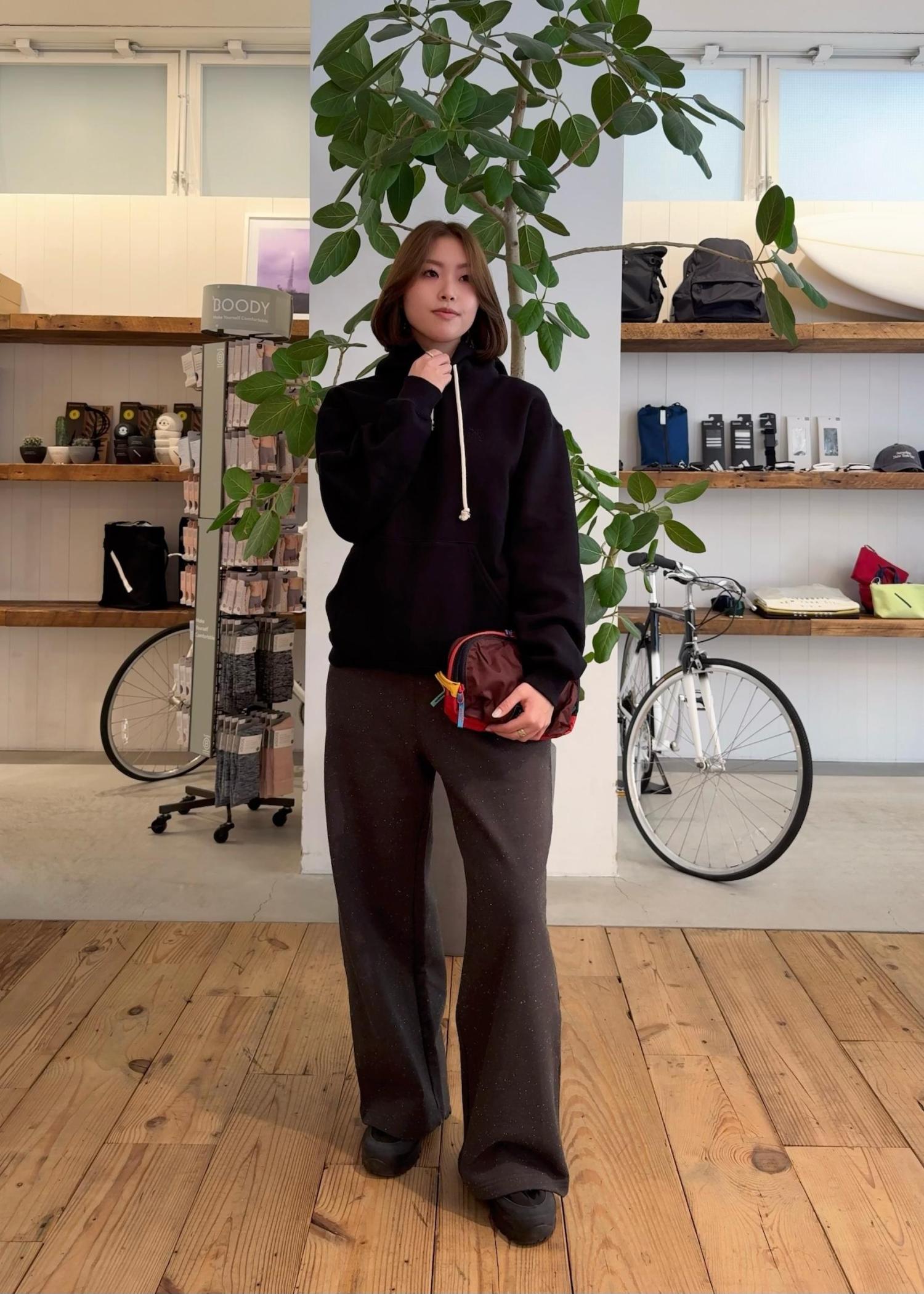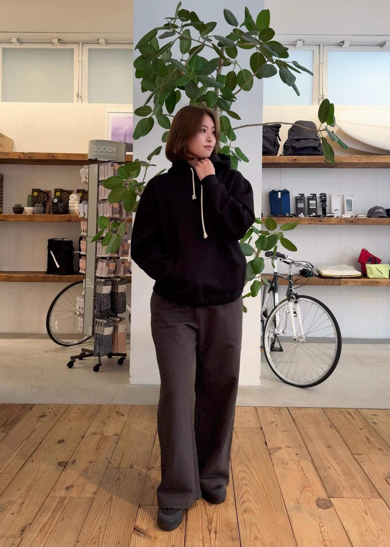 ブラックのホリデー限定のフーディに、落ち着いた配色でまとめた、リラックスしたい日にぴったりのスタイリング。