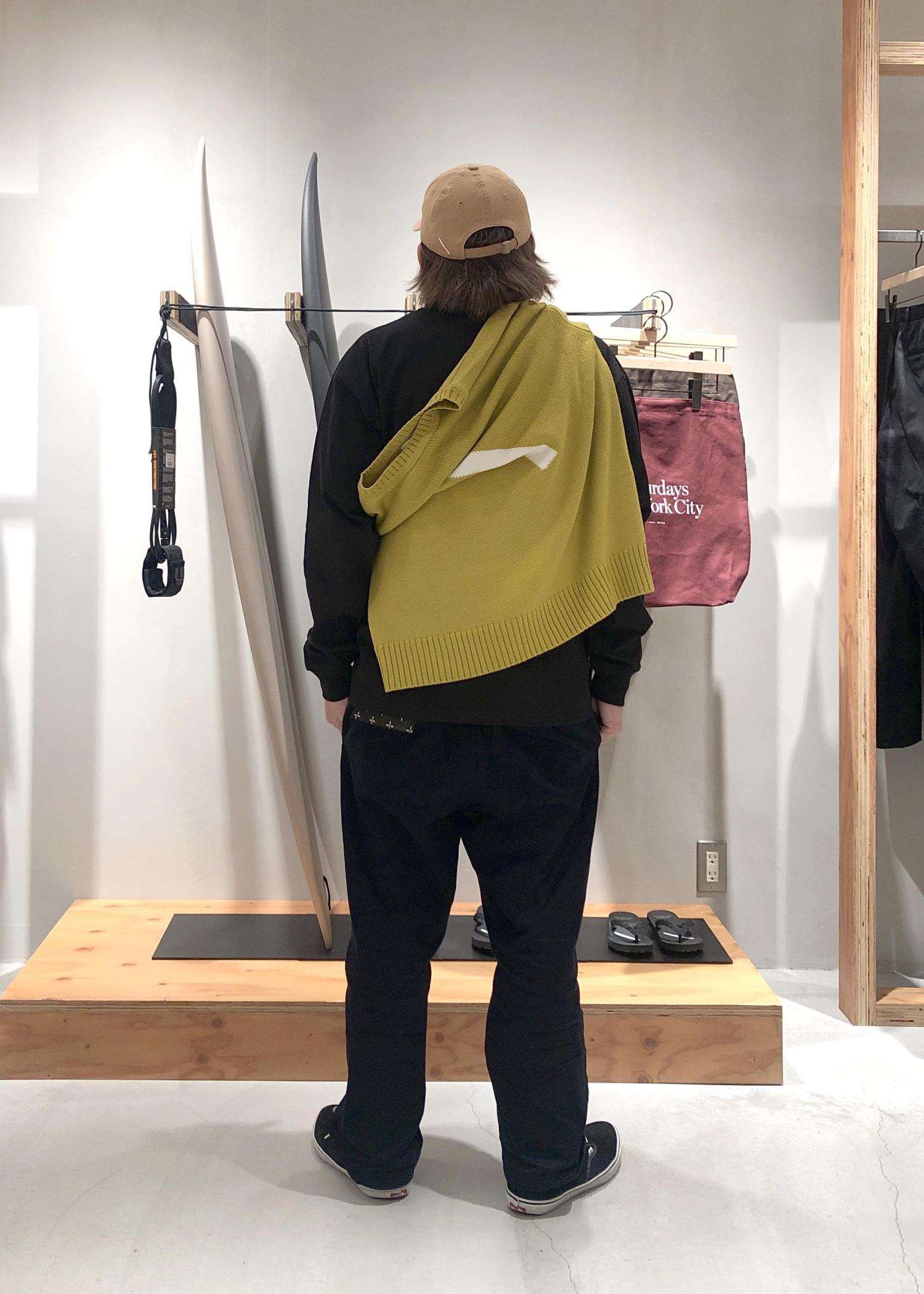 さらに肌寒い時は、肩から掛けてるSATURDAYS NYCのスラッシュロゴをフロントにインターシャで表現したミドルゲージのクルーネックセーターです。