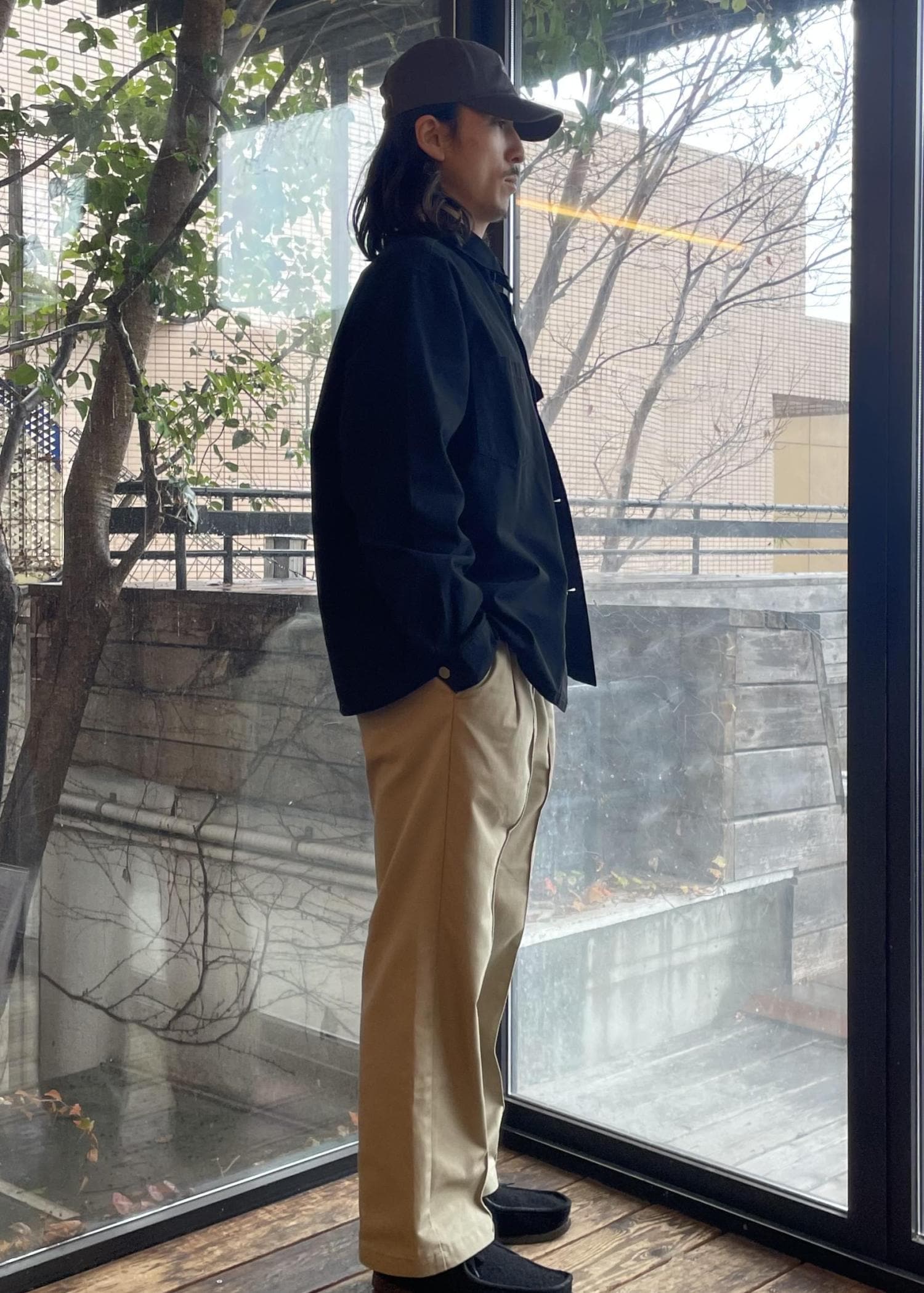トップスは、ワークシャツのようなデザインで、カバーオールとシャツがミックスしたアウターでも使えるアイテム!